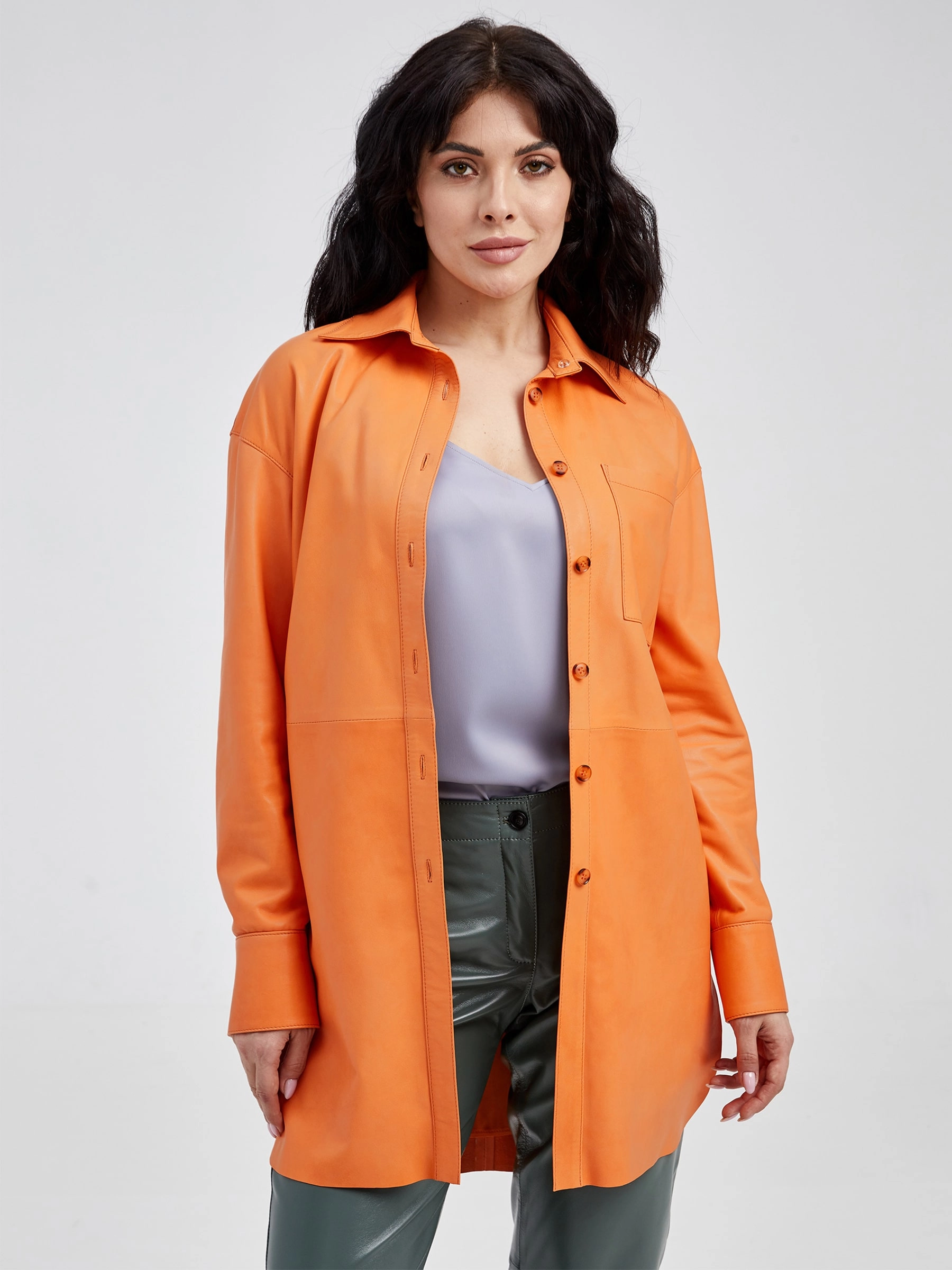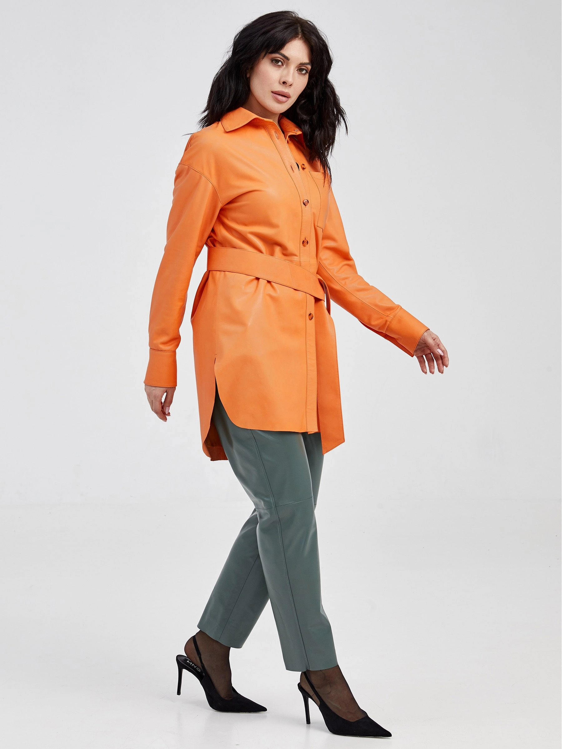 Товар кожаный костюм женский: рубашка 01_3 + брюки 03, оранжевый/оливковый, р. 46, арт. 111118. Рассчитан на сезон: весна-лето.