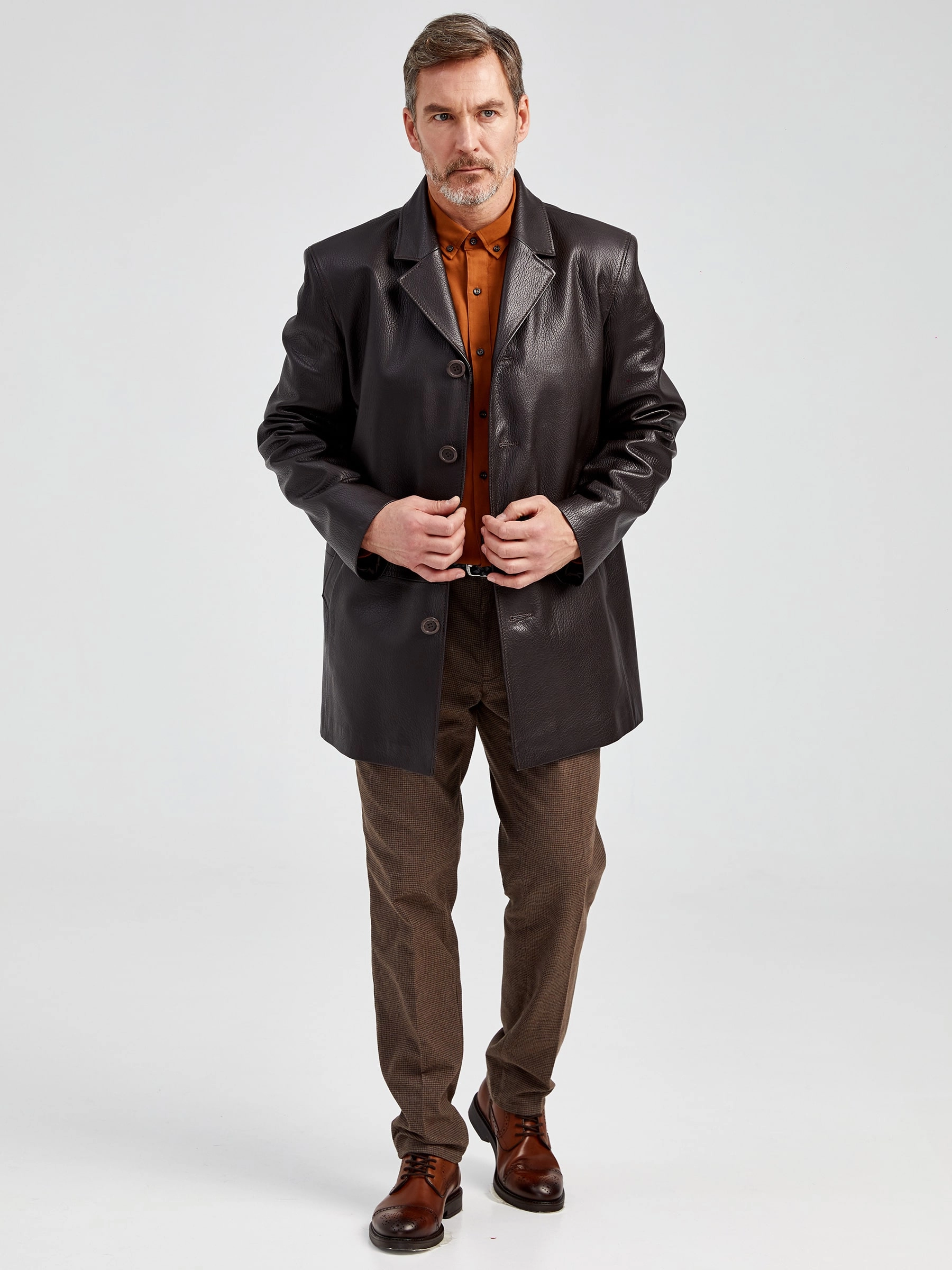 Мужской пиджак в современном исполнении. Черная кожа особой выделки. Прекрасное сочетание как с джинсами, так и с классическим костюмом. Модель комфортно садится по фигуре поверх пиджака. Прямой силуэт. Английский воротник. Рукав втачной двухшовный. Ширина рукавов и специальное построение плечевого пояса, обеспечивают комфортную посадку на любой тип фигур. Широкий усиленный подборт предотвращает деформацию. Эргономичные усиленные листочки наружных карманов. Предусмотрены внутренние застёгивающиеся карманы для документов. Особая обработка петель под пуговицы предотвращает их изнашивание.