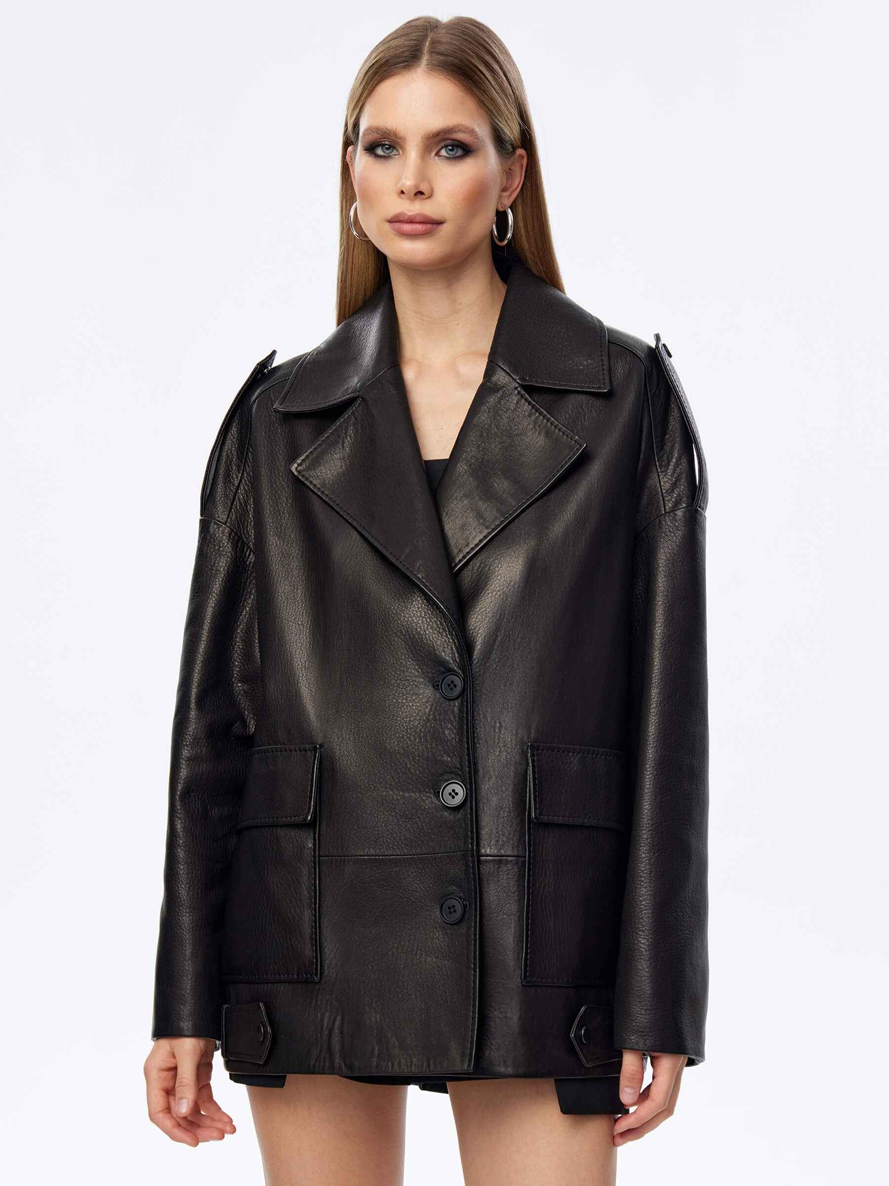 Свободный силуэт пиджака со спущенной линией плеч выполнили из мягкой мелкозернистой кожи премиум класса. Благодаря бережной выделки материал приобрел пластичность, сохранив его прочность. Дизайн модели подчеркнули погонами, боковыми патами и двумя накладными карманами закрывающиеся клапанами.
