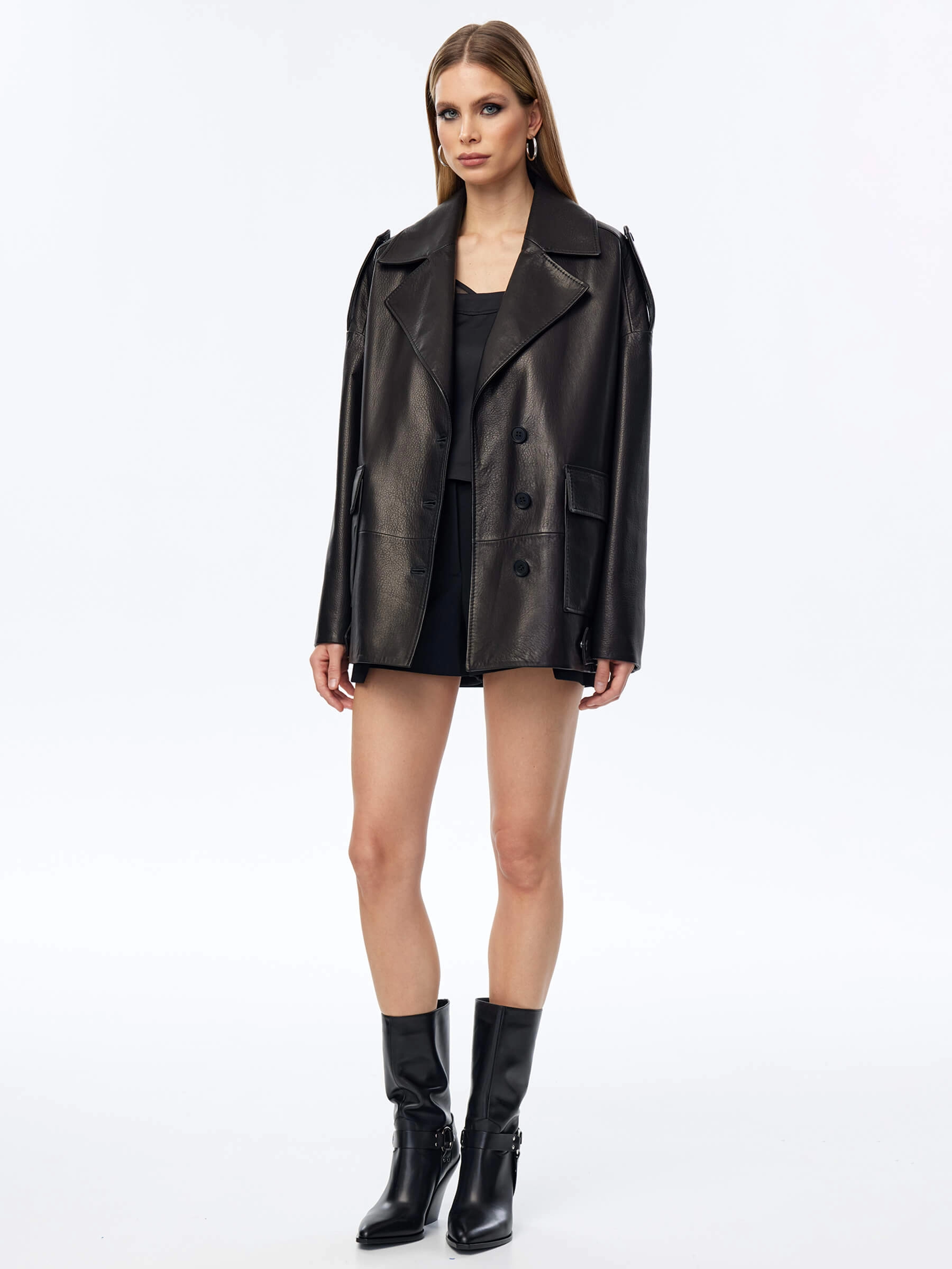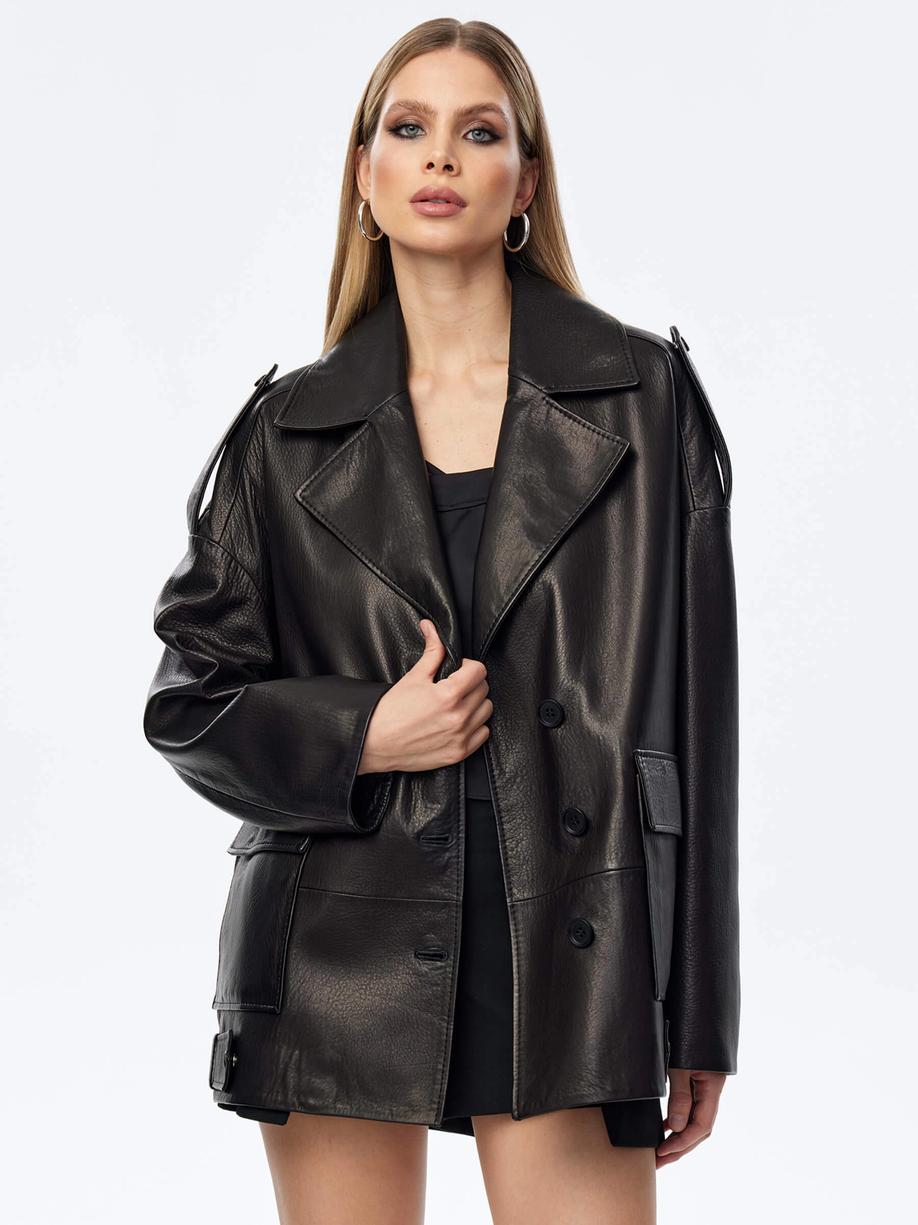 Кожаный пиджак оверсайз для женщин премиум класса 3068, черный, размер 48, артикул 24100