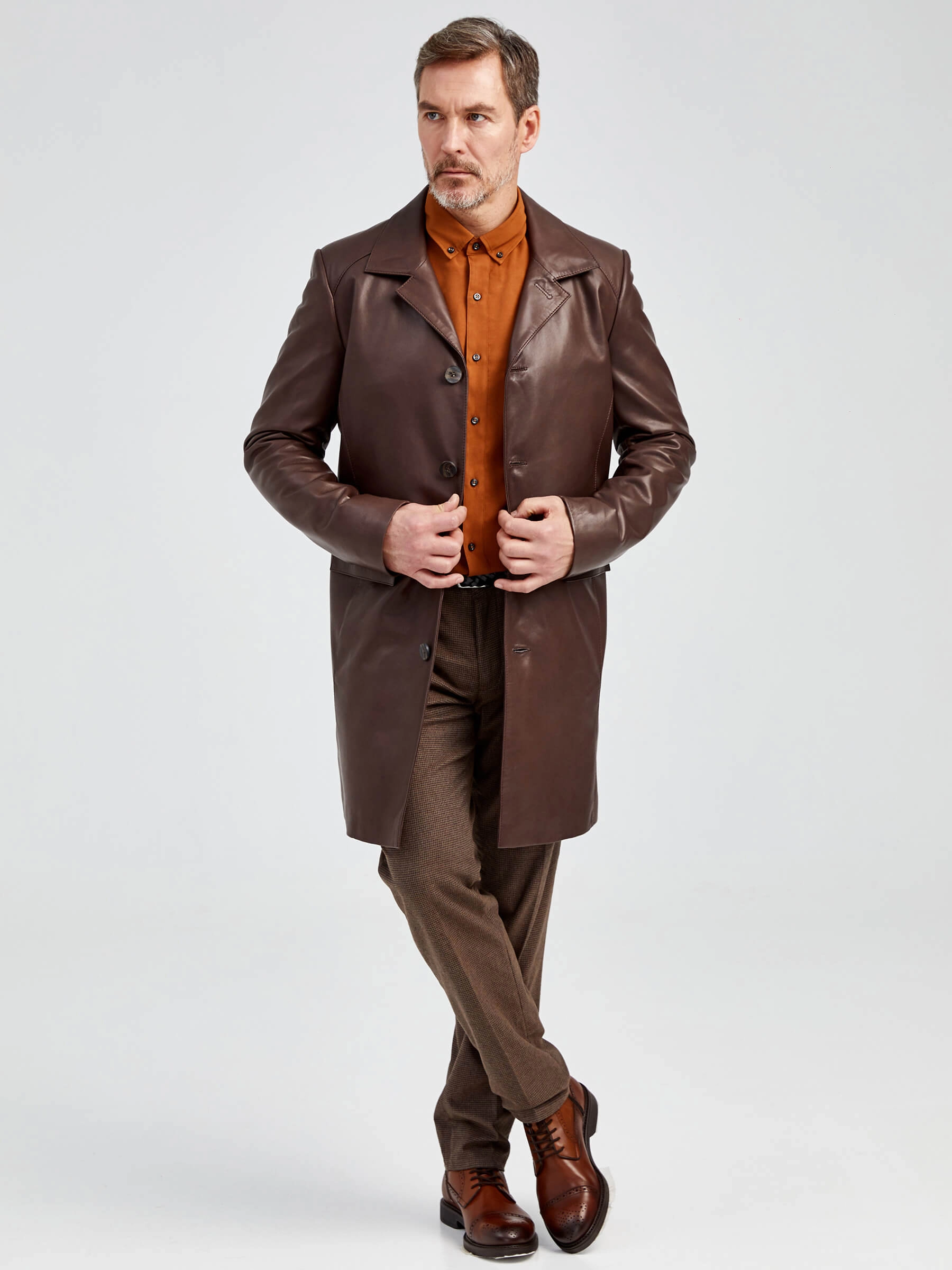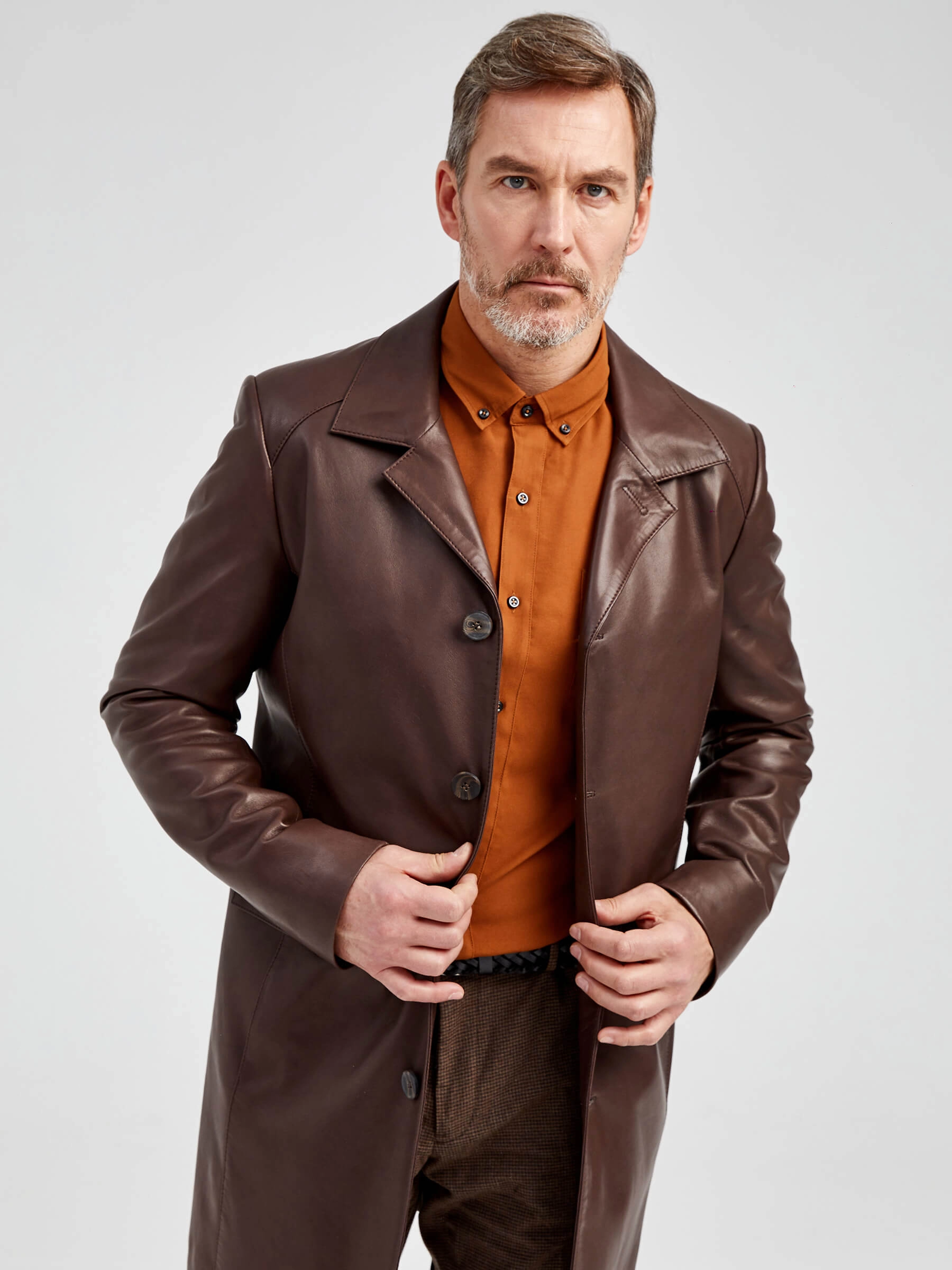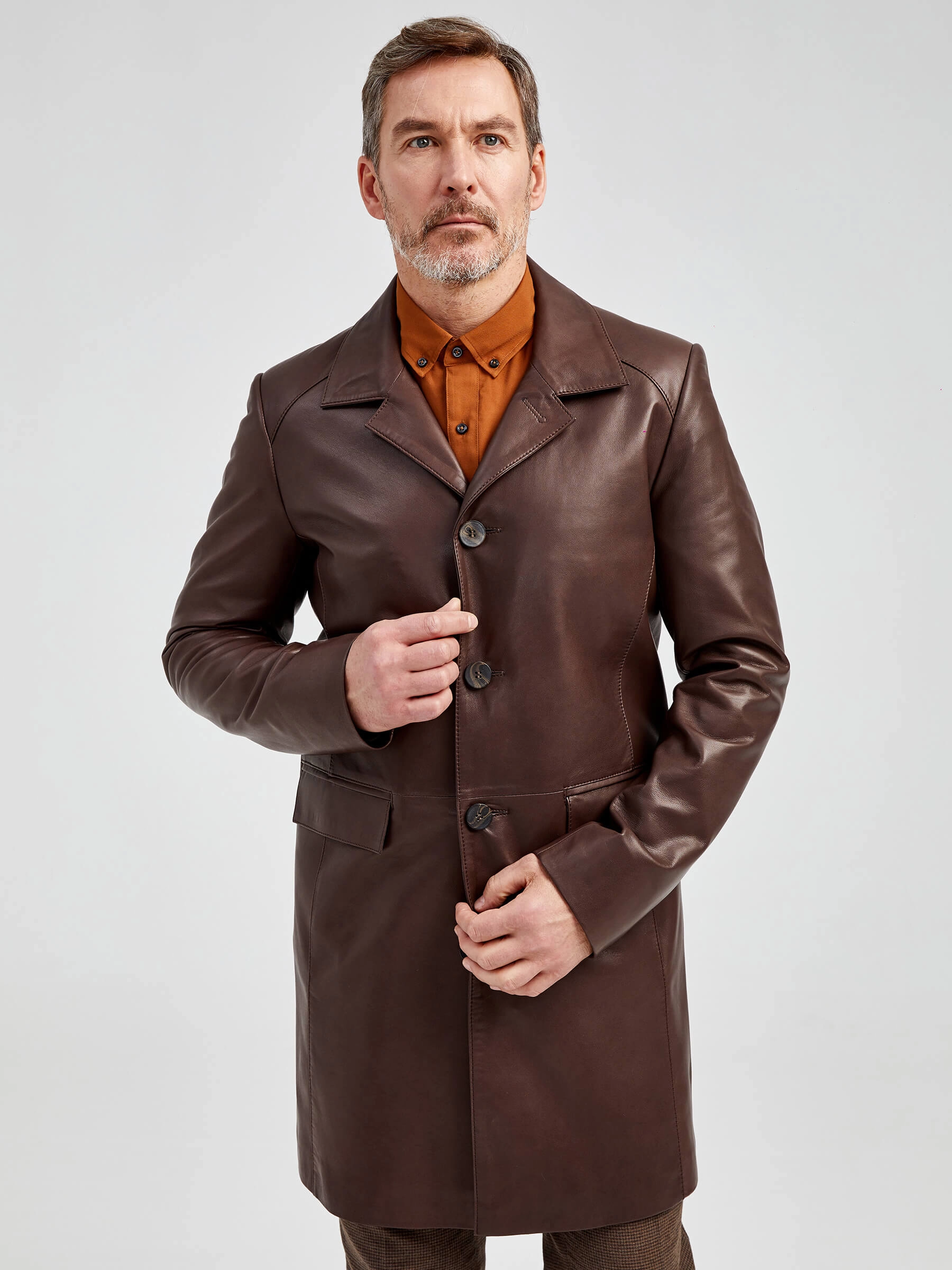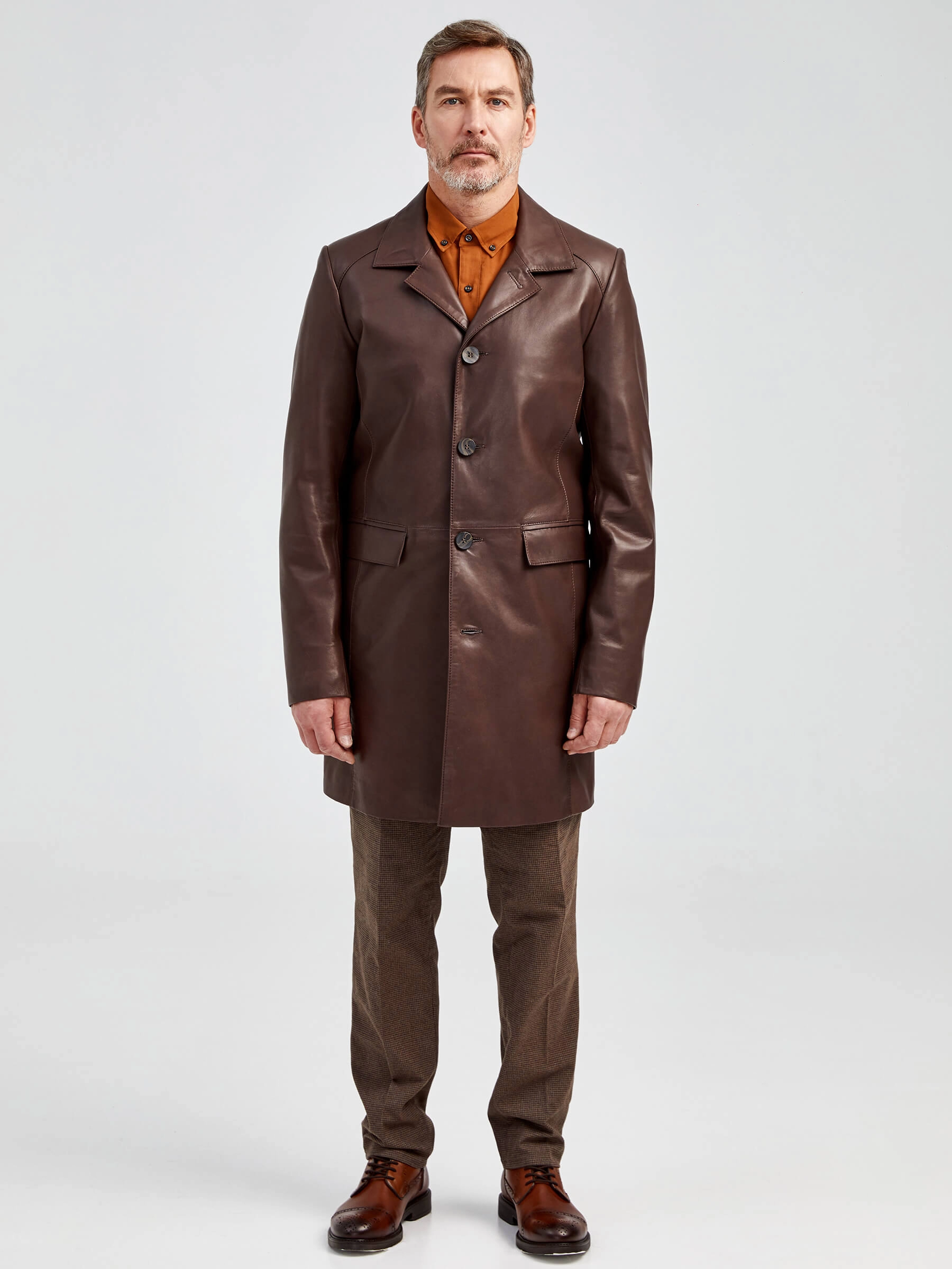 Товар удлиненный кожаный мужской пиджак премиум класса 539, коричневый, размер 50, артикул 29542 выполнен из натуральной кожи с застежкой пуговицы. Рассчитан на сезон: демисезон. Длина изделия 95 см, силуэт полуприлегающий.