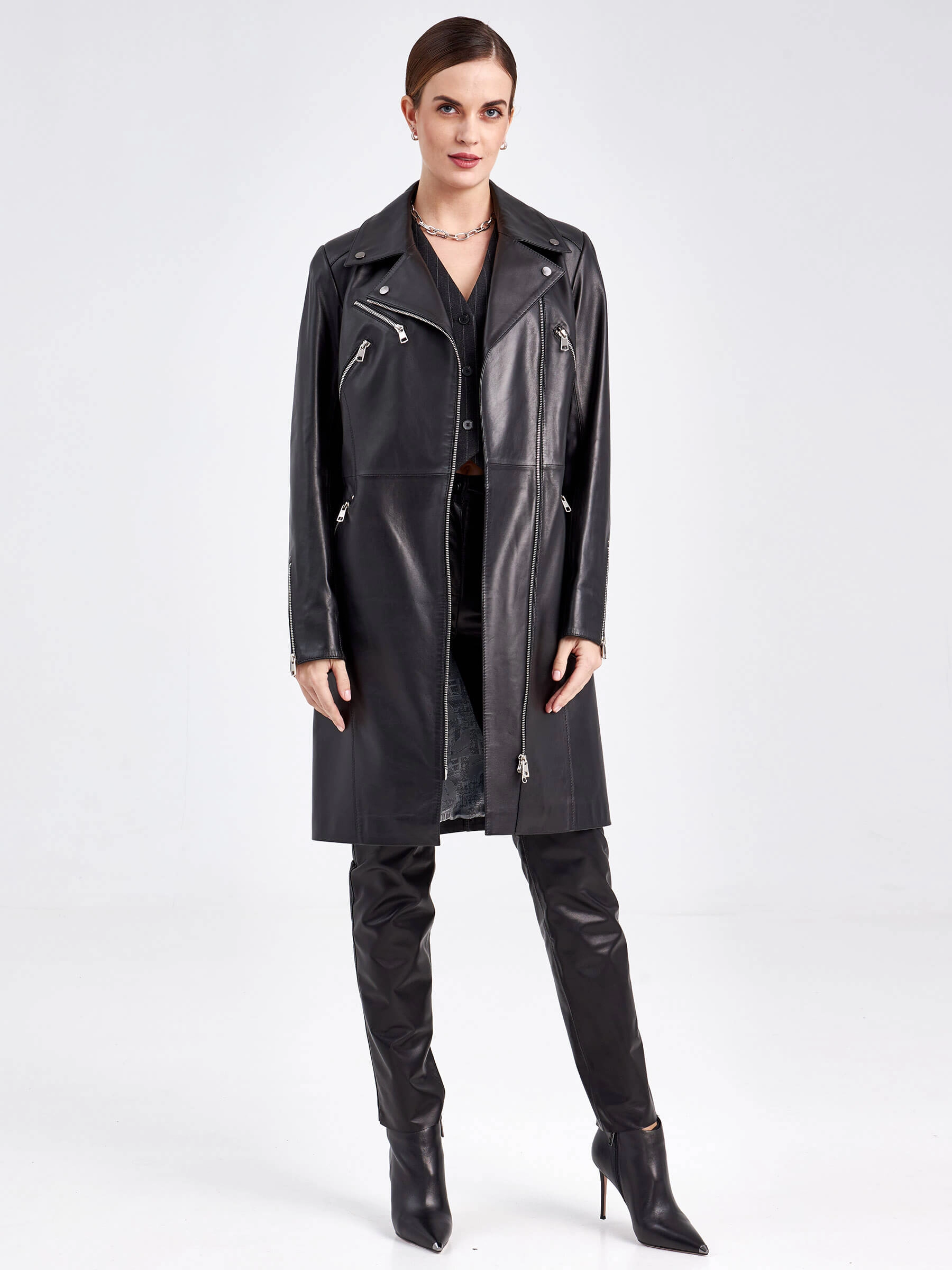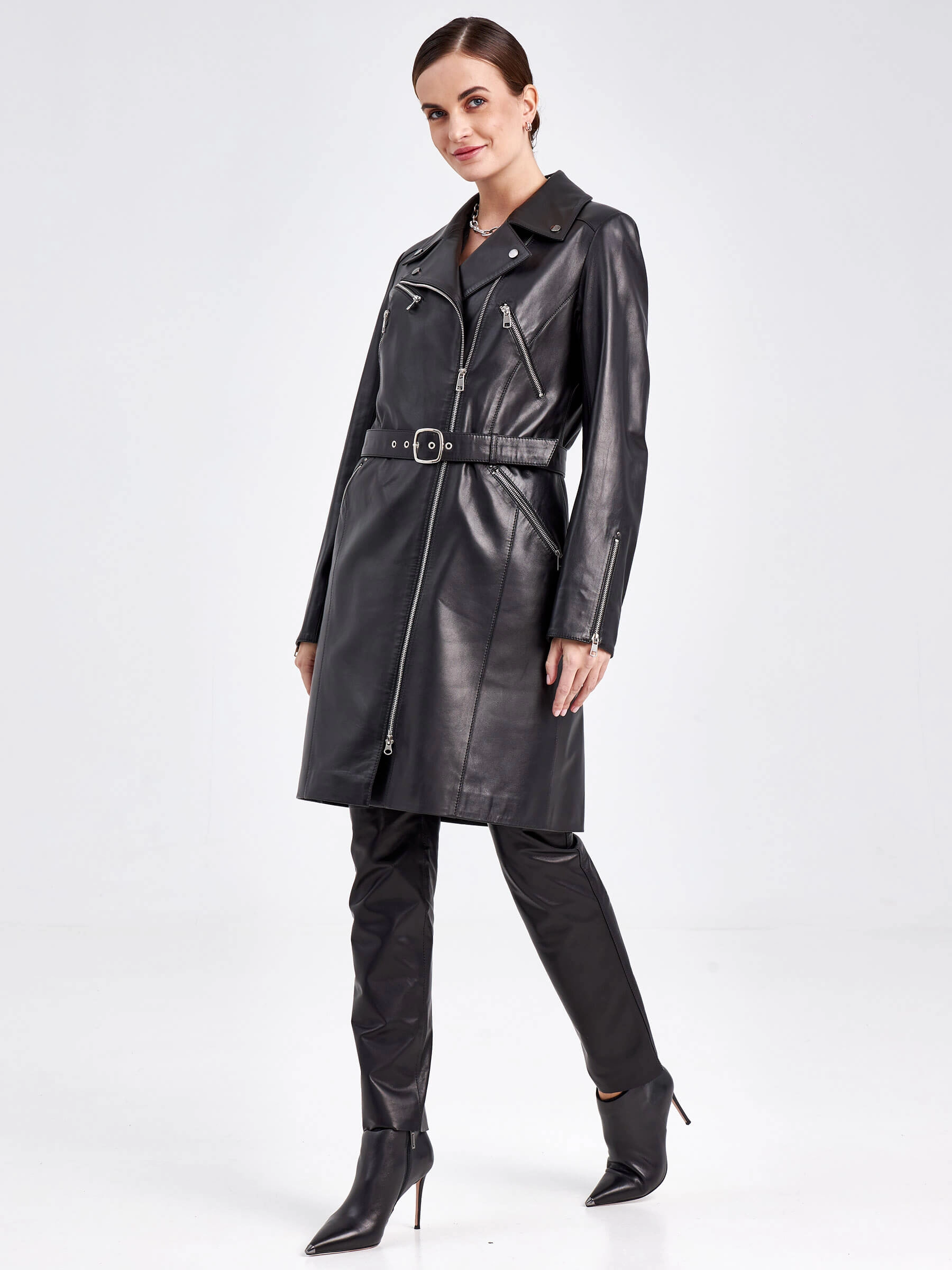 Эту модель позаимствовали у куртки-косухи слегка удлинив длину.Получился стильный, комфортный тренч, который легко сочетается с любыми брюками и джинсами, а также станет беспроигрышным вариантом для межсезонья.Изделие выполнено из натуральной кожи премиум класс.