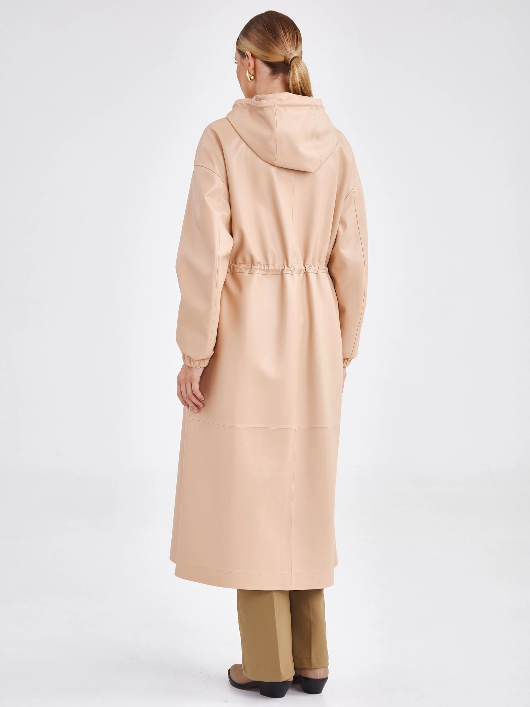 Кожаный женский плащ с капюшоном на молнии премиум класса 3033, бежевый, размер 44, артикул 91951