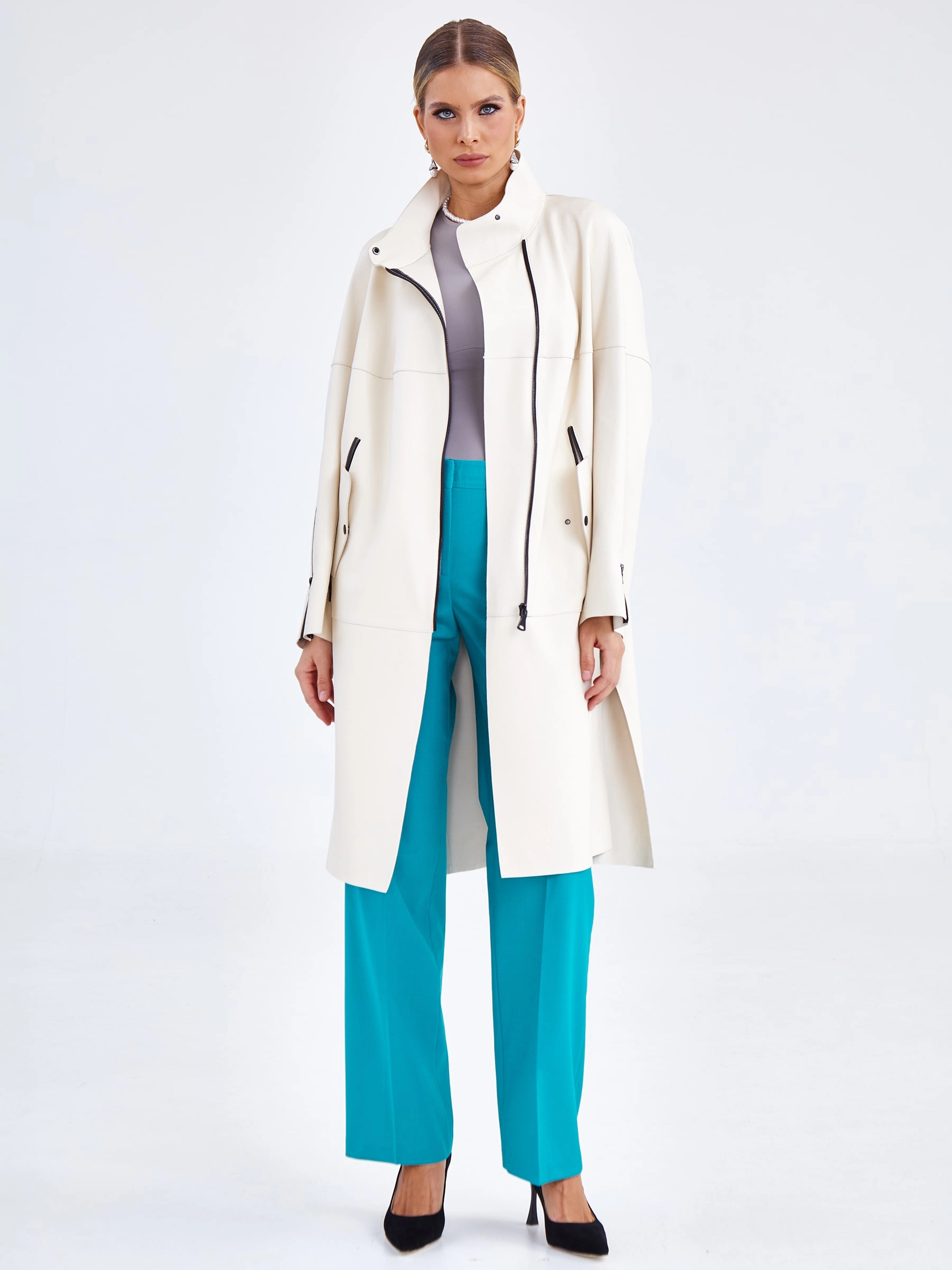 Товар женский кожаный плащ на молнии премиум класса 3041, белый, размер 48, артикул 91901 выполнен из натуральной кожи с застежкой молния. Рассчитан на сезон: весна-лето. Длина изделия 105 см, силуэт свободный.