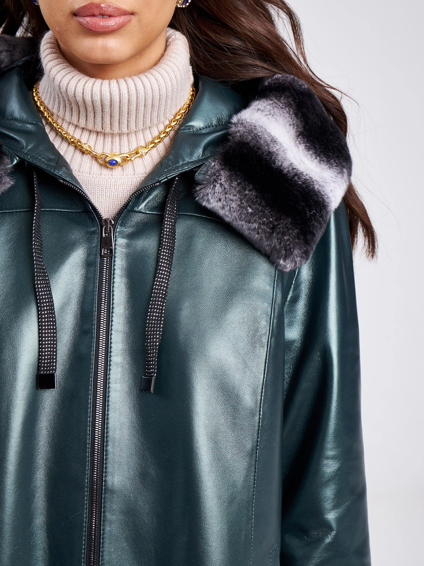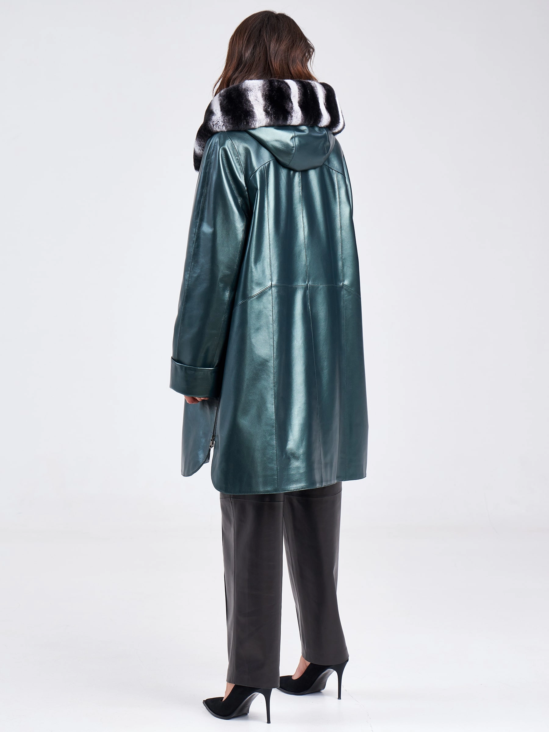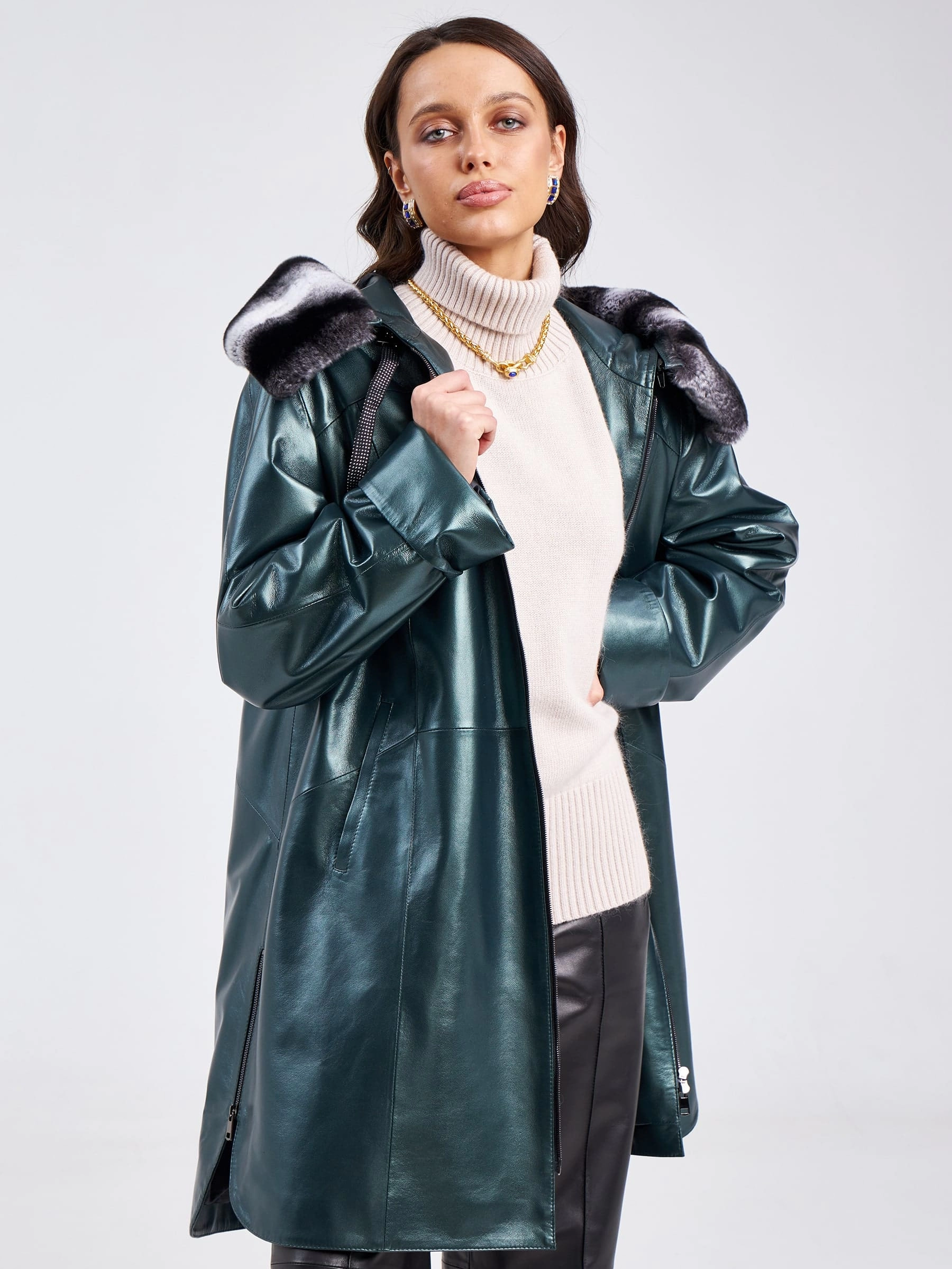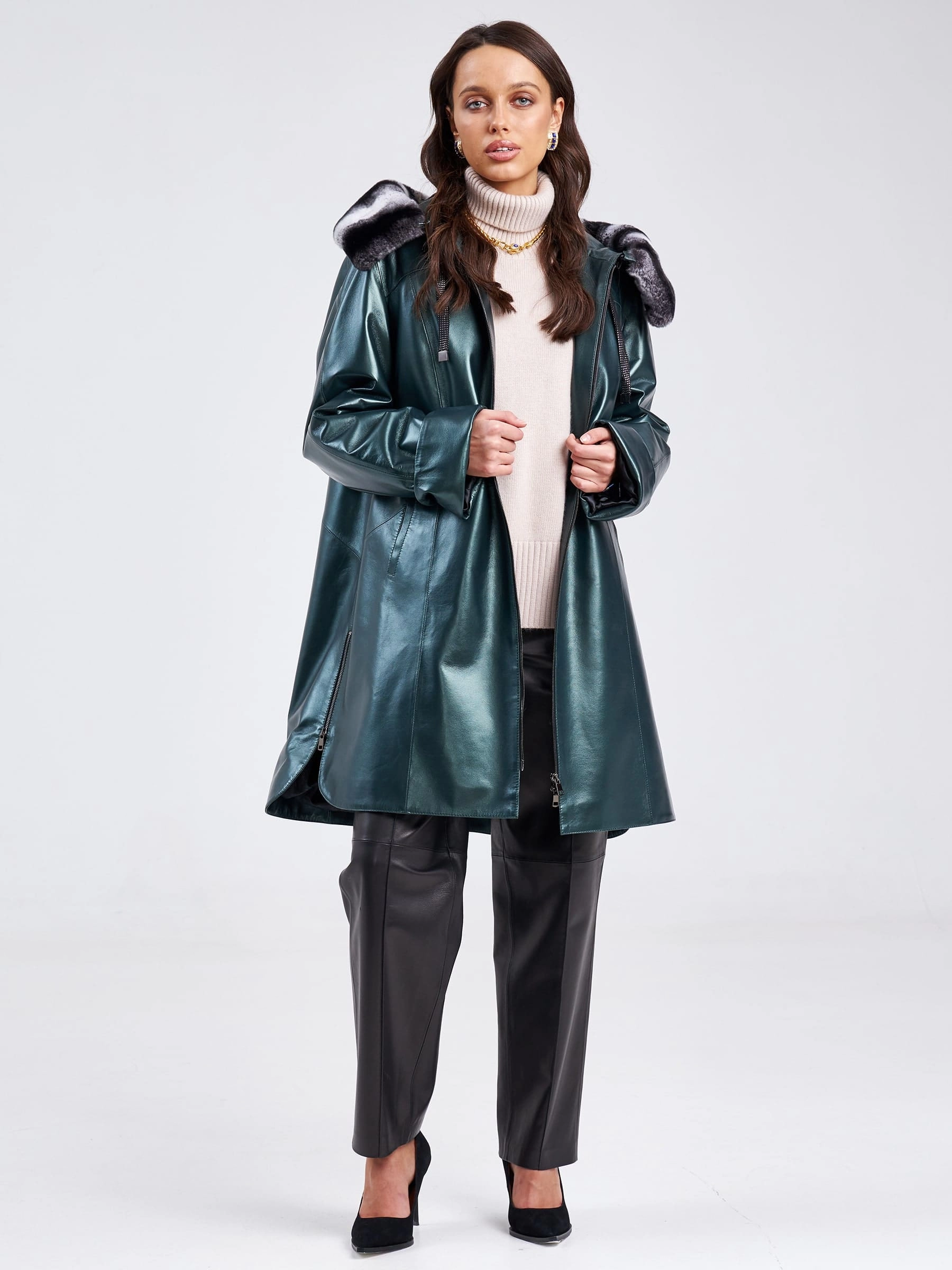 Кожаный плащ с меховым капюшоном женский 3020, зеленый, размер 50, артикул 23270