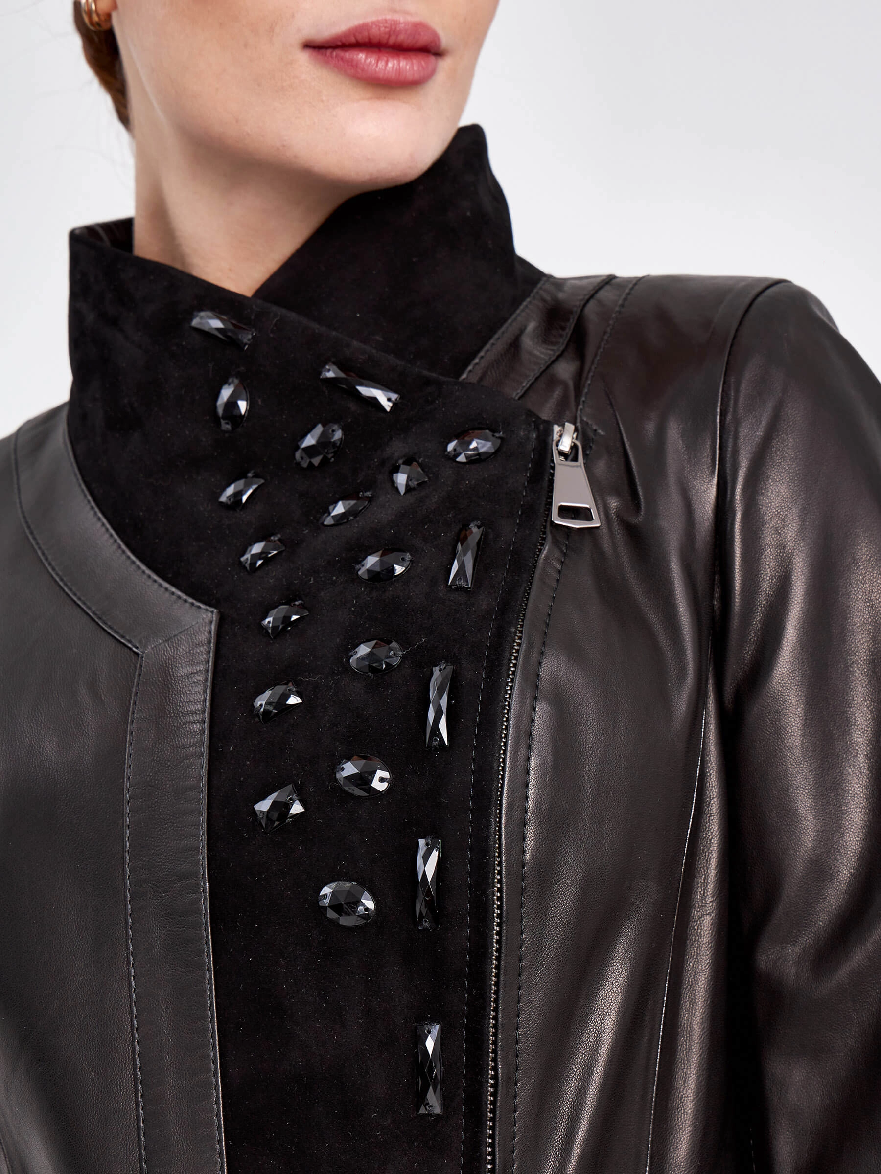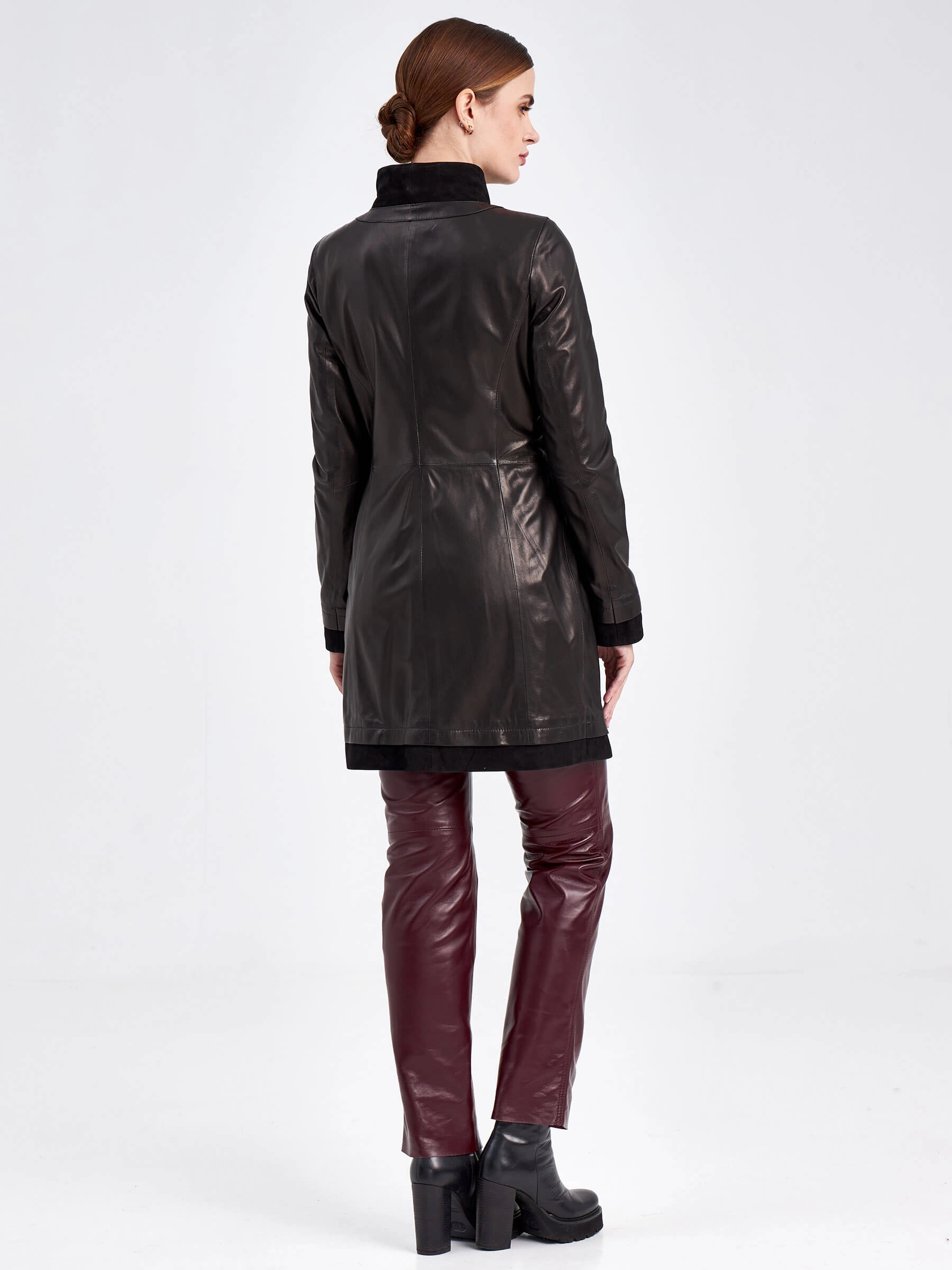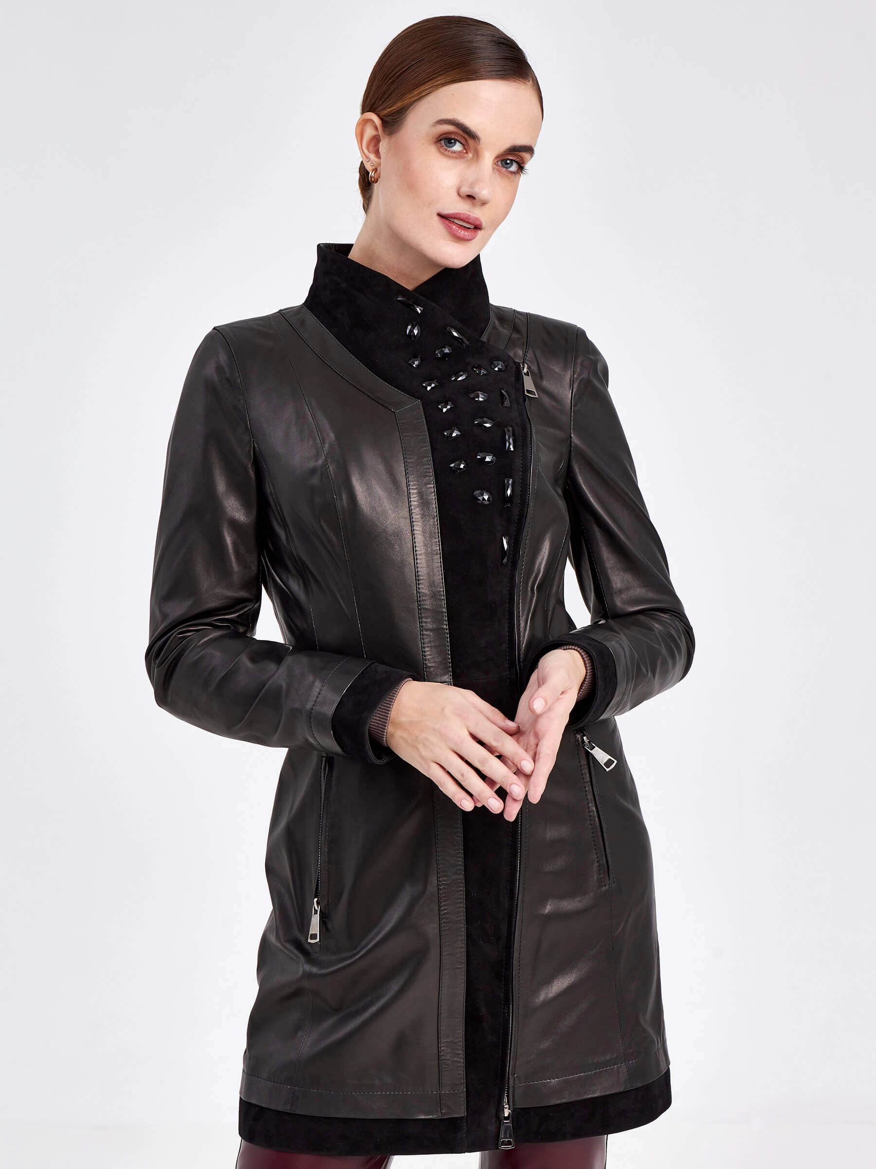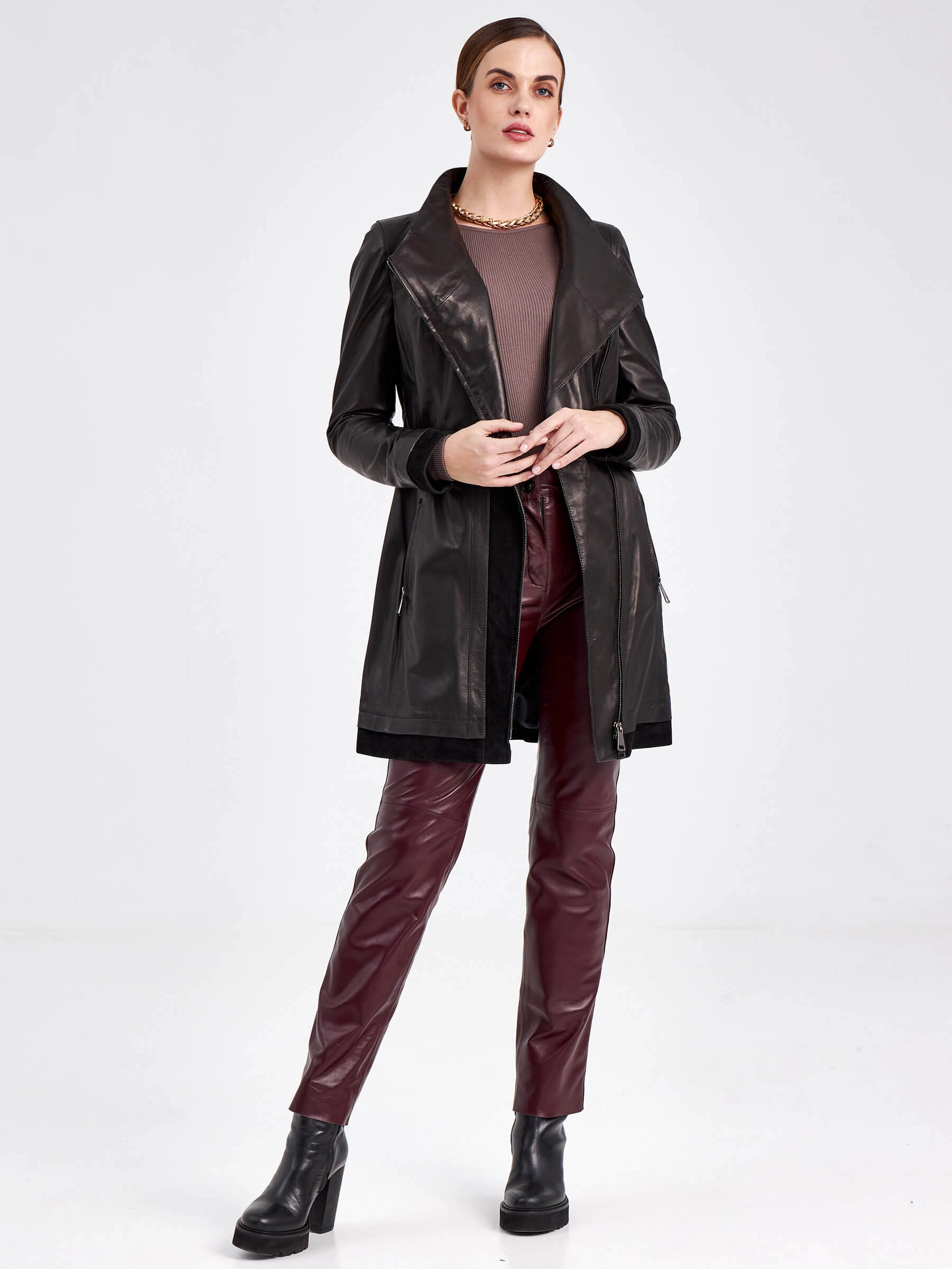 Мастера создали этот женский кожаный плащ из натуральной мягкой кожи, добавив к нему благородные акценты из нежной чёрной замши на воротнике-стойке, бортах и подоле. Полуприлегающий силуэт длиной 81 см подчёркивает фигуру, а дополнительные детали — широкий кожаный пояс, двухзамковая молния и россыпь стразов в тон — отвечают за комфорт и вечерний лоск. Практичность модели обеспечивает подкладка из смесовой ткани (53% вискоза, 47% полиэстер). Для идеального образа примерьте плащ с облегающими брюками-сигаретами и водолазкой, дополнив образ ботильонами на шпильке, или создайте контрастный casual-лук, сочетая его с джинсами-бойфрендами, грубыми ботинками и объёмным свитером.