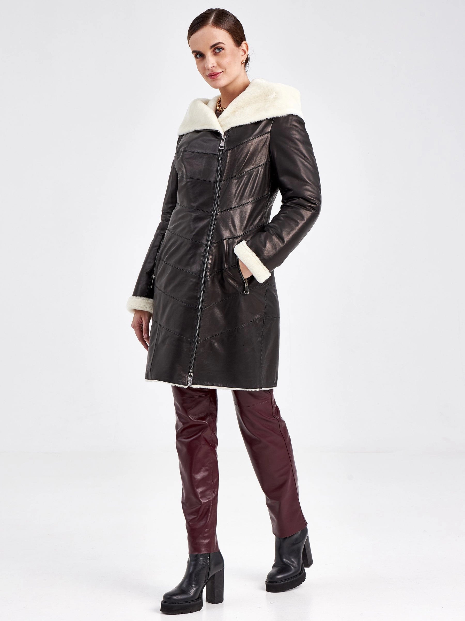 Товар кожаный плащ зимний женский 391мех, с капюшоном, черно-белый, размер 46, артикул 92050 выполнен из натуральной кожи с застежкой молния. Рассчитан на сезон: зима. Длина изделия 90 см, силуэт полуприлегающий.