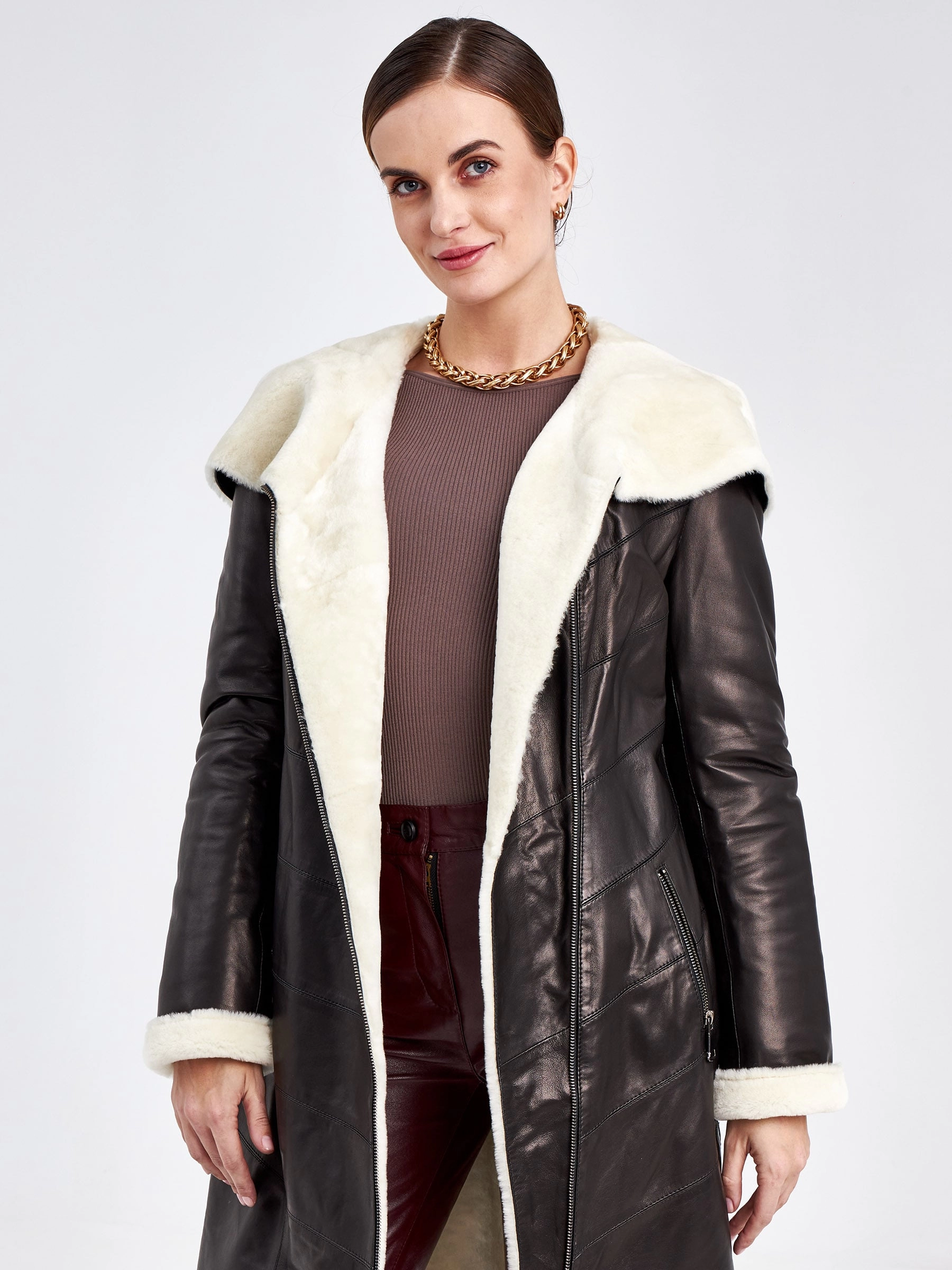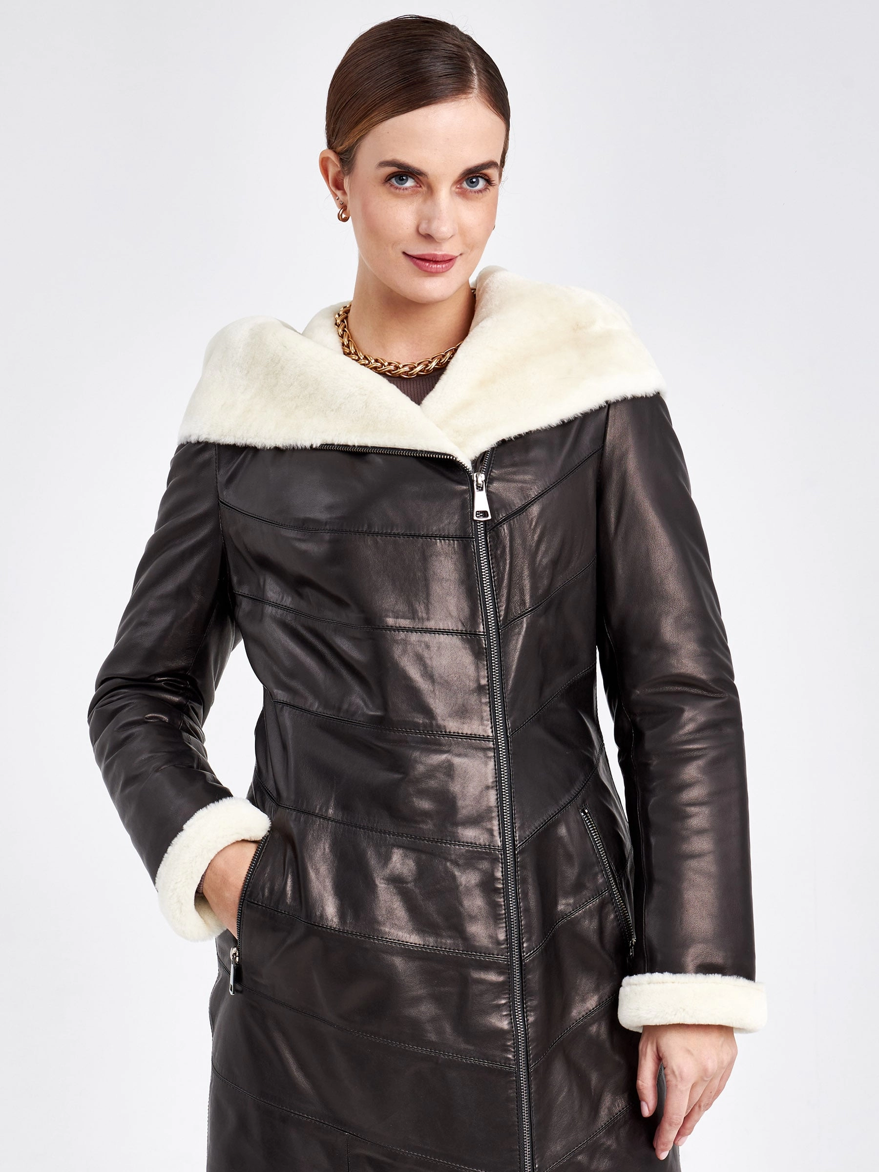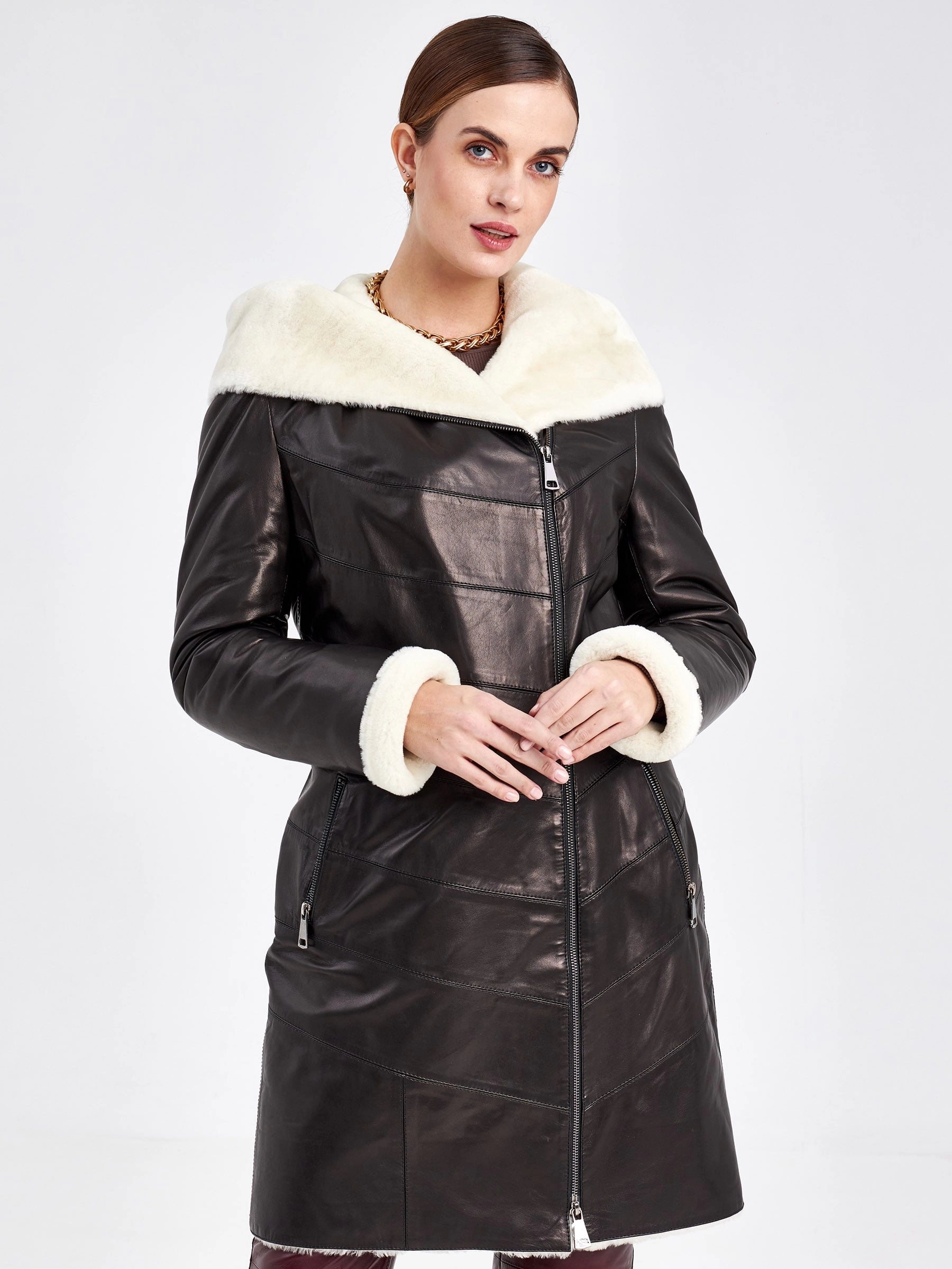 Самое популярное решение на зимний сезон станет теплое и практичное пальто выполненное из натуральной черной кожи в тандеме с плотной овчиной. Пальто хорошо сохраняет тепло,легко сочетается с любой одеждой. Два врезных кармана, как и сама модель, застегиваются на молнию.За комфорт в капризную погоду отвечает уютный капюшон.