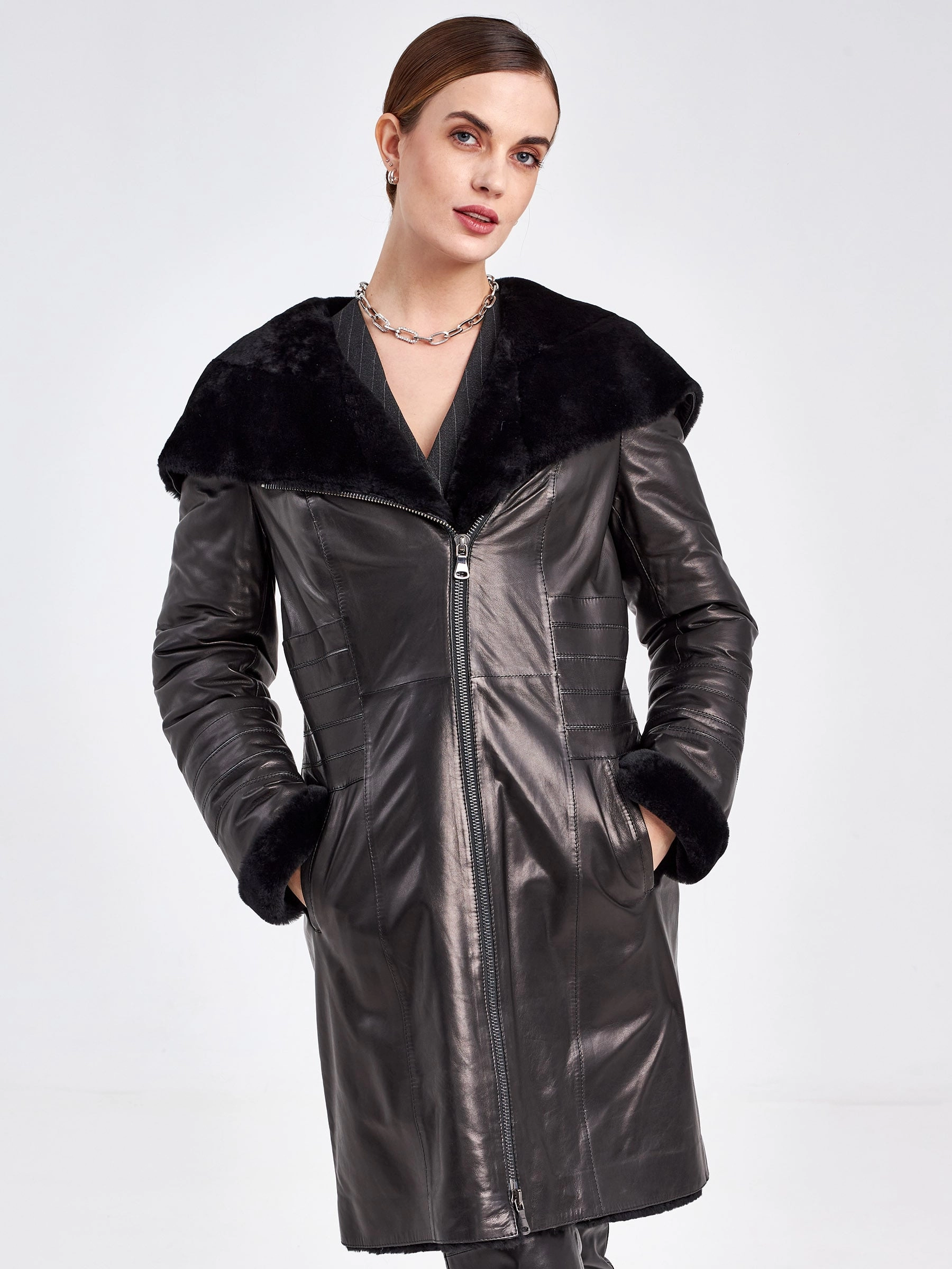 Простое, но в то же время практичное пальто.Эту модель наши мастера выполнили из однотонной натуральной кожи в тандеме с нежной плотной овчиной черного цвета. Полуприлегающий силуэт,безупречная посадка. Пофессиональность пошива и кроя. Основная черта этого изделия тепло и комфорт. За функционал модели отвечает объемный капюшон.