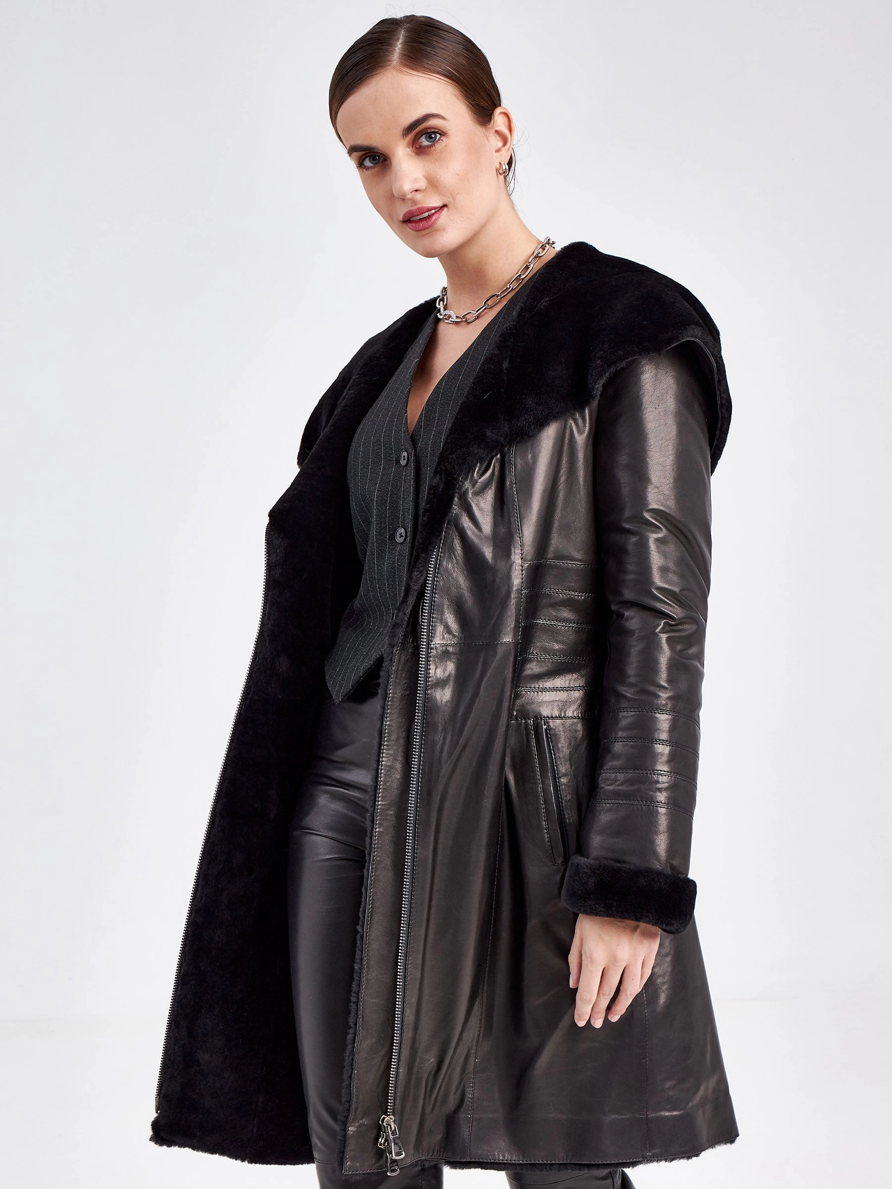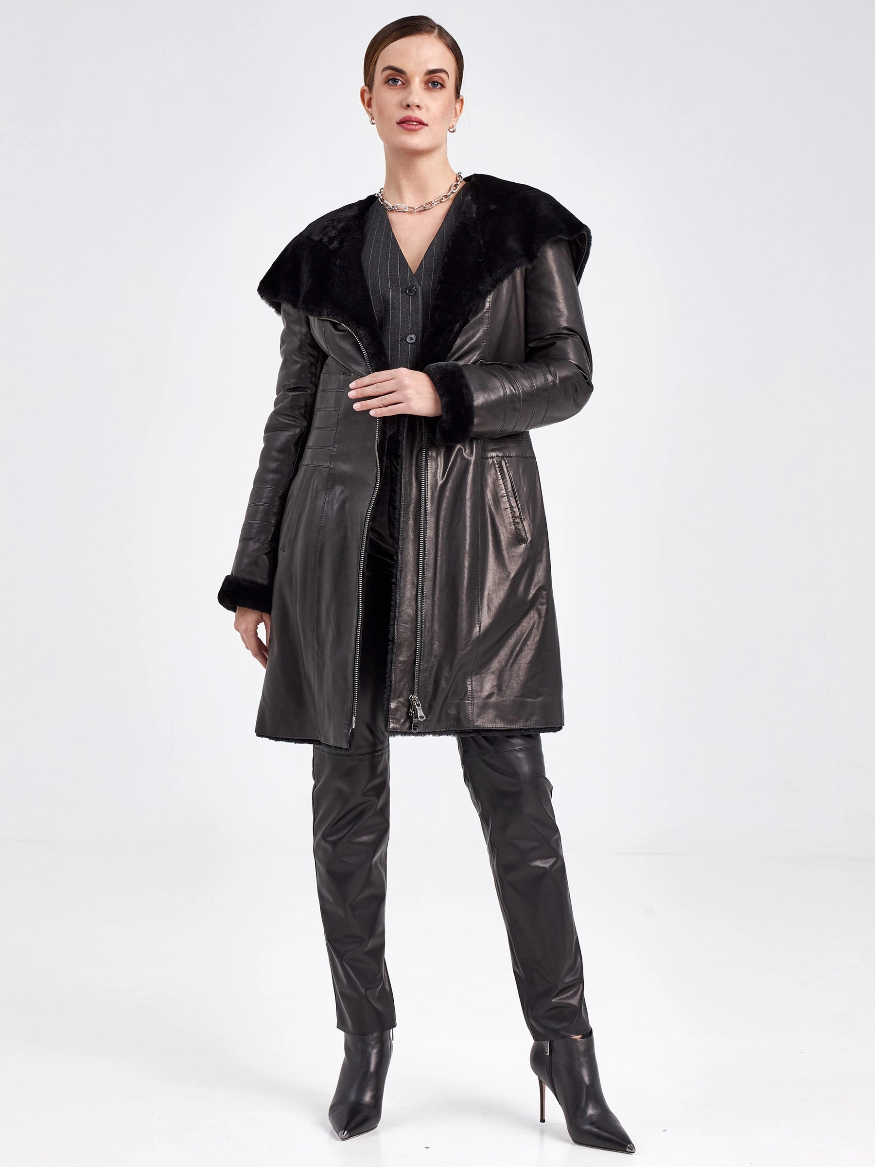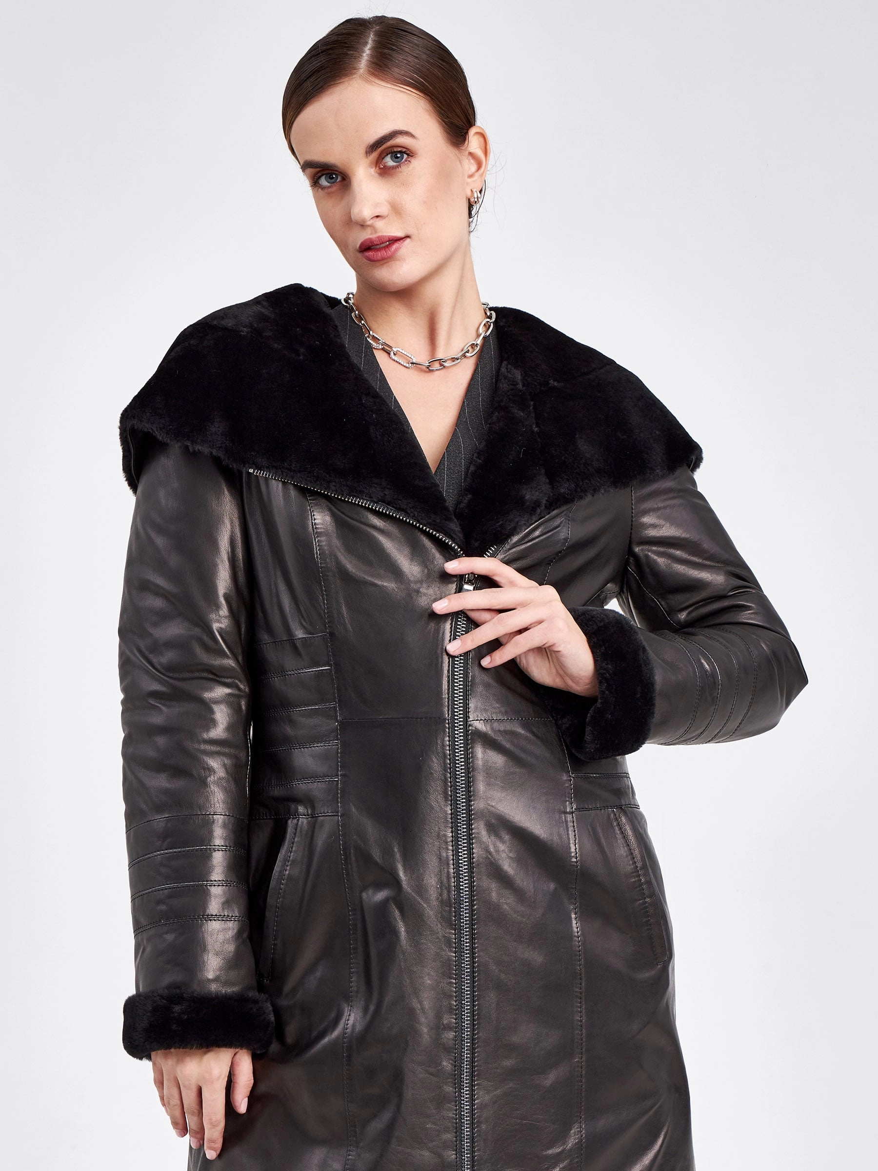Кожаный плащ зимний женский 393мех, с капюшоном, черный, размер 46, артикул 92080