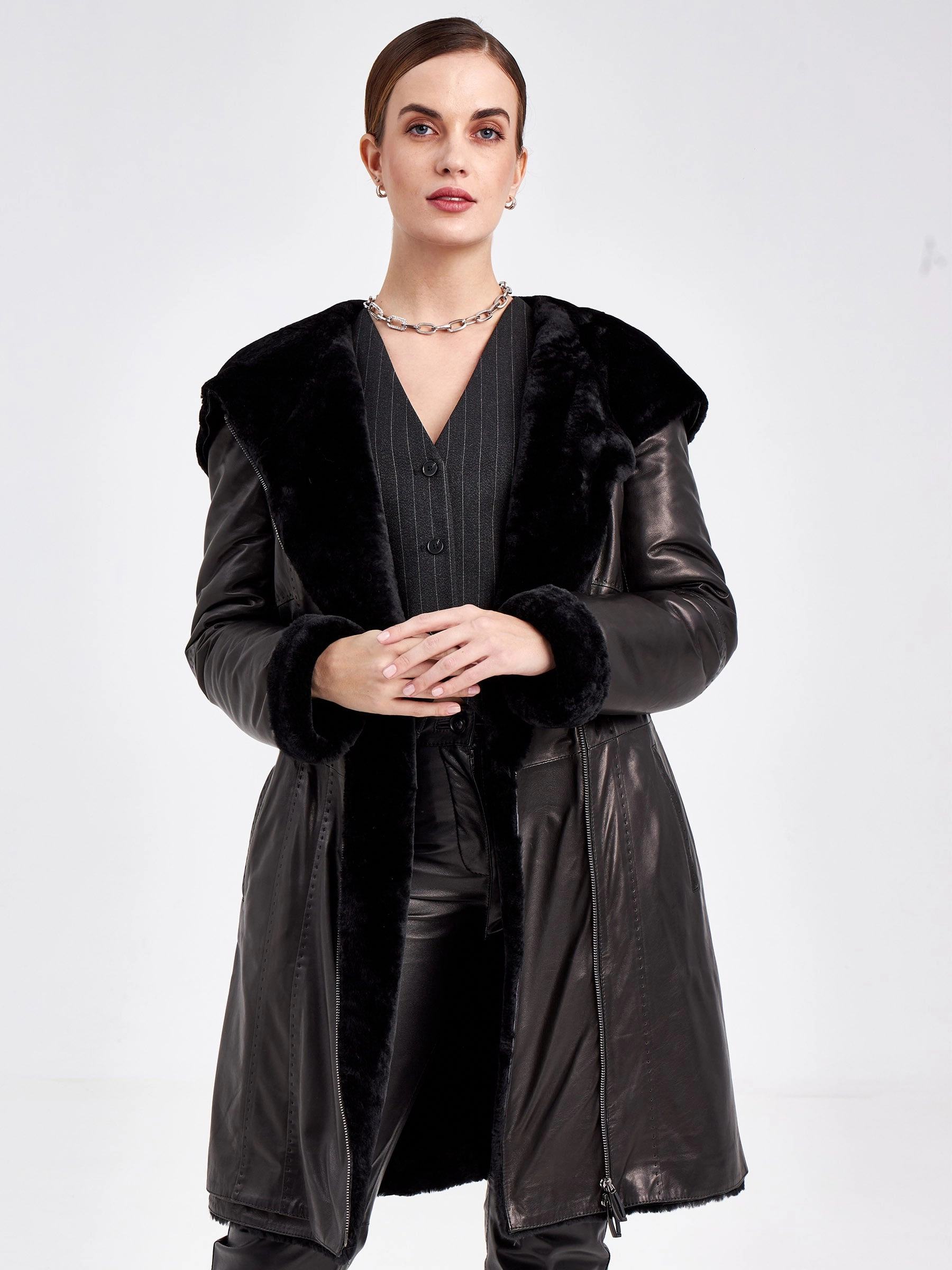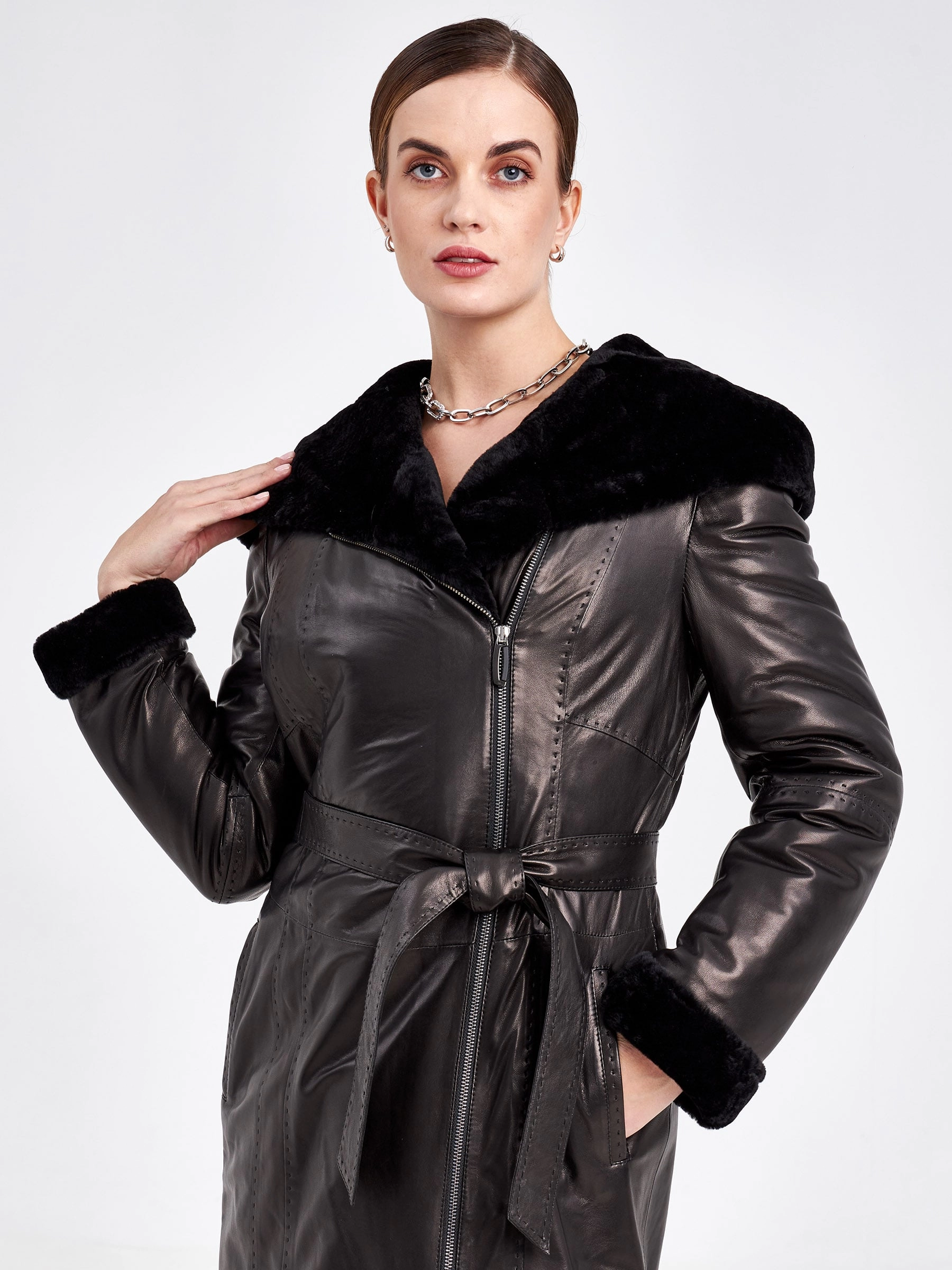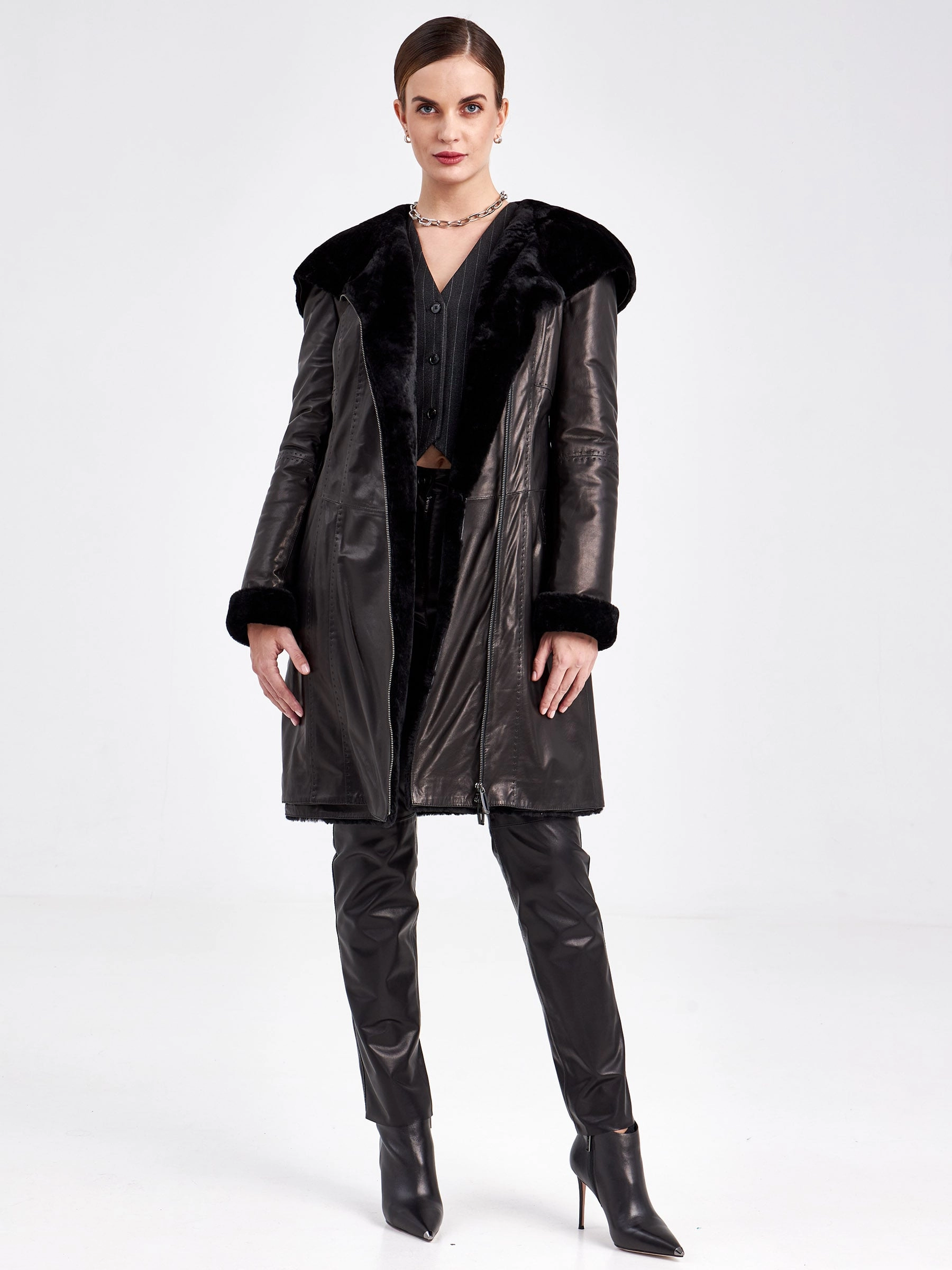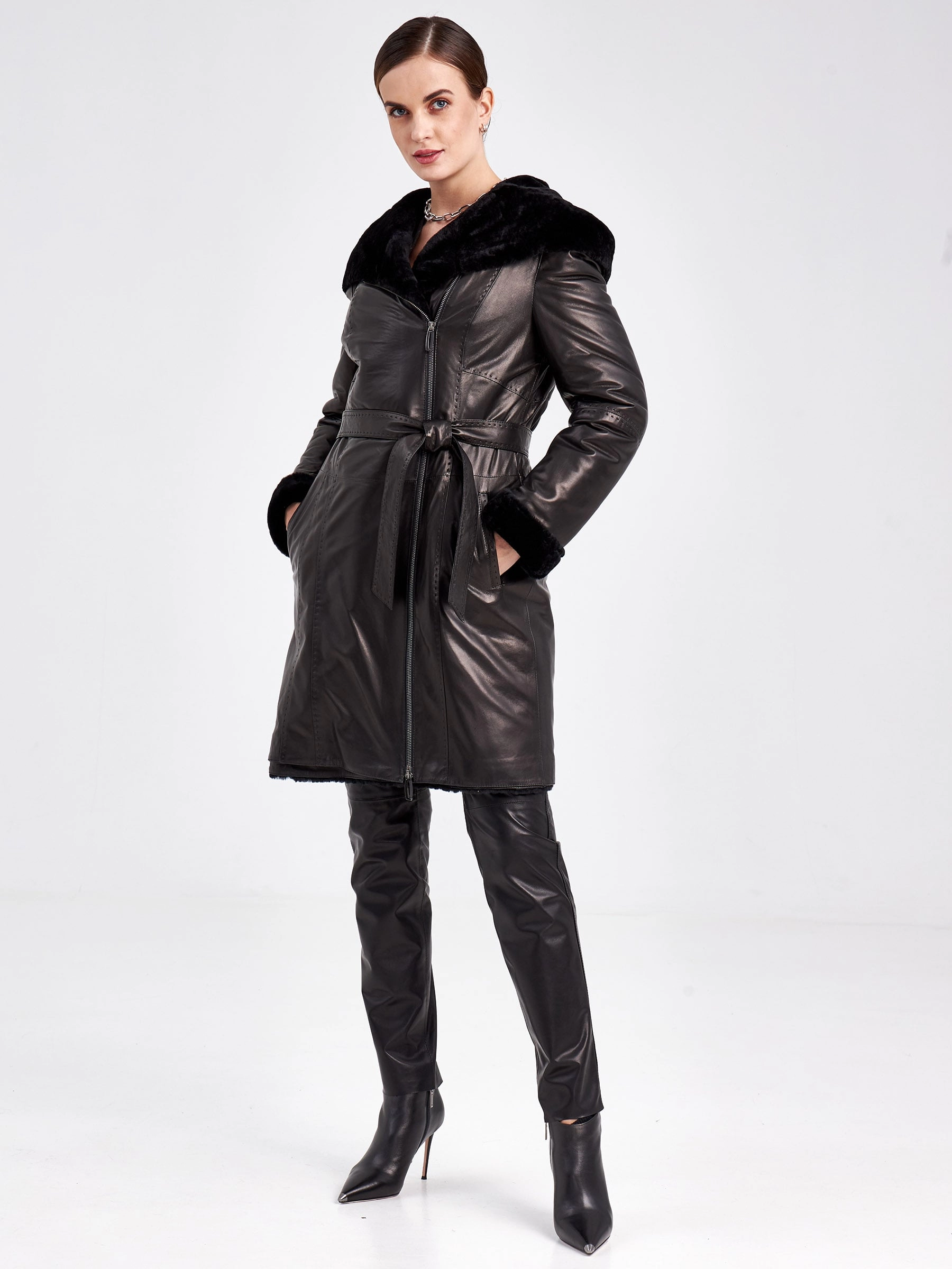 Отличным спутником в холодную погоду, станет кожаное пальто на овчине. Полуприлегающий силуэт, комфортная посадка по фигуре. Два врезных кармана, как и сама модель, застегиваются на молнию. Декором к модели послужил ручной стежок.За комфорт в капризную погоду отвечает объемный капюшон.