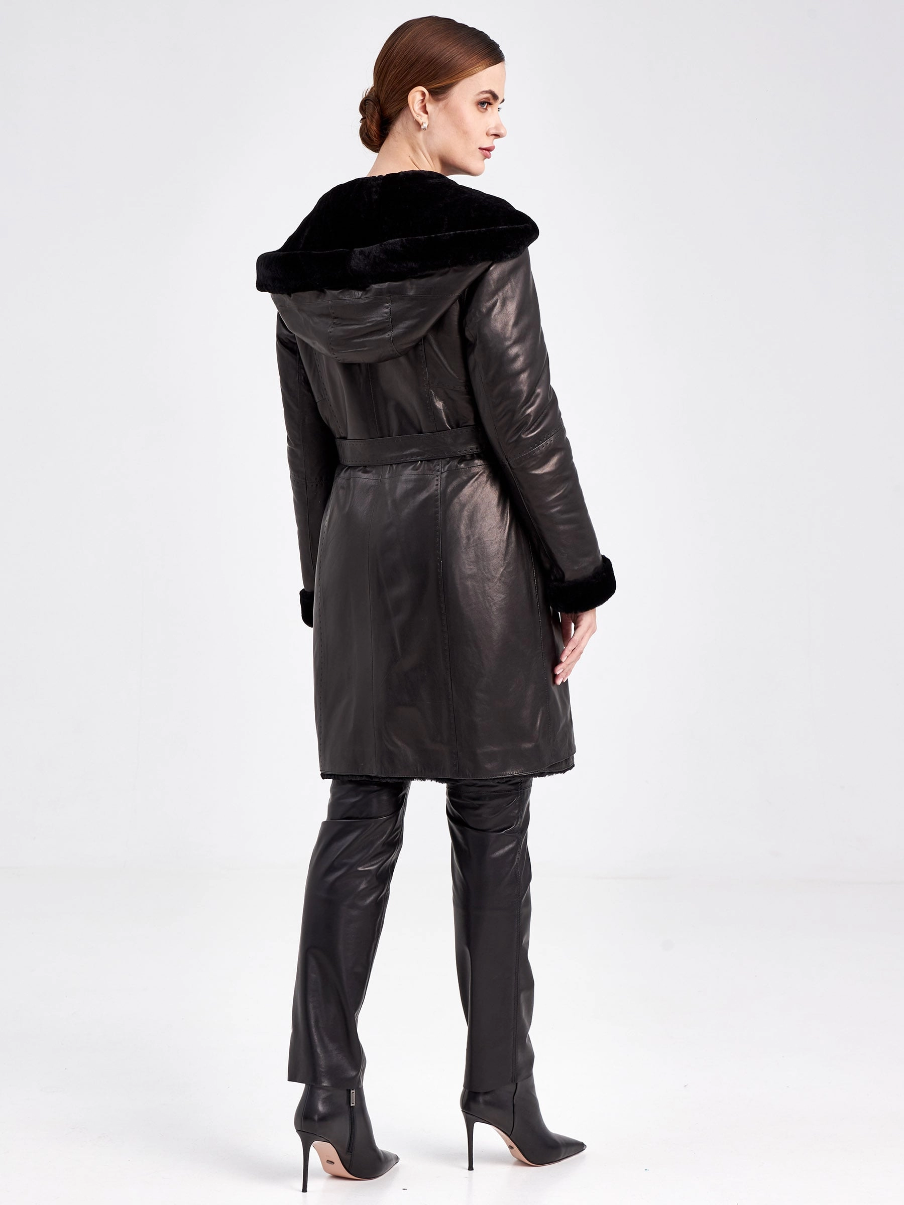 Кожаный плащ зимний женский 394мех, с капюшоном, черный, размер 46, артикул 92090