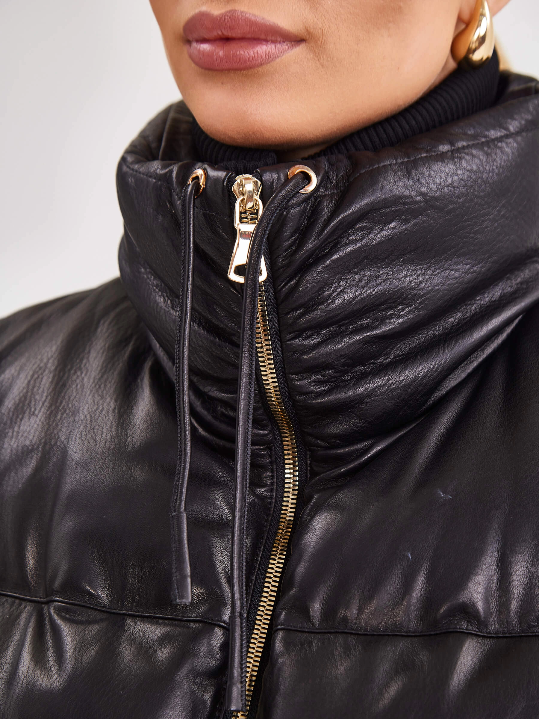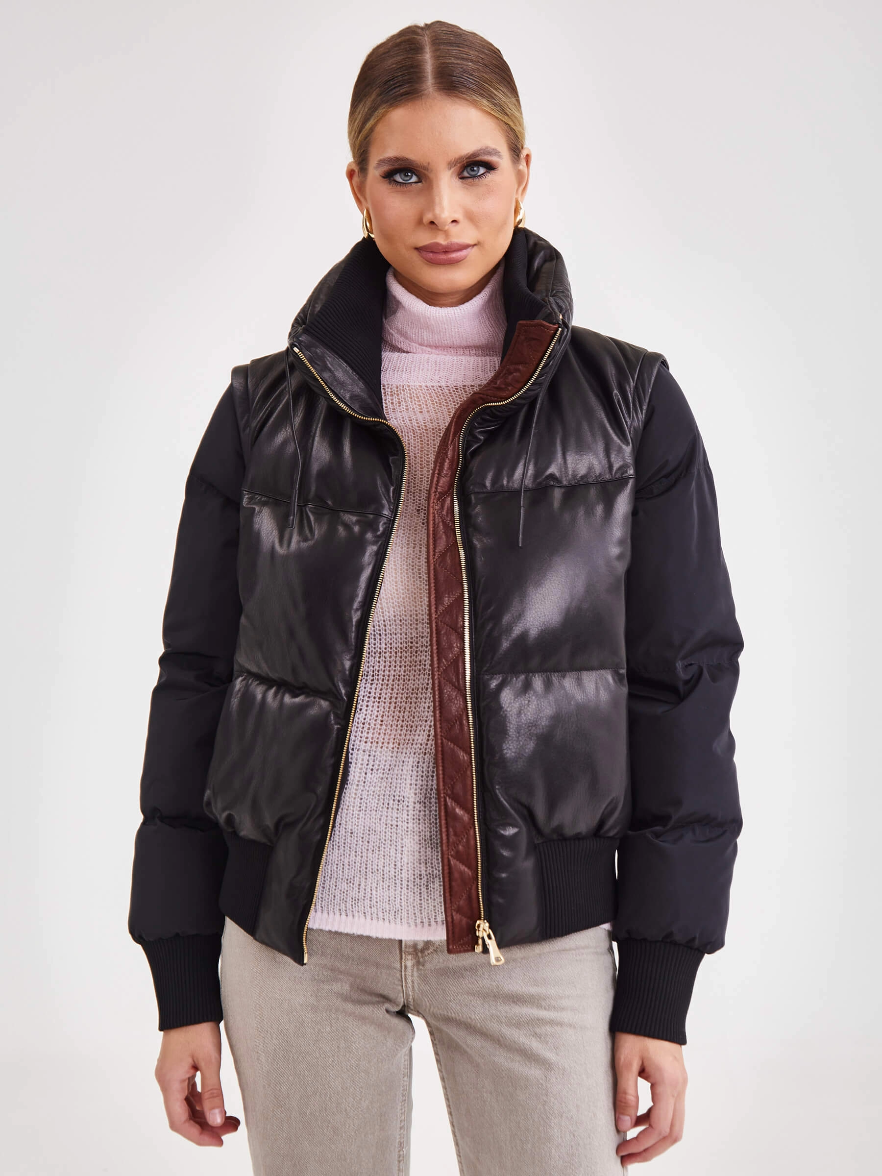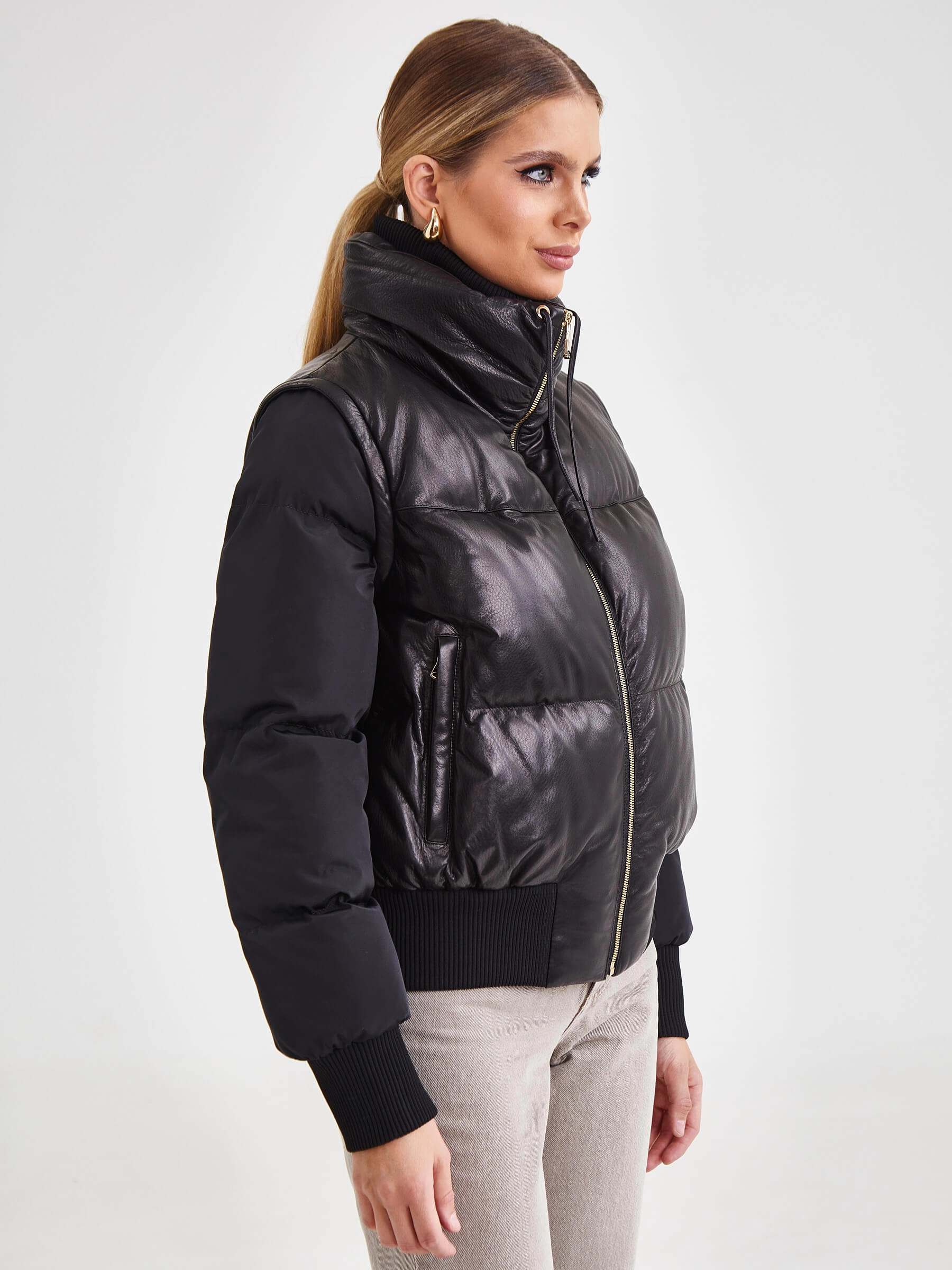 Черный укороченный пуховик премиум-класса, выполненный из натуральной кожи и водоотталкивающей ткани спортивного кроя, станет ключевой вещью в вашем межсезонном гардеробе. Его универсальная длина до середины бедра (51-74 см) и практичность благодаря отстёгивающимся рукавам позволяют создавать разные образы: от спортивного аутфита с кроссовками до элегантного лука с жилеткой поверх платья. Плотные трикотажные манжеты и двойной воротник-стойка надёжно защищают от ветра, а легкий немецкий синтепон Freudenberg внутри гарантирует отличную теплоизоляцию, воздухопроницаемость и простой уход. Совет стилиста: носите его с прямыми джинсами и базовым верхом для повседневного образа или используйте как жилет, чтобы добавить фактуры и дерзости деловому костюму или объёмному свитеру.