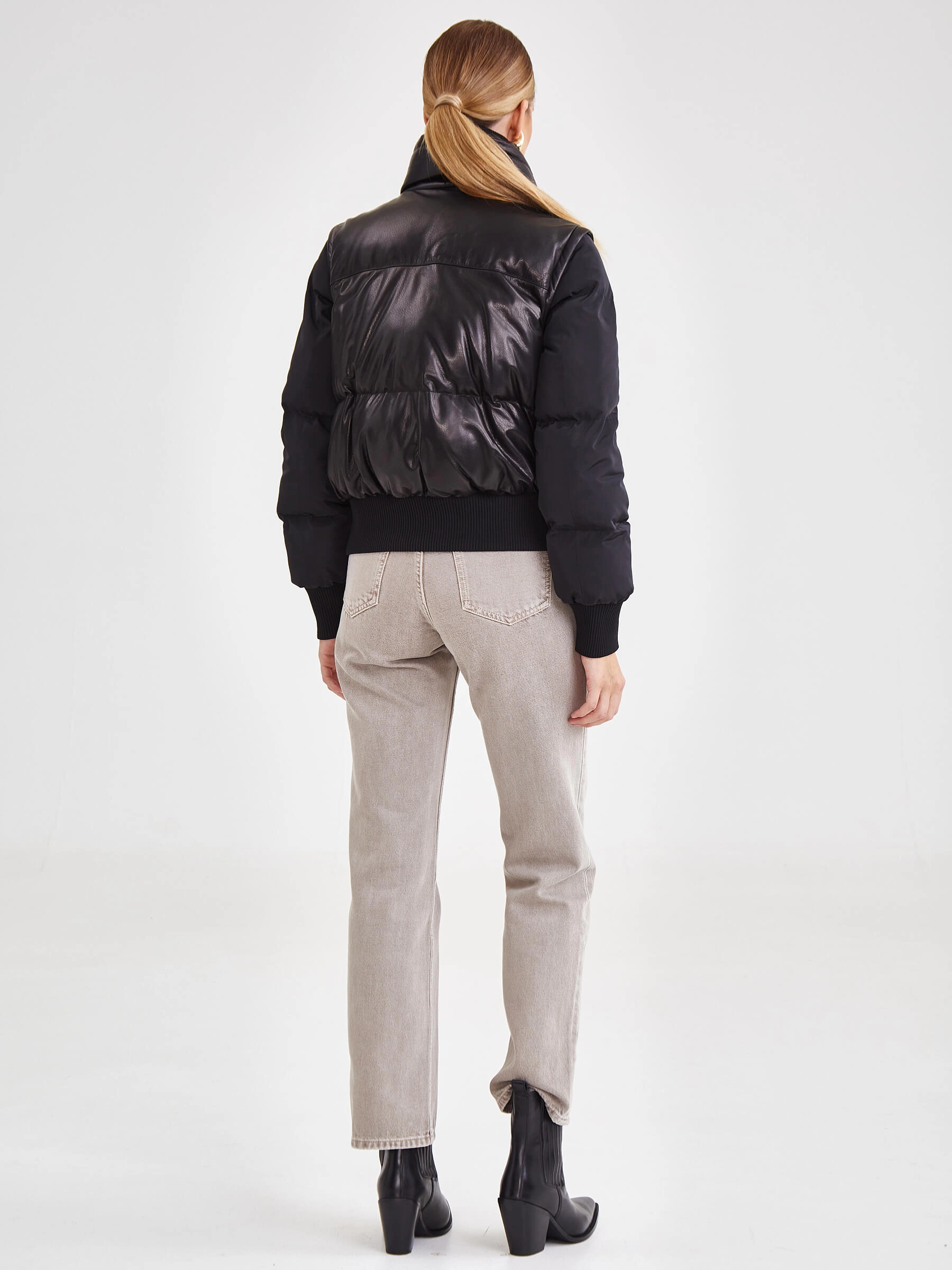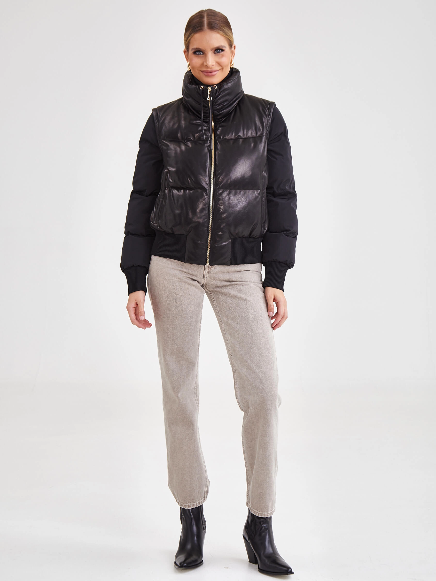 Товар комбинированный короткий кожаный женский пуховик премиум класса 3029, черный, размер 46, артикул 25330 выполнен из натуральной кожи с застежкой молния. Рассчитан на сезон: демисезон. Длина изделия 51-74 см, силуэт свободный.