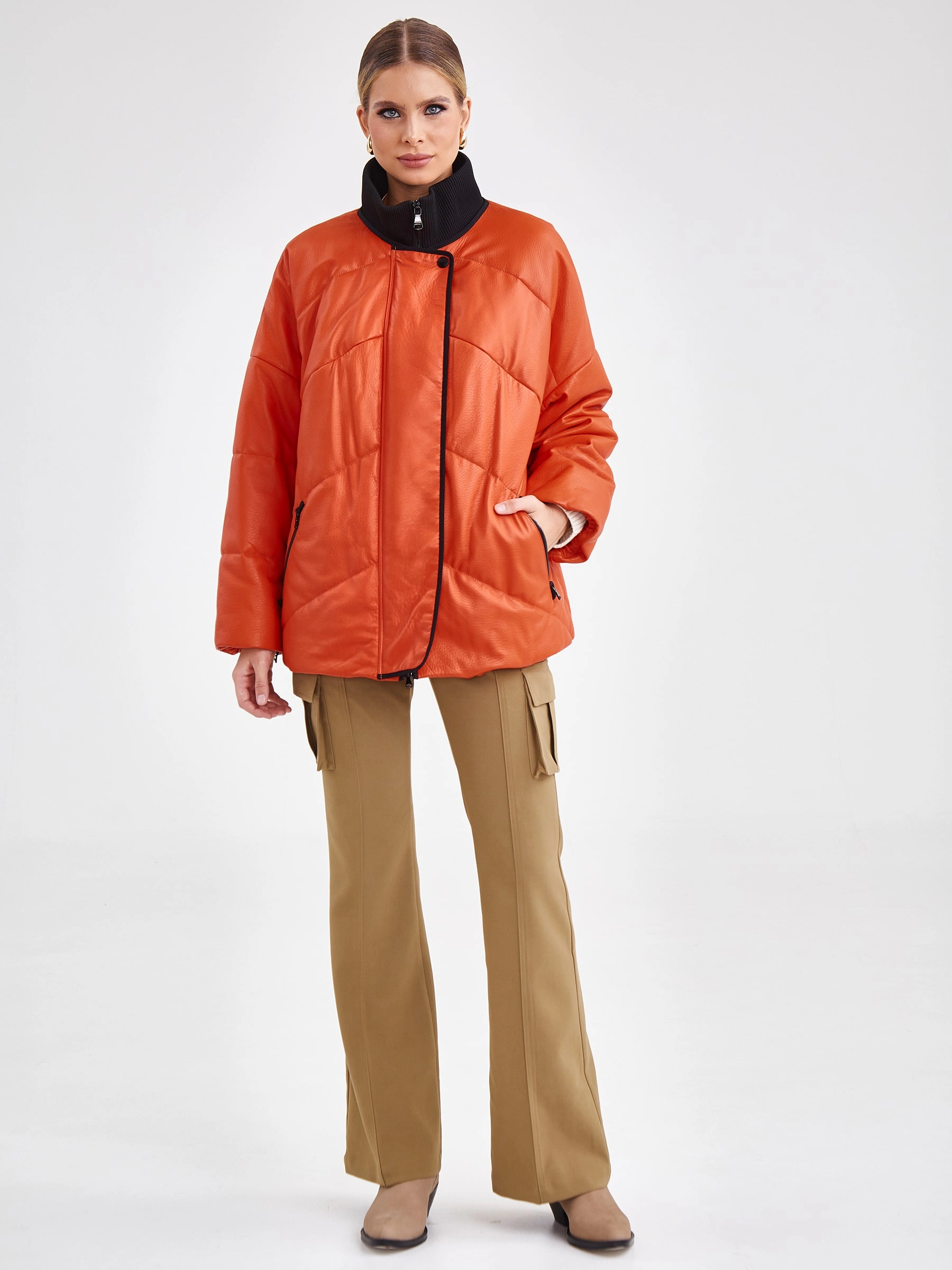Короткий пуховик свободного кроя длиной до середины бедра (51–74 см) сшит из натуральной кожи насыщенного оранжевого цвета, который заряжает энергией и улучшает настроение. Лаконичный дизайн без декора и застёжка-молния с ветрозащитным клапаном делают модель универсальной, а высокая стойка из плотного трикотажа обеспечивает комфорт и защиту от ветра. Практичность дополняют подкладка из 100% полиэстера и немецкий утеплитель синтепон Freudenberg, гарантирующий отличную теплоизоляцию, воздухопроницаемость и простой уход в демисезонный период. Совет стилиста: Яркий акцент вашего образа — носите эту куртку с нейтральной базой (чёрные, белые, серые или джинсовые вещи), чтобы цвет стал главным героем. Идеально сочетать с облегающими брюками или джинсами и минималистичной обувью, например, кроссовками или ботильонами на плоской подошве.