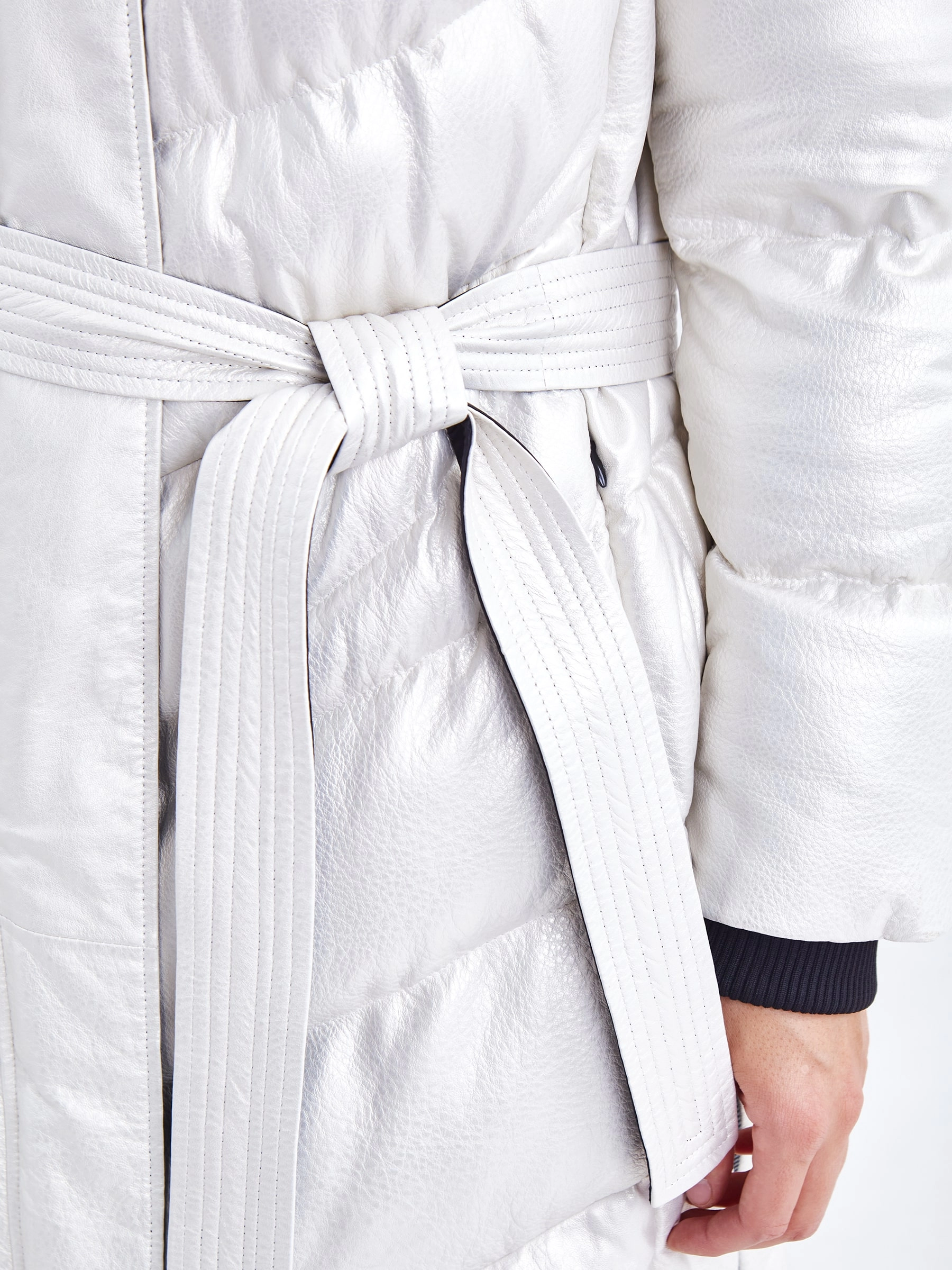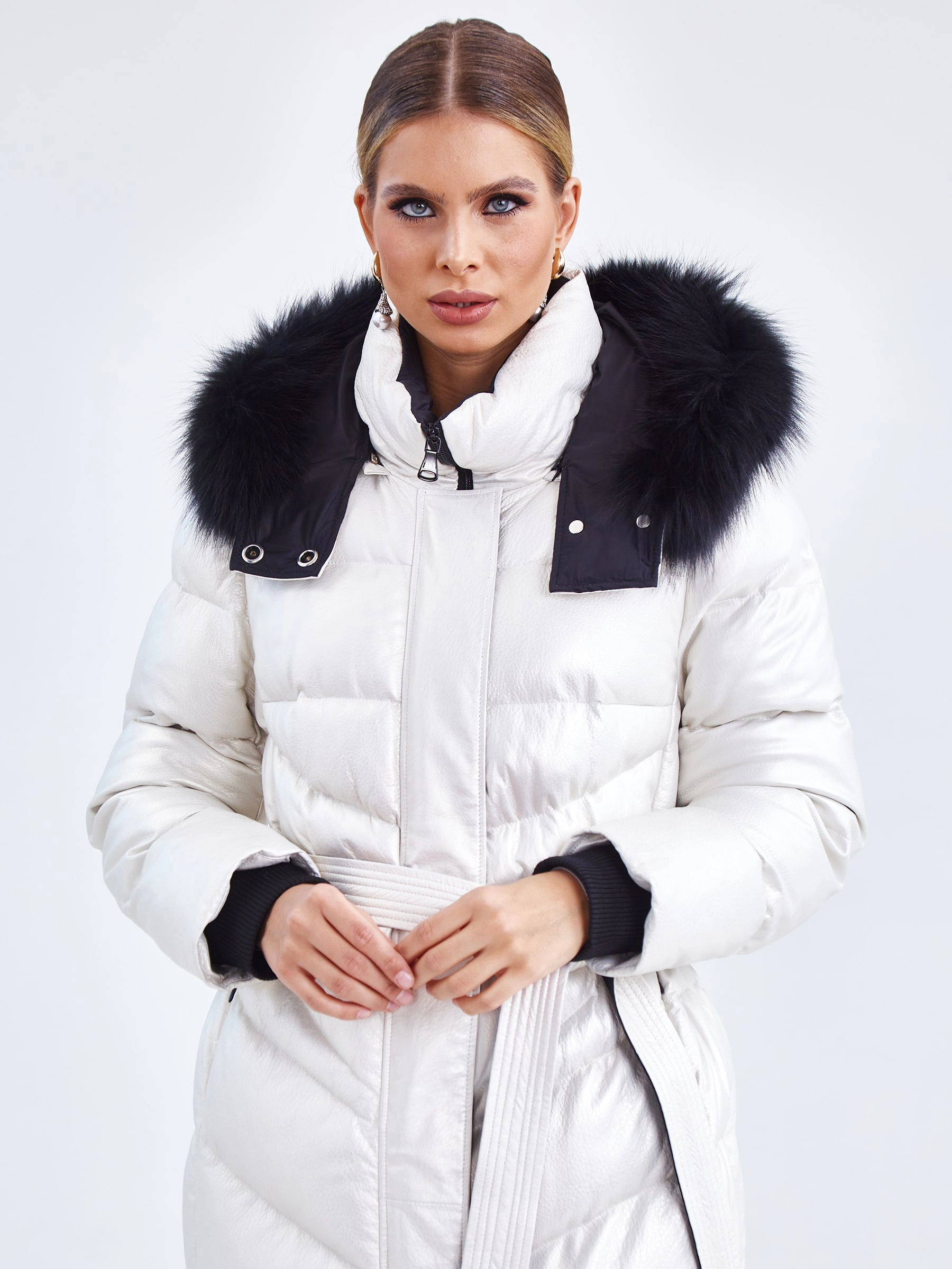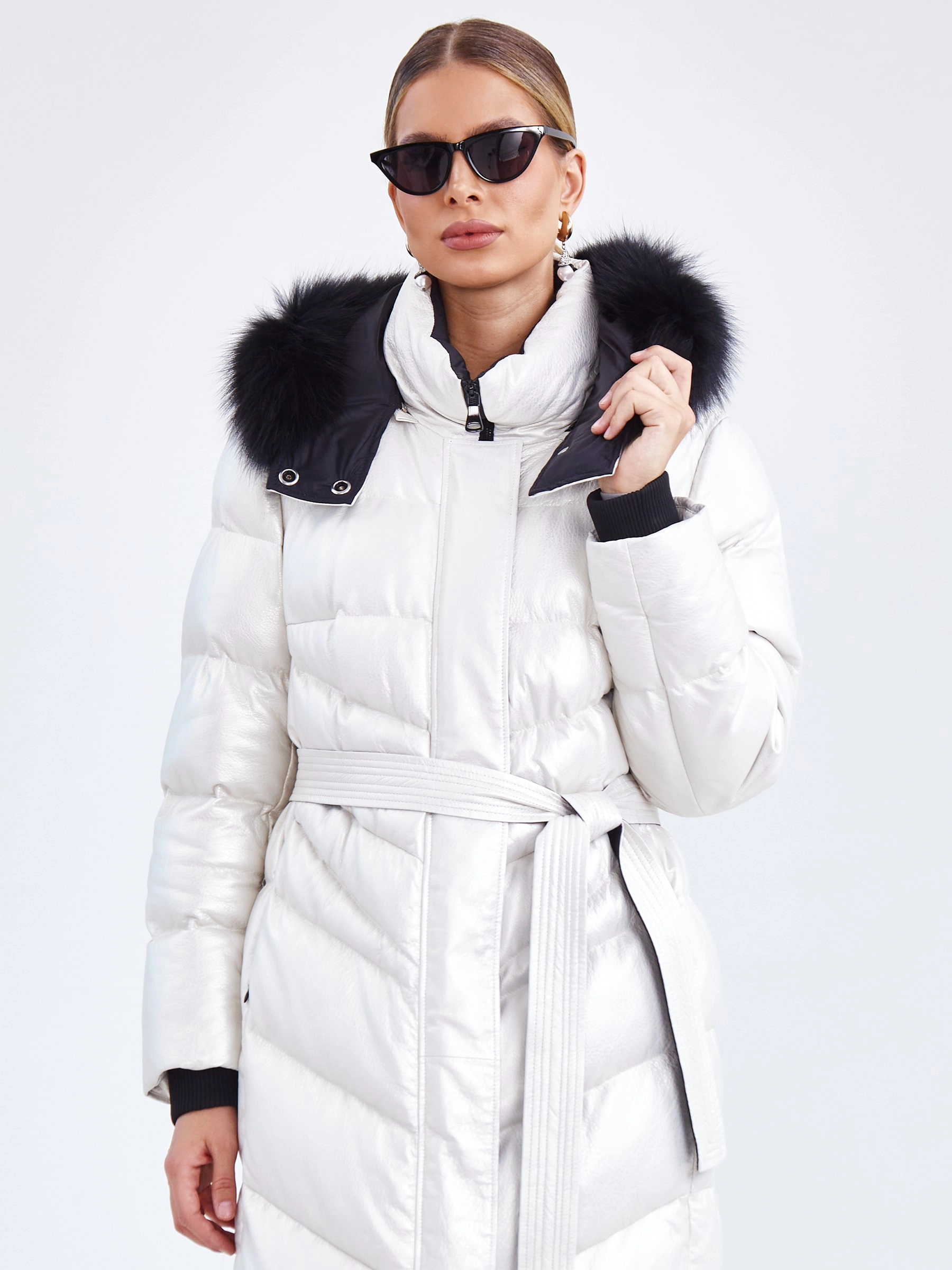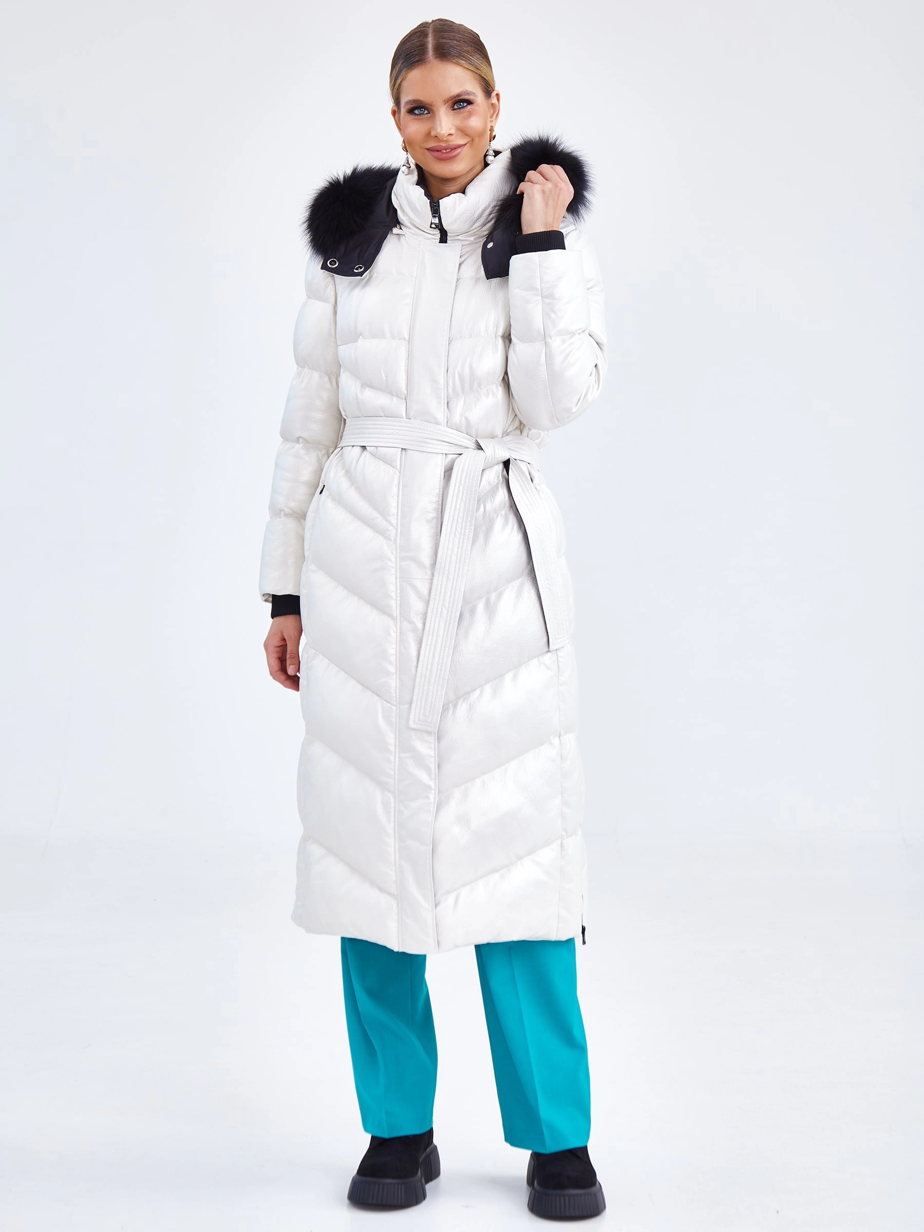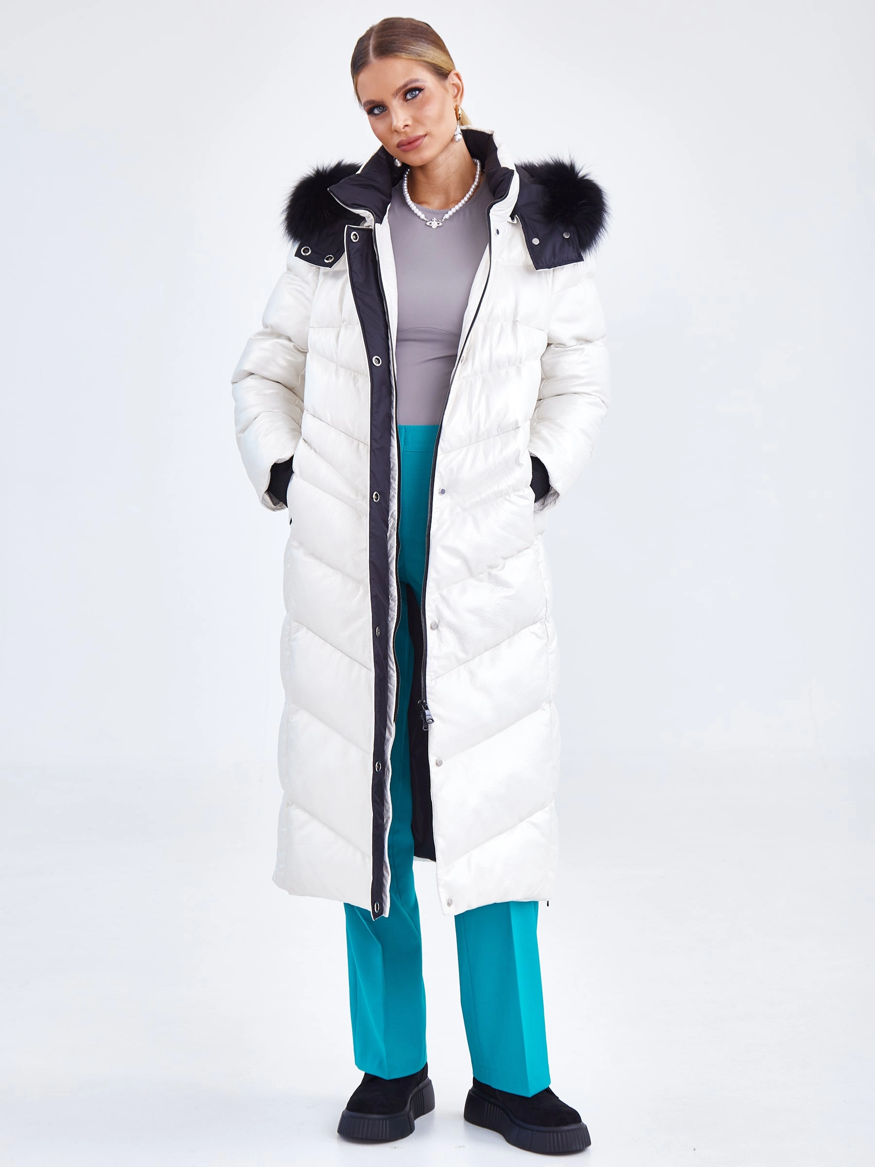 Белоснежное пальто-пуховик длиной более 90 см, сшитое из зернистой кожи с мягким перламутровым блеском, создаёт образ зимней сказки — словно искрящийся на солнце снег. Модель прямого кроя подчеркивает элегантность силуэта, а её функциональность продумана до мелочей: надёжная застёжка-молния, практичные боковые разрезы на молниях для удобства движения и, конечно, роскошный глубокий капюшон, декорированный пушистым натуральным мехом песца. Внутреннее наполнение обеспечивает идеальный микроклимат: подкладка из 100% полиэстера приятна к телу, а высокоэффективный утеплитель — немецкий синтепон Freudenberg — гарантирует тепло, воздухопроницаемость и лёгкость даже в морозные дни. Совет стилиста: Это пальто самодостаточно, поэтому выбирайте лаконичные сочетания. Носите его с монохромной базой глубоких тонов — тёмно-синими, графитовыми или чёрными брюками, платьем-футляром или водолазкой и джинсами скинни. Высокие сапоги-ботфорты или лаконичные ботильоны на каблуке завершат образ. Мех на капюшоне — уже яркий акцент, о