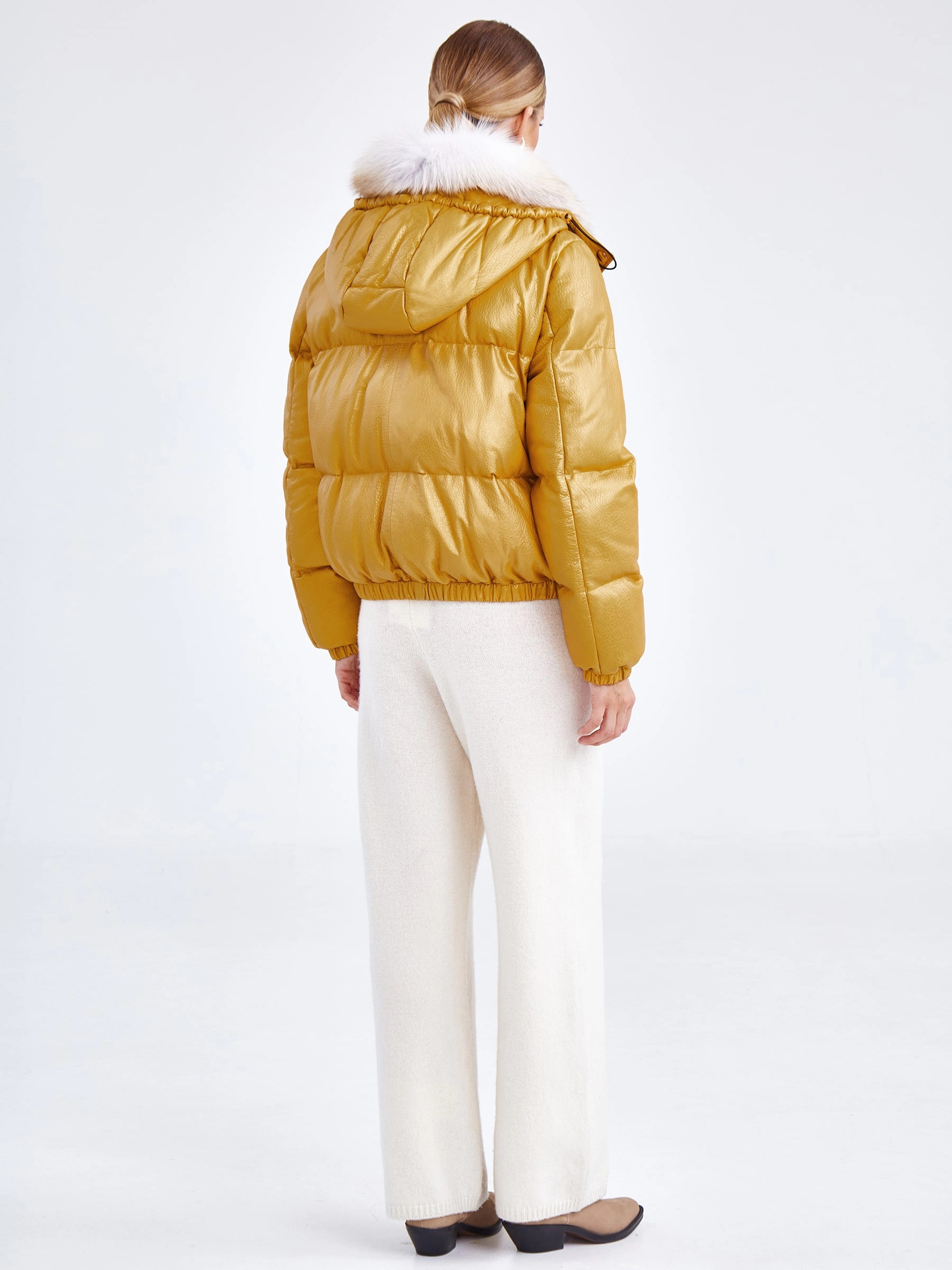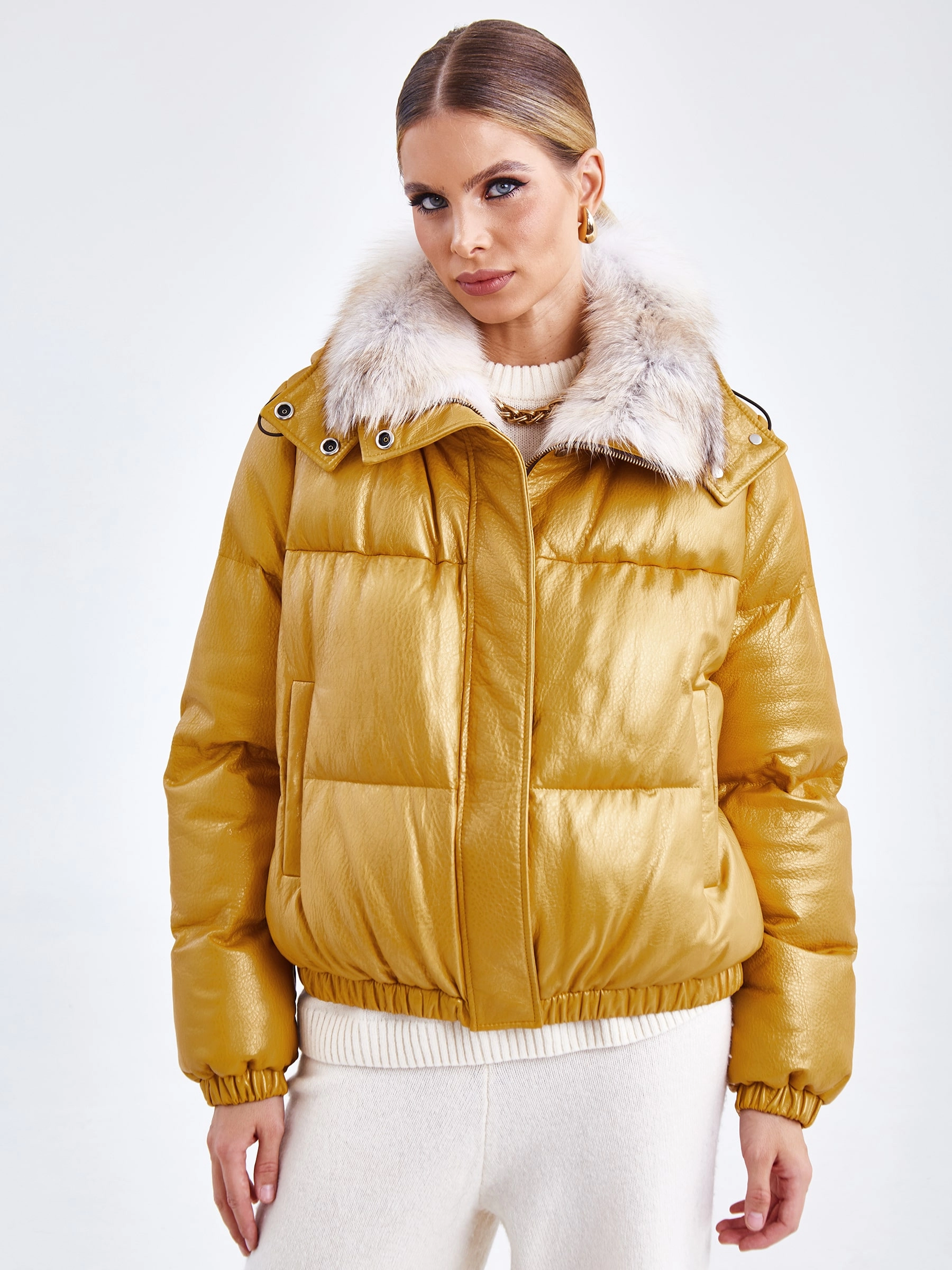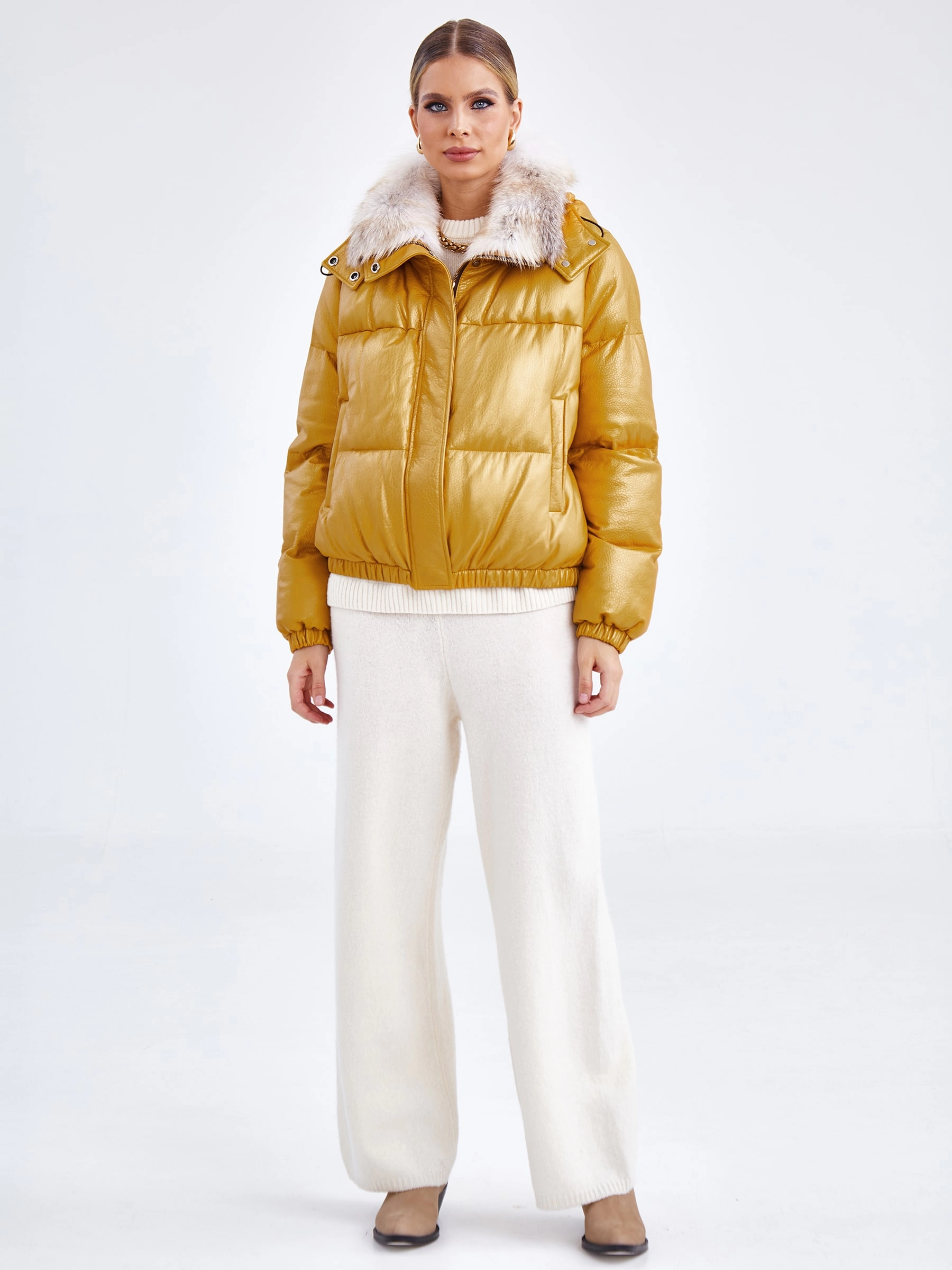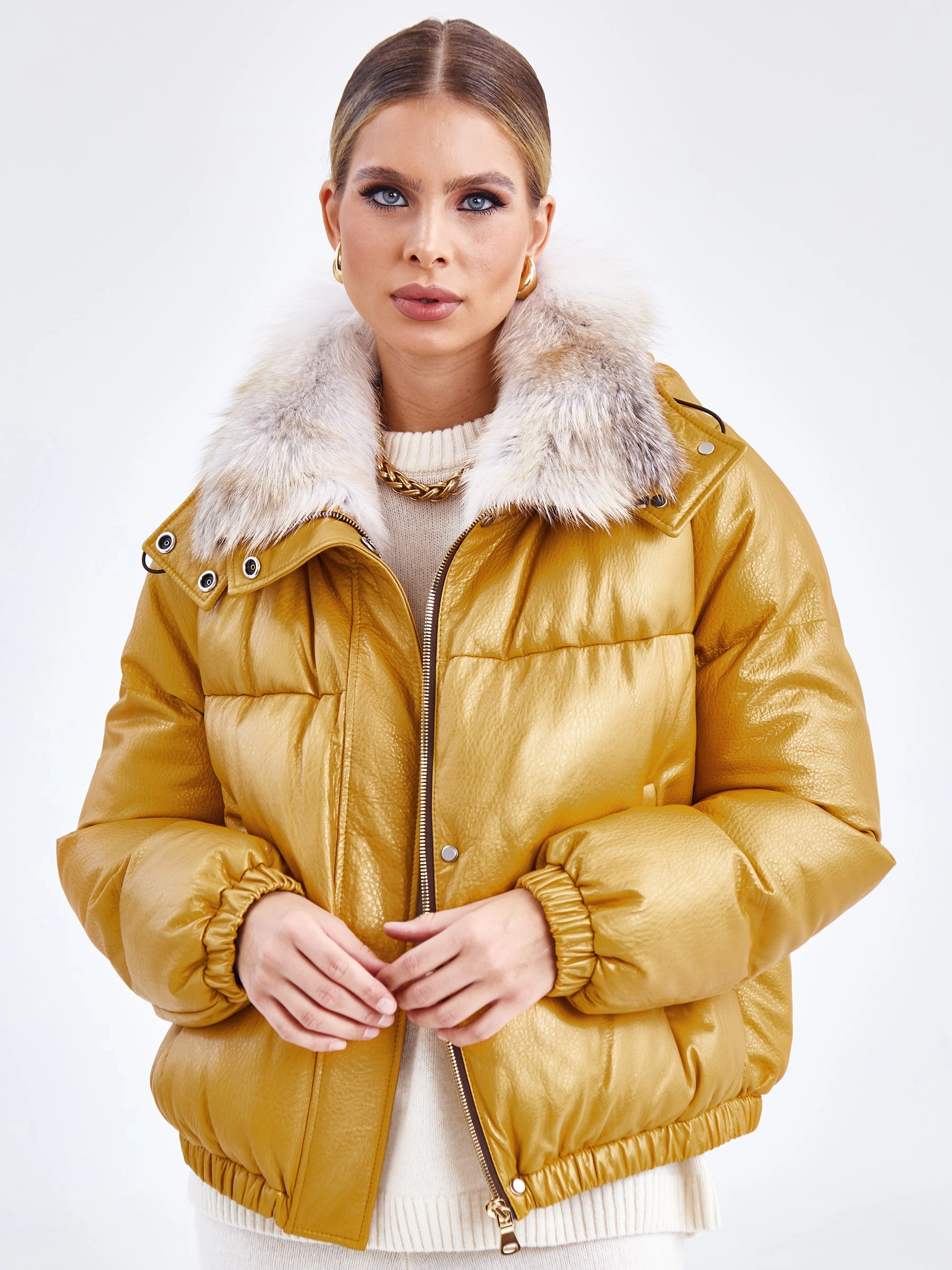 Короткий кожаный женский пуховик с меховым капюшоном премиум класса 3027, желтый, размер 44, артикул 25300
