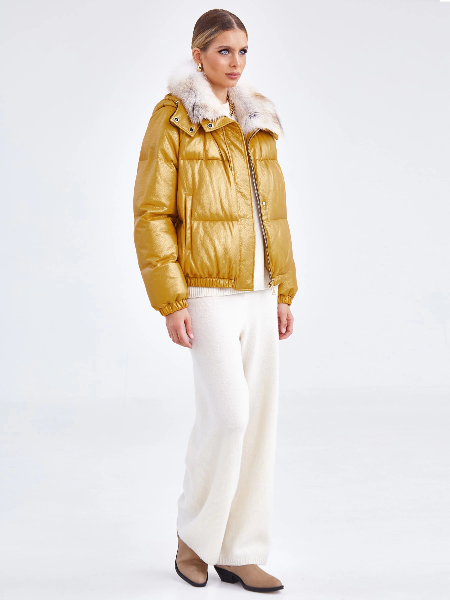 Товар короткий кожаный женский пуховик с меховым капюшоном премиум класса 3027, желтый, размер 44, артикул 25300 выполнен из натуральной кожи с застежкой молния. Рассчитан на сезон: осень-зима. Длина изделия 51-74 см, силуэт свободный.