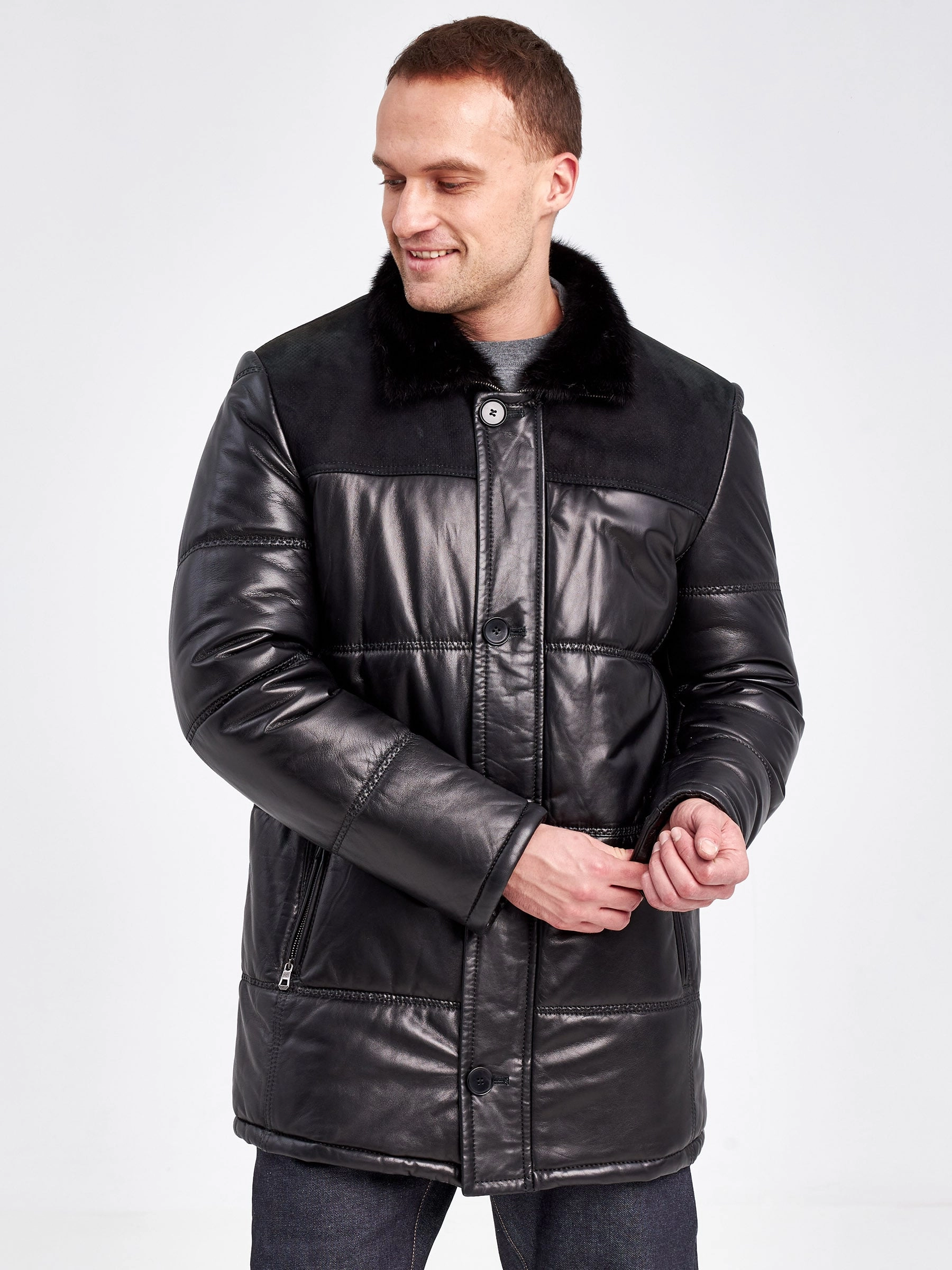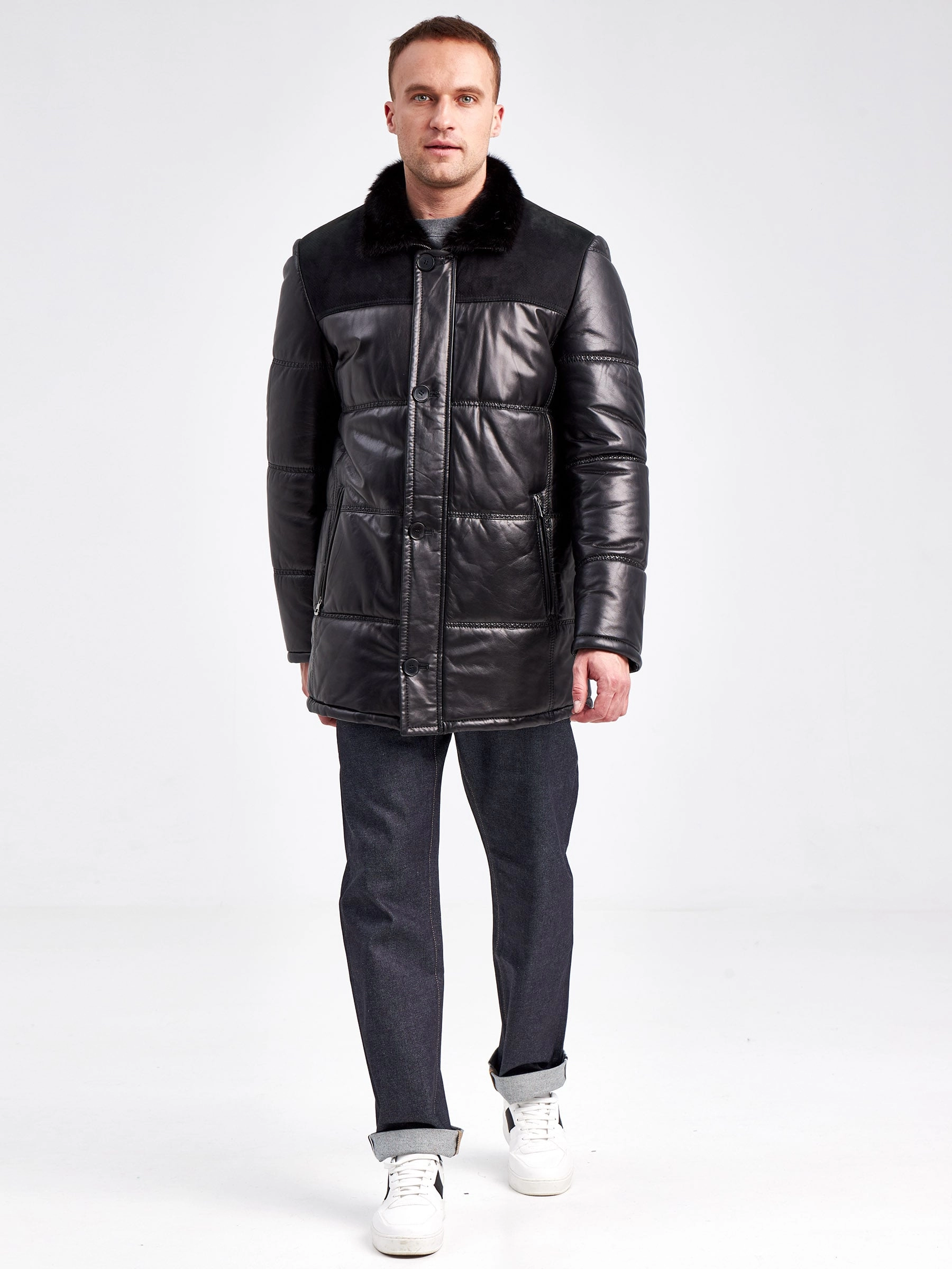 Товар зимний кожаный мужской пуховик с воротником меха норки 50014, черный, размер 50, артикул 40860 выполнен из натуральной кожи с застежкой молния. Рассчитан на сезон: осень-зима. Длина изделия 84 см, силуэт полуприлегающий.