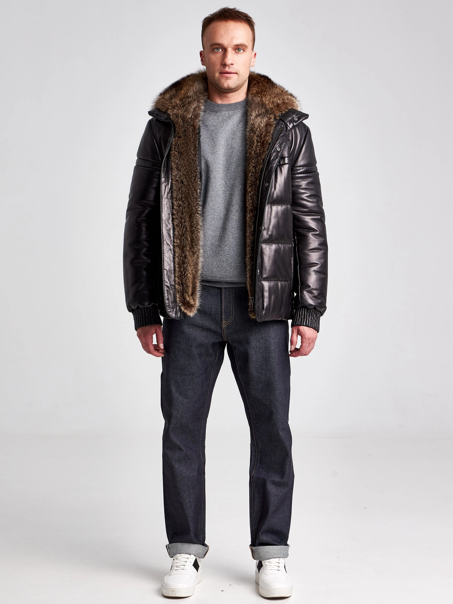 Кожаный мужской зимний пуховик с капюшоном и мехом енота 5468, черный, размер 46, артикул 40990