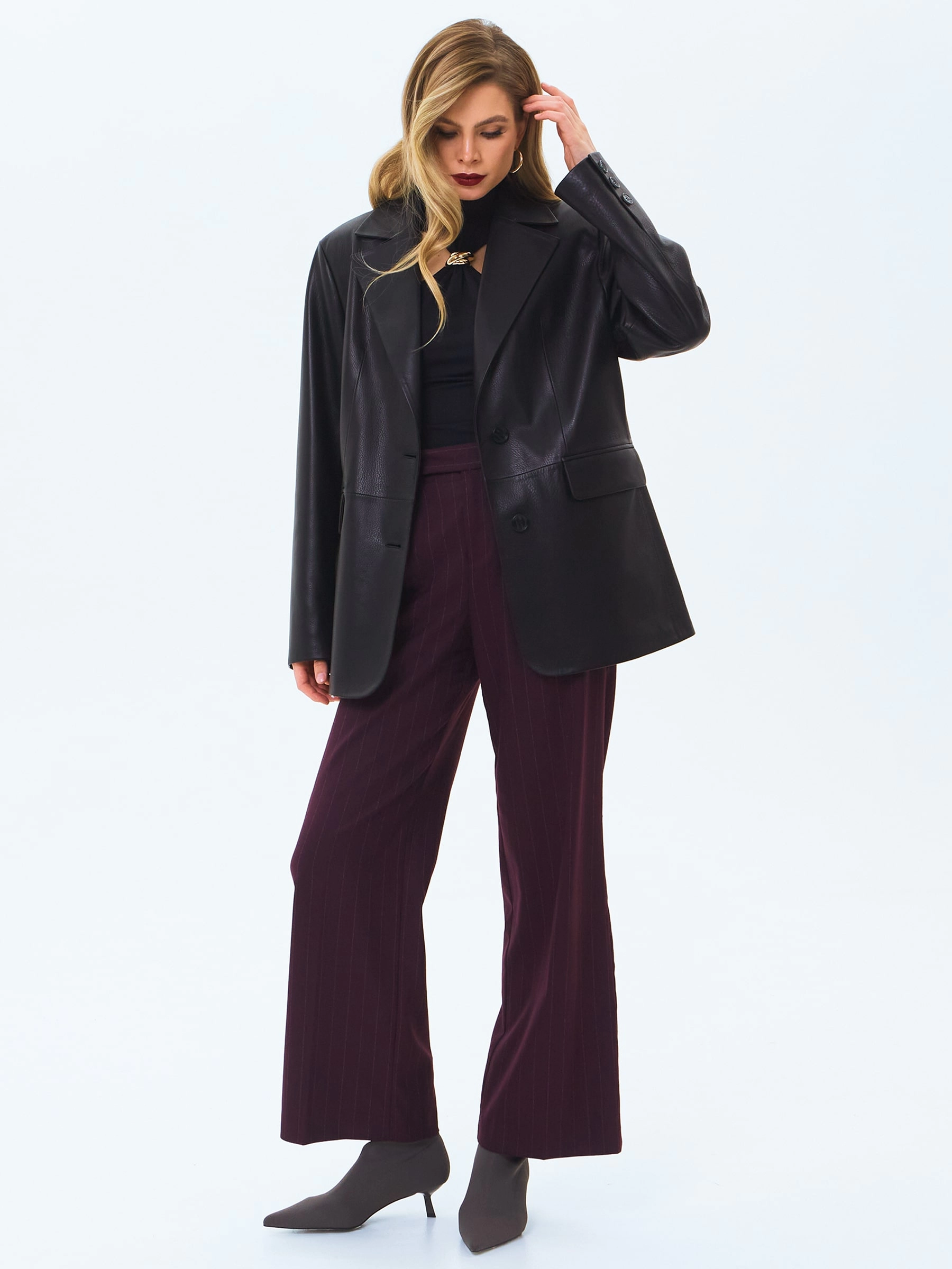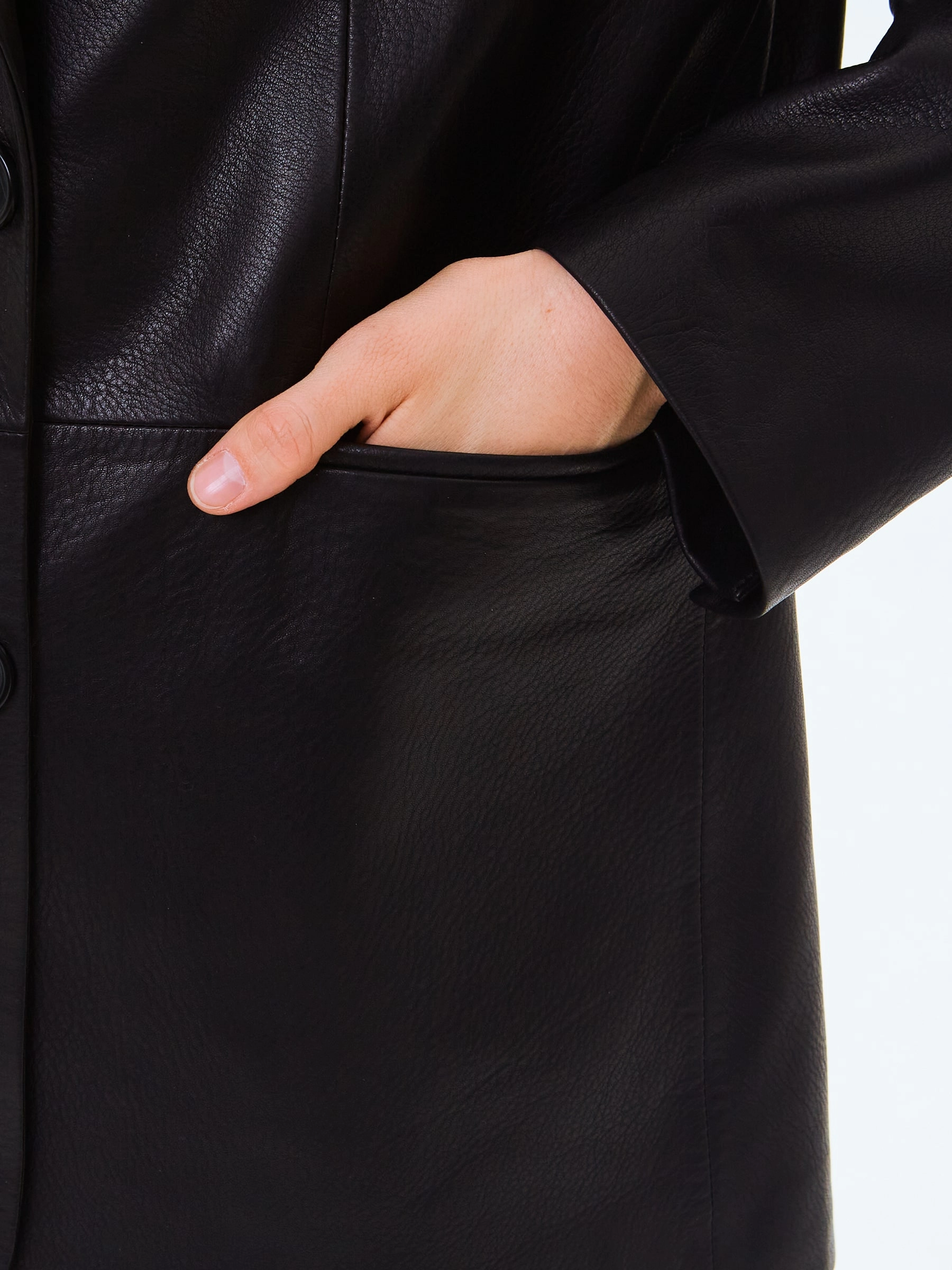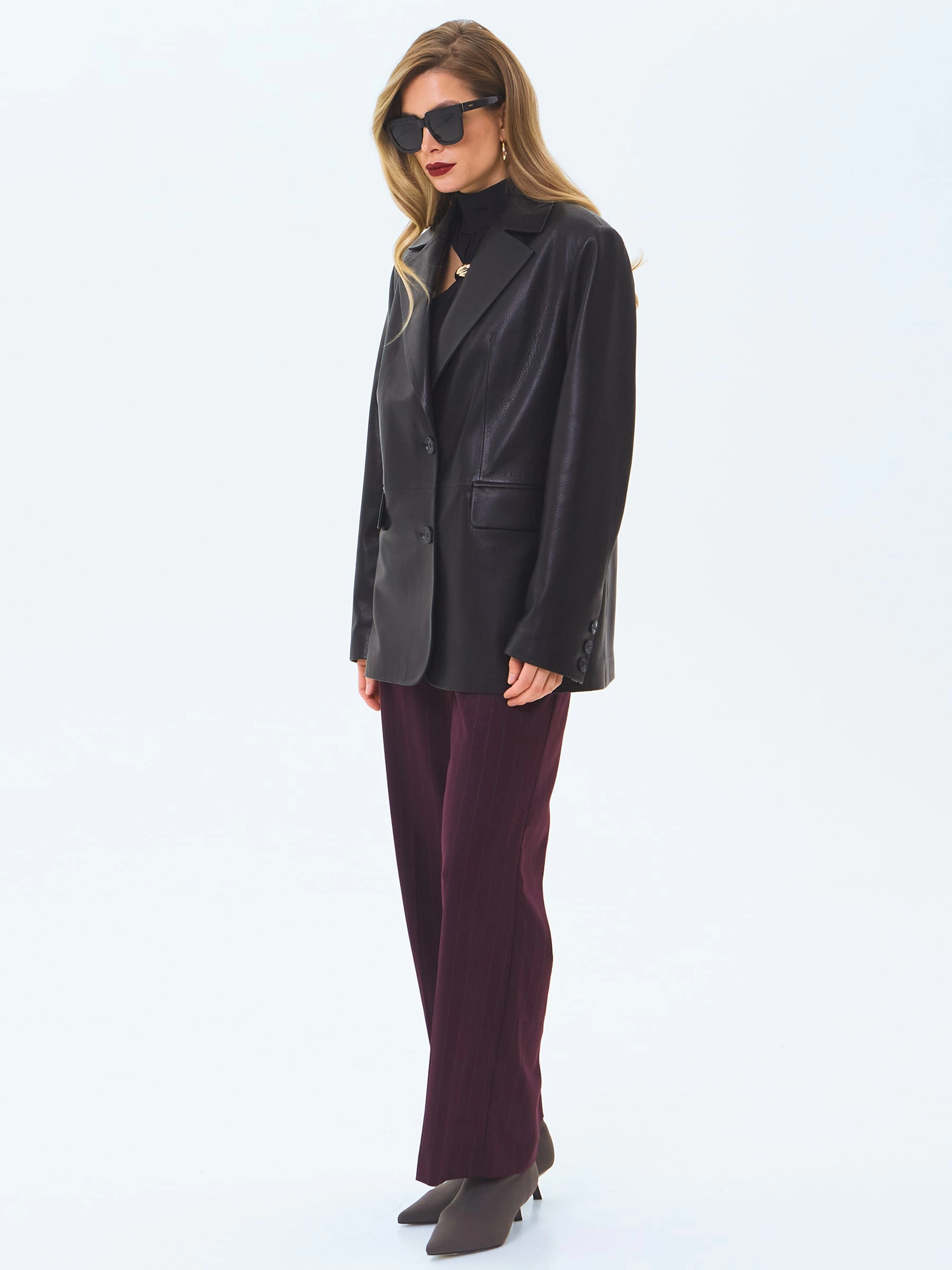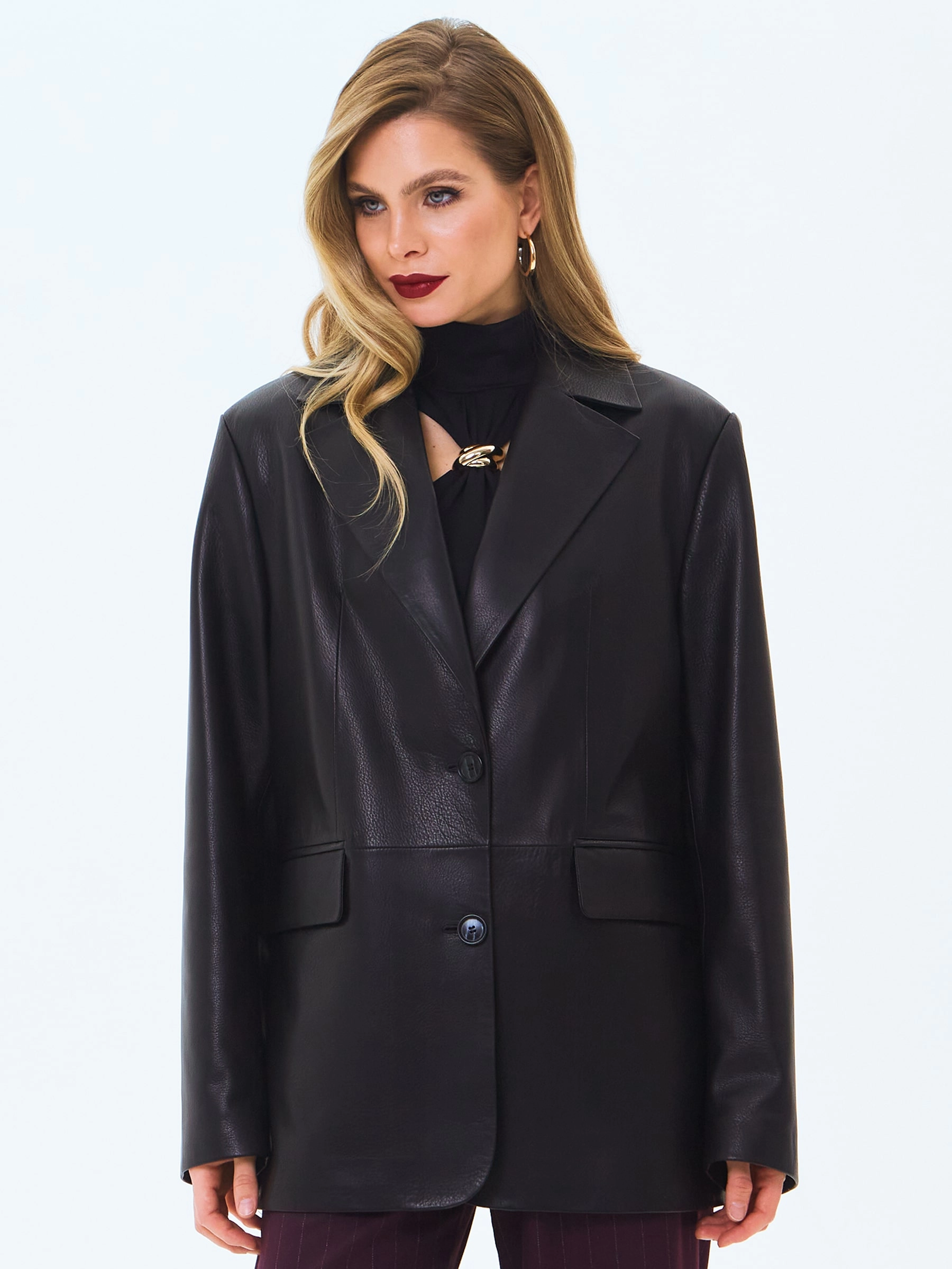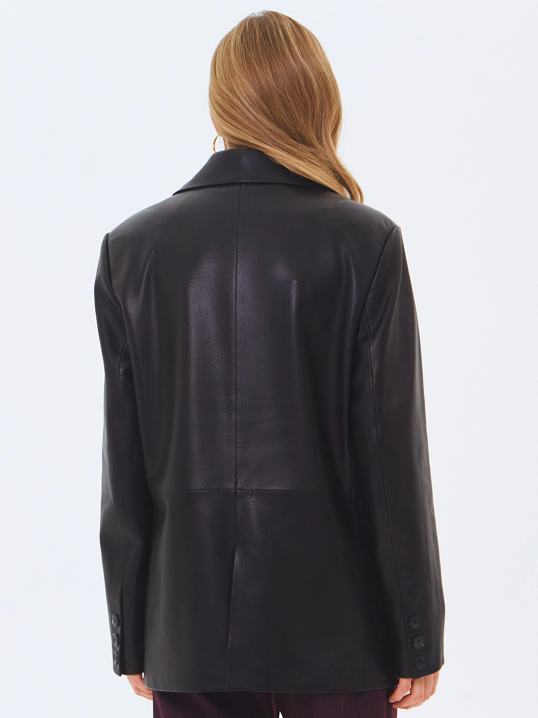 Пиджак с широкими лацканами выполнили из мягкой мелкозернистой кожи премиум класса. Прямой силуэт модели дополнили боковыми карманами с клапанами и шлицей сзади. Изделие застегивается двумя пуговицами.