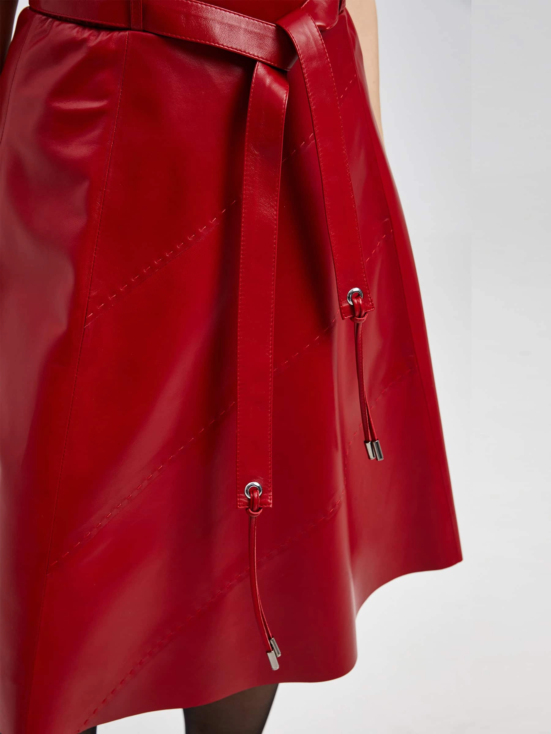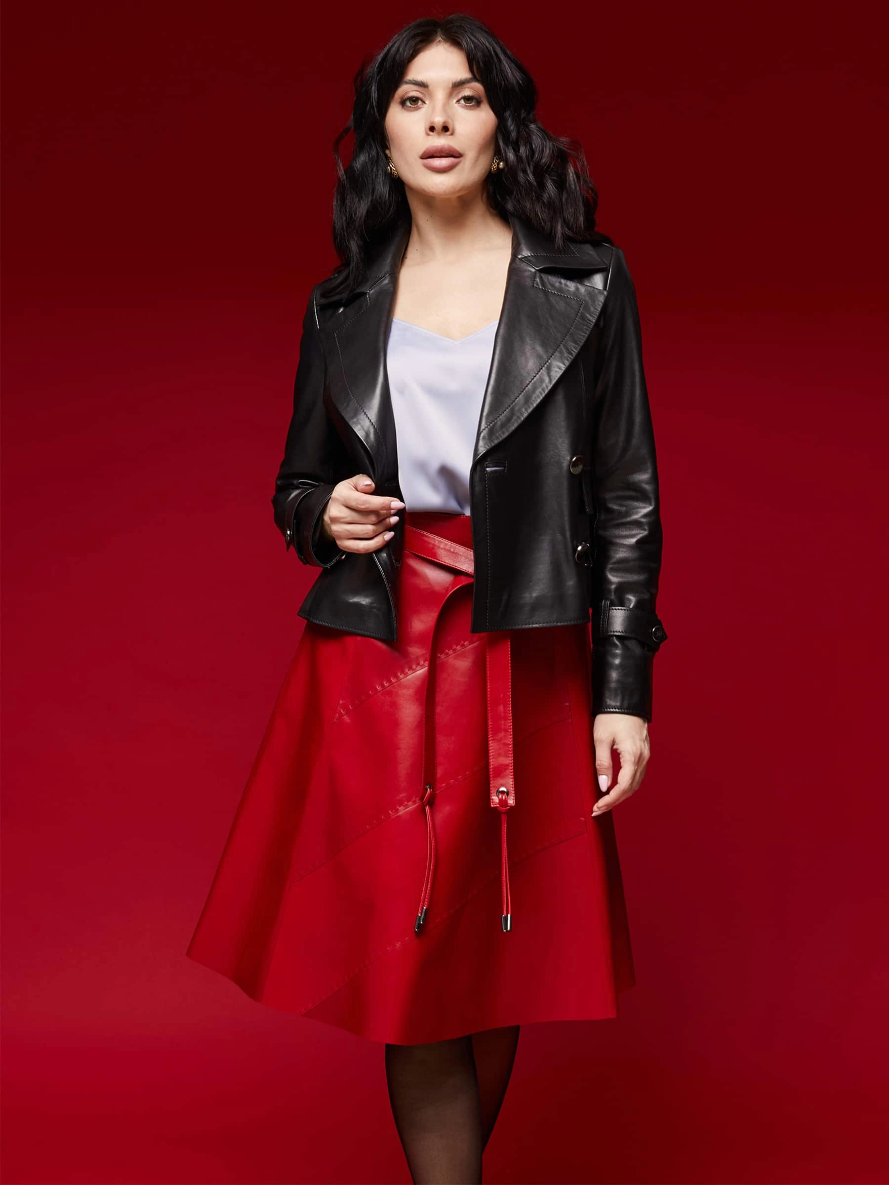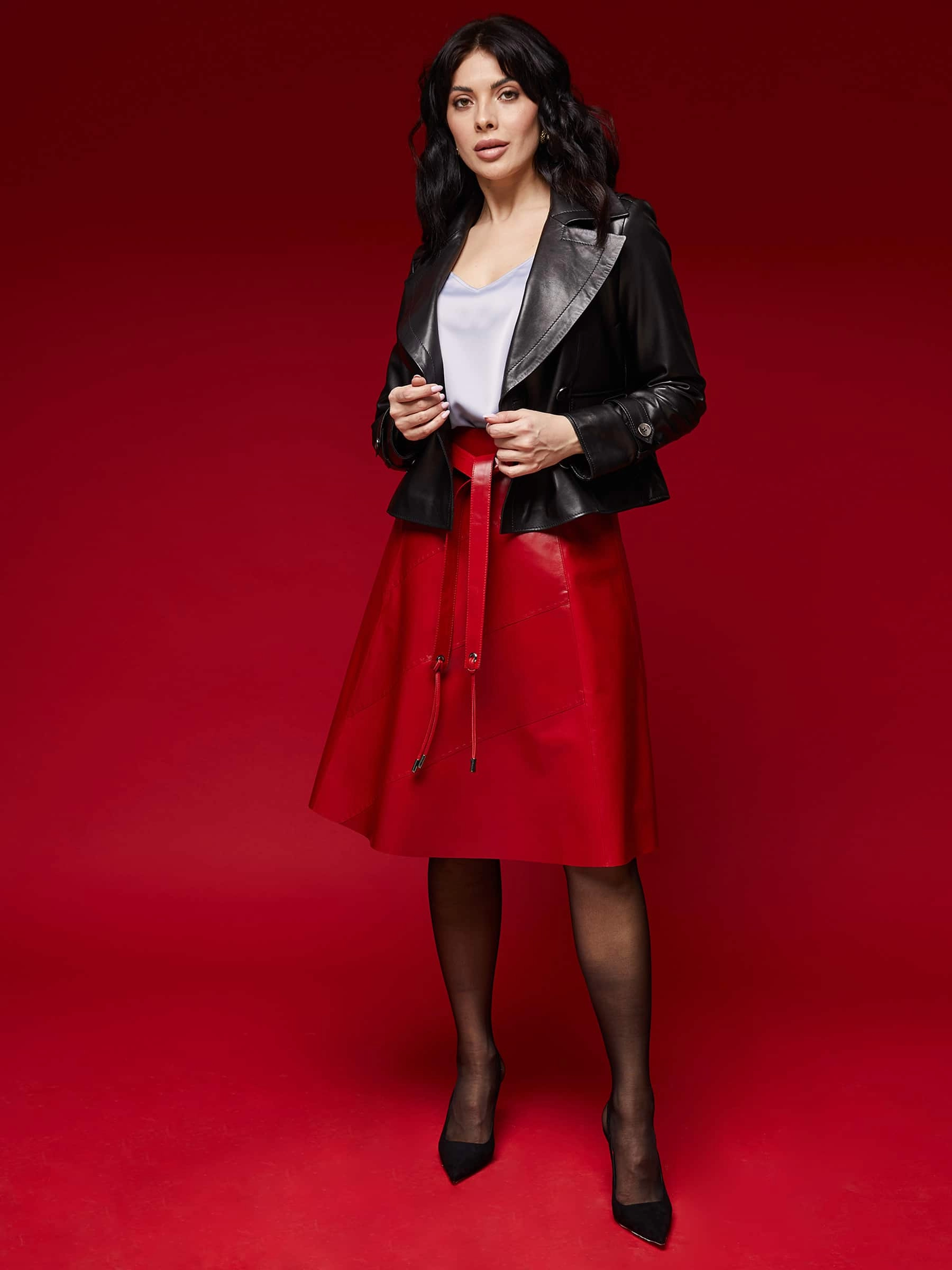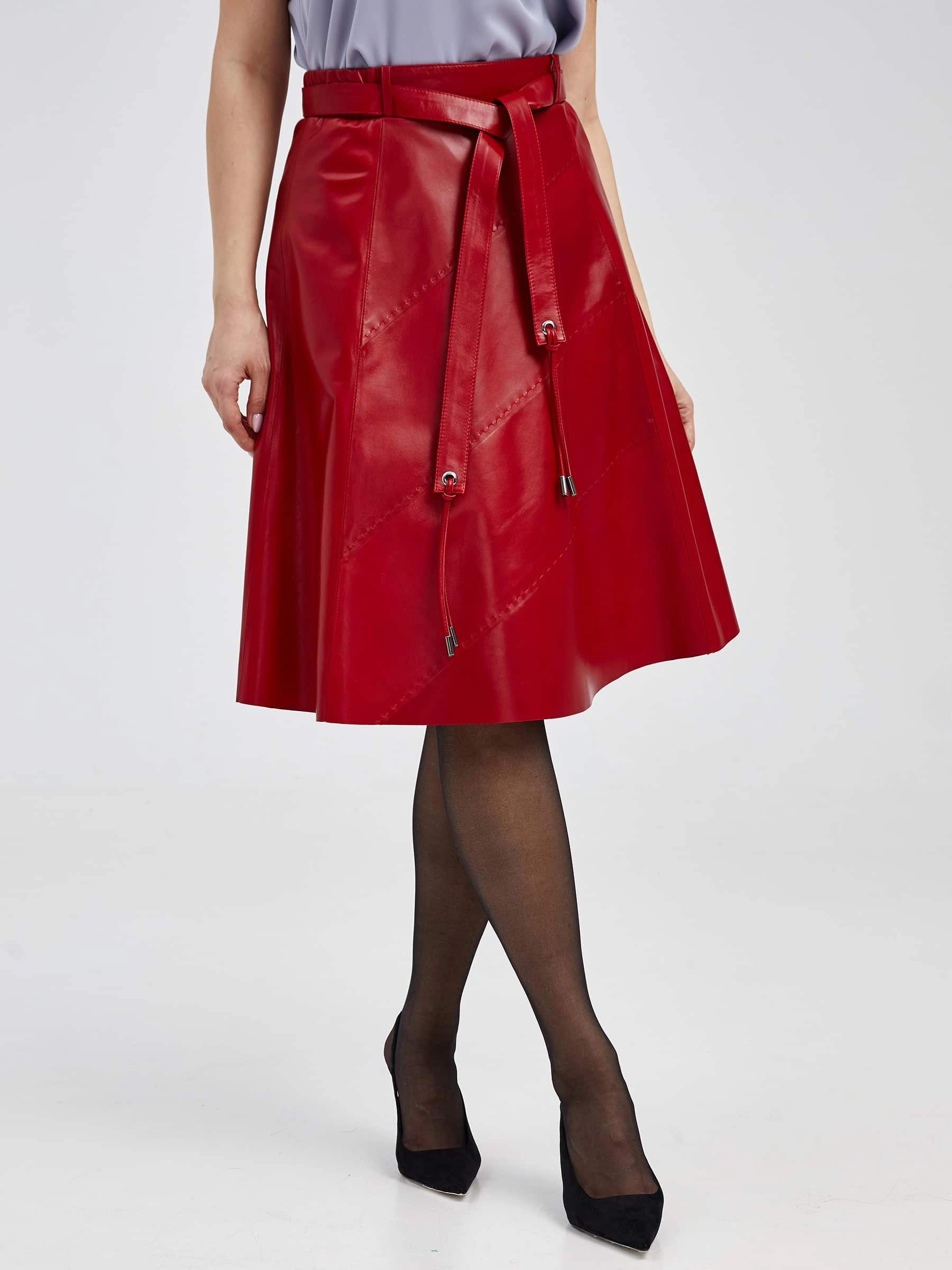 Товар красная кожаная юбка 01рс, размер 52, артикул 85142 выполнен из натуральной кожи с застежкой молния. Рассчитан на сезон: демисезон. Длина изделия 70 см, силуэт расклешенный.