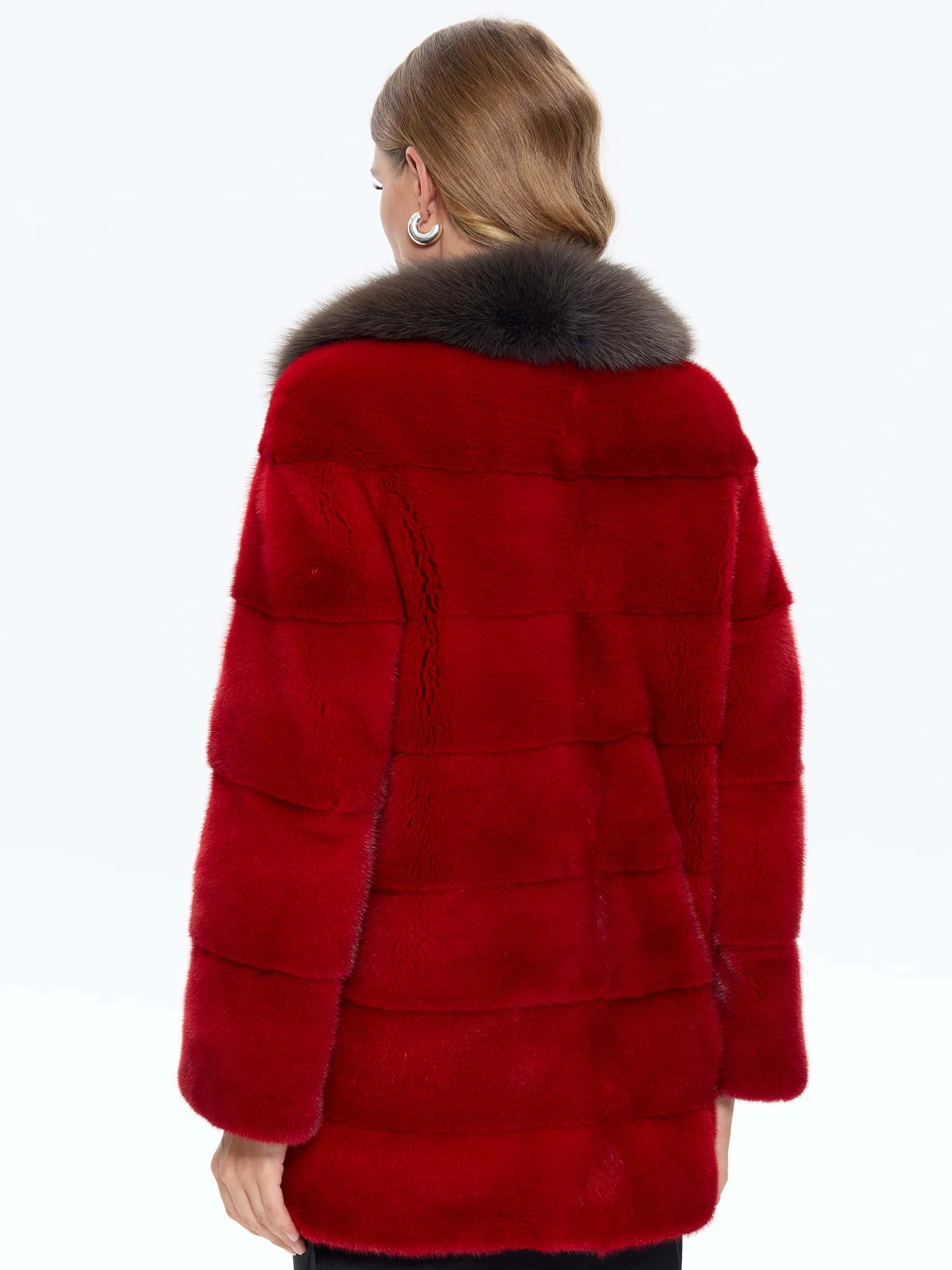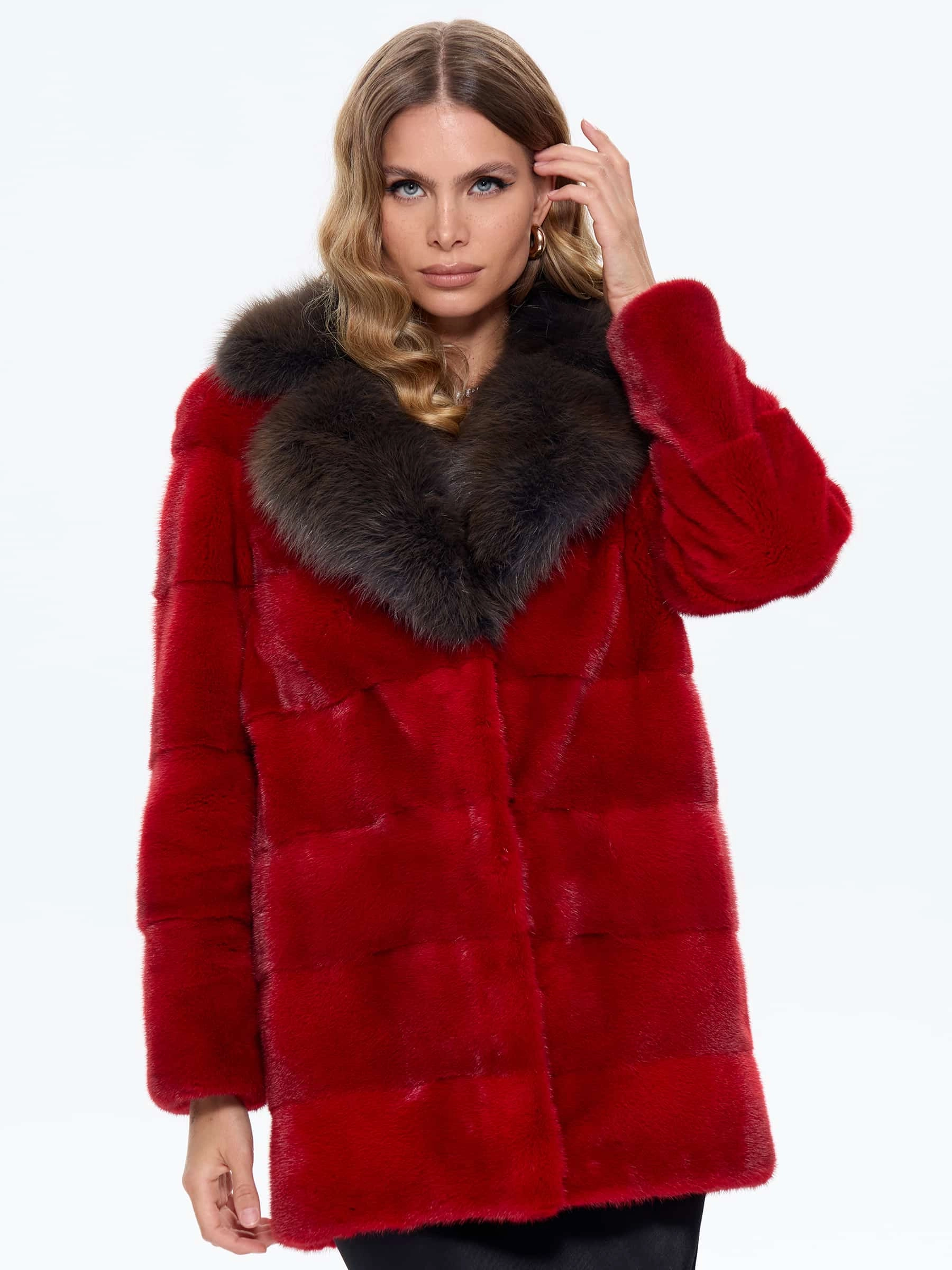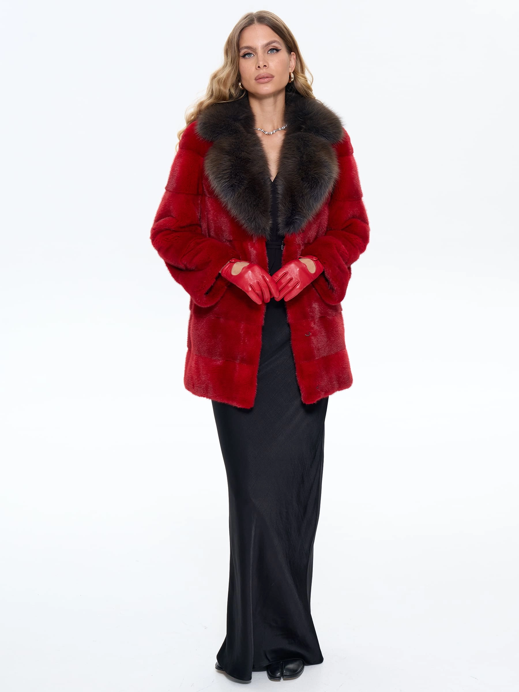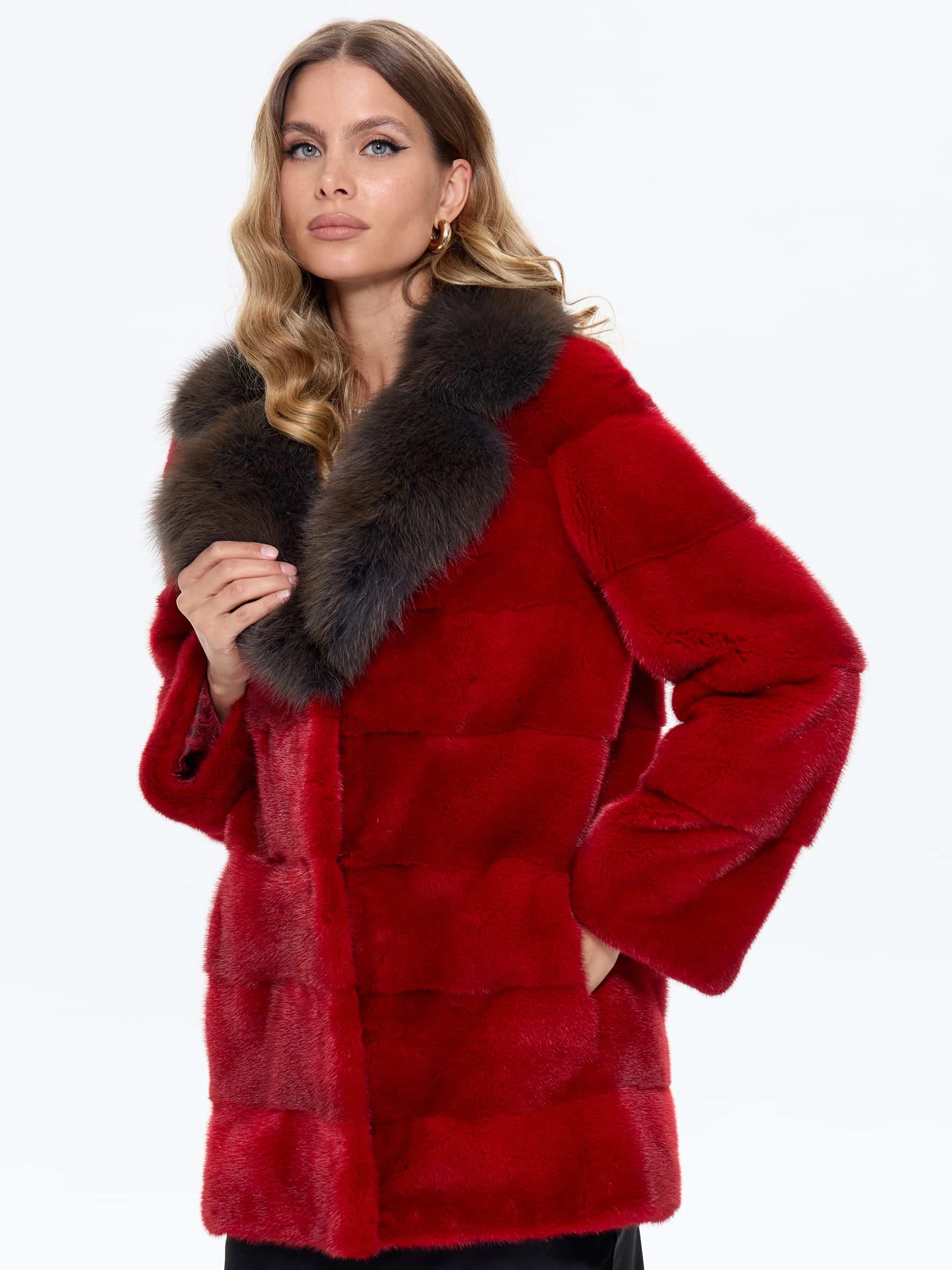 Элегантная короткая шуба из шелковистого красного меха норки с роскошным английским воротником, отделанным дымчатой куницей. Модель прямого силуэта с поперечной раскладкой меха и врезными карманами сочетает в себе классическую строгость и яркую индивидуальность. Рекомендация стилиста: эту эффектную шубу стоит носить с монохромными комплектами в черной или бежевой гамме — узкими брюками и лаковыми сапогами-ботфортами для создания дерзкого образа, либо с платьем-футляром и туфля-лодочками для вечернего выхода. Идеальный выбор для смелых модниц, ценящих внимание к деталям и безупречный стиль.