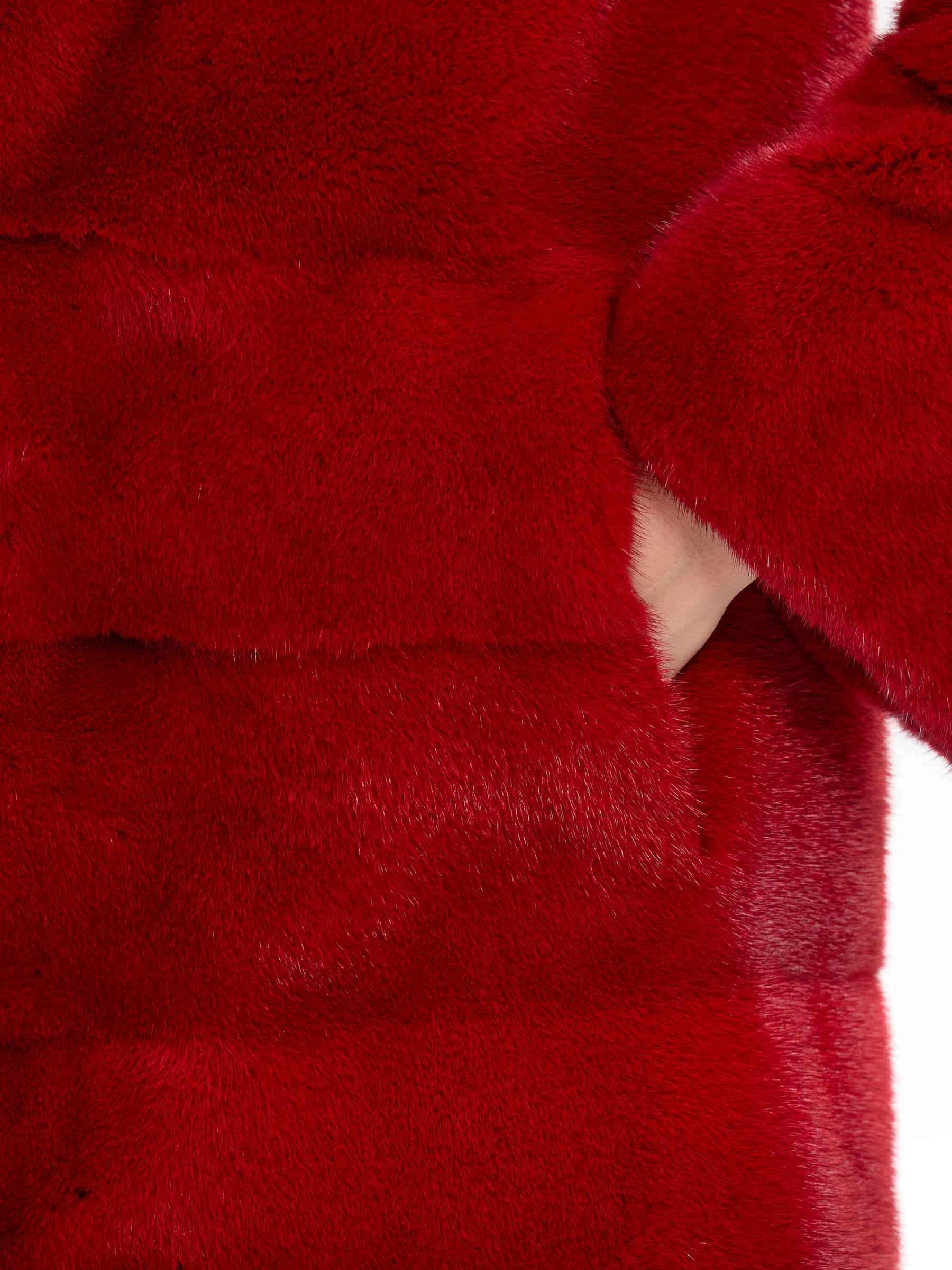 Товар красная норковая шуба с куницей 2б, размер 44, артикул 65180 выполнен из мех норки с застежкой клипсы. Рассчитан на сезон: зима. Длина изделия 75 см, силуэт прямой.