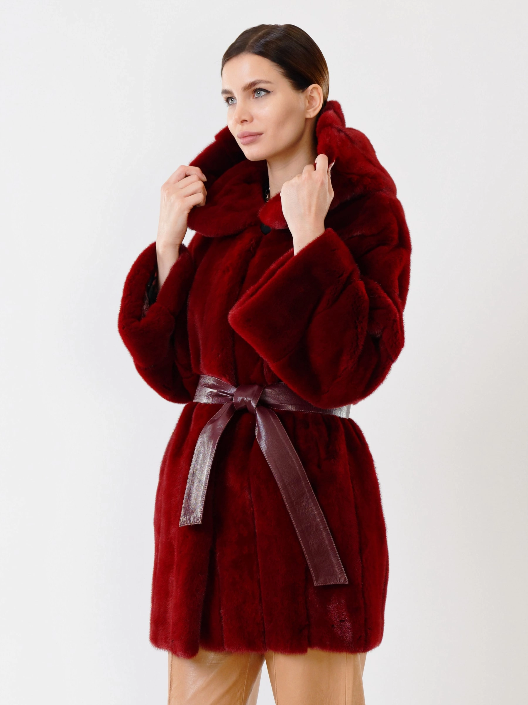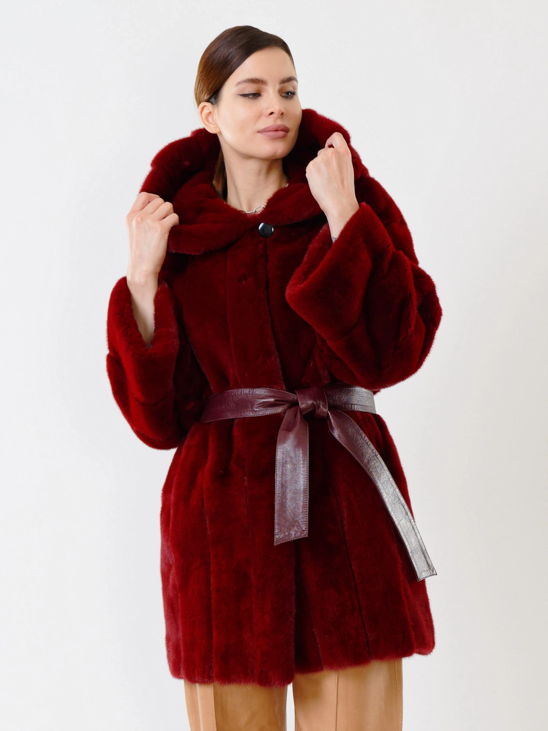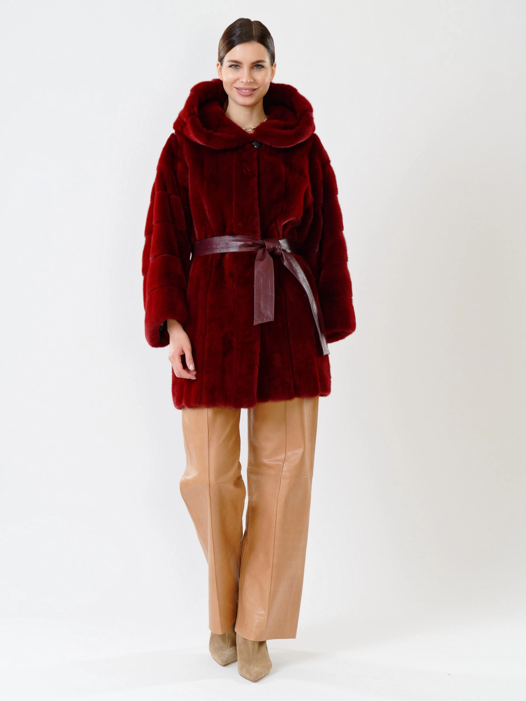 Куртка из меха норки с капюшоном женская 281(к), бордовая, размер 46, артикул 32710