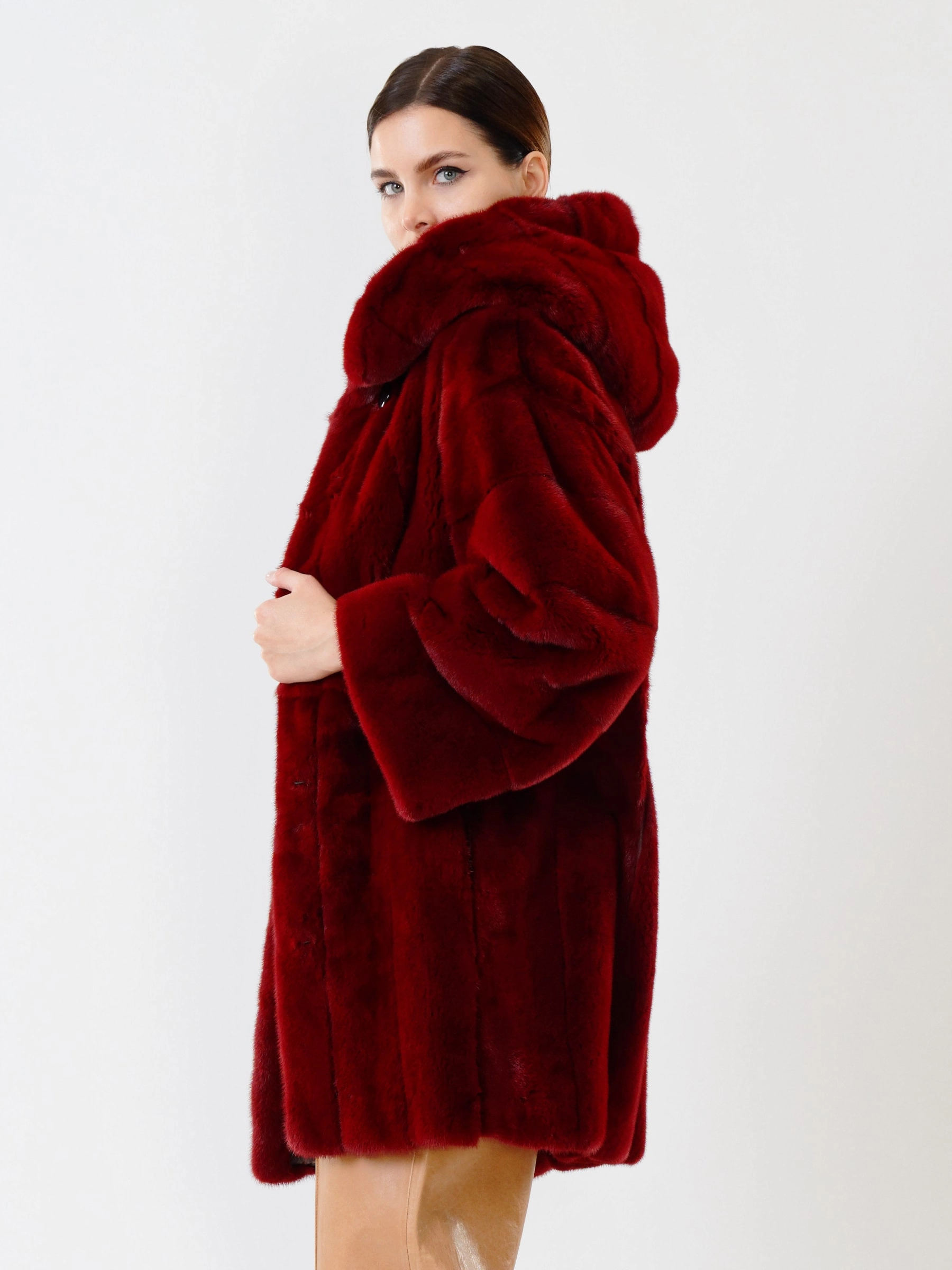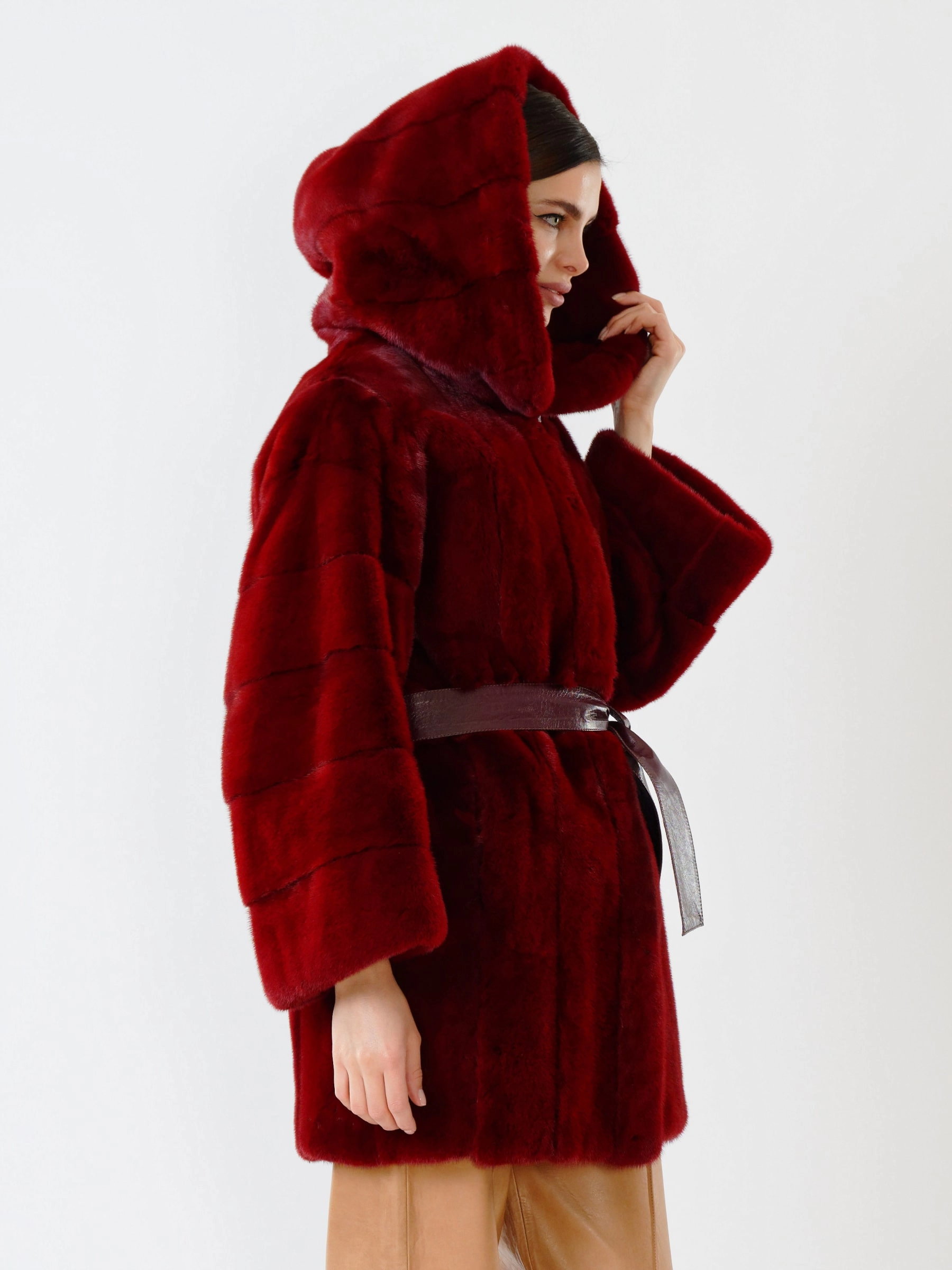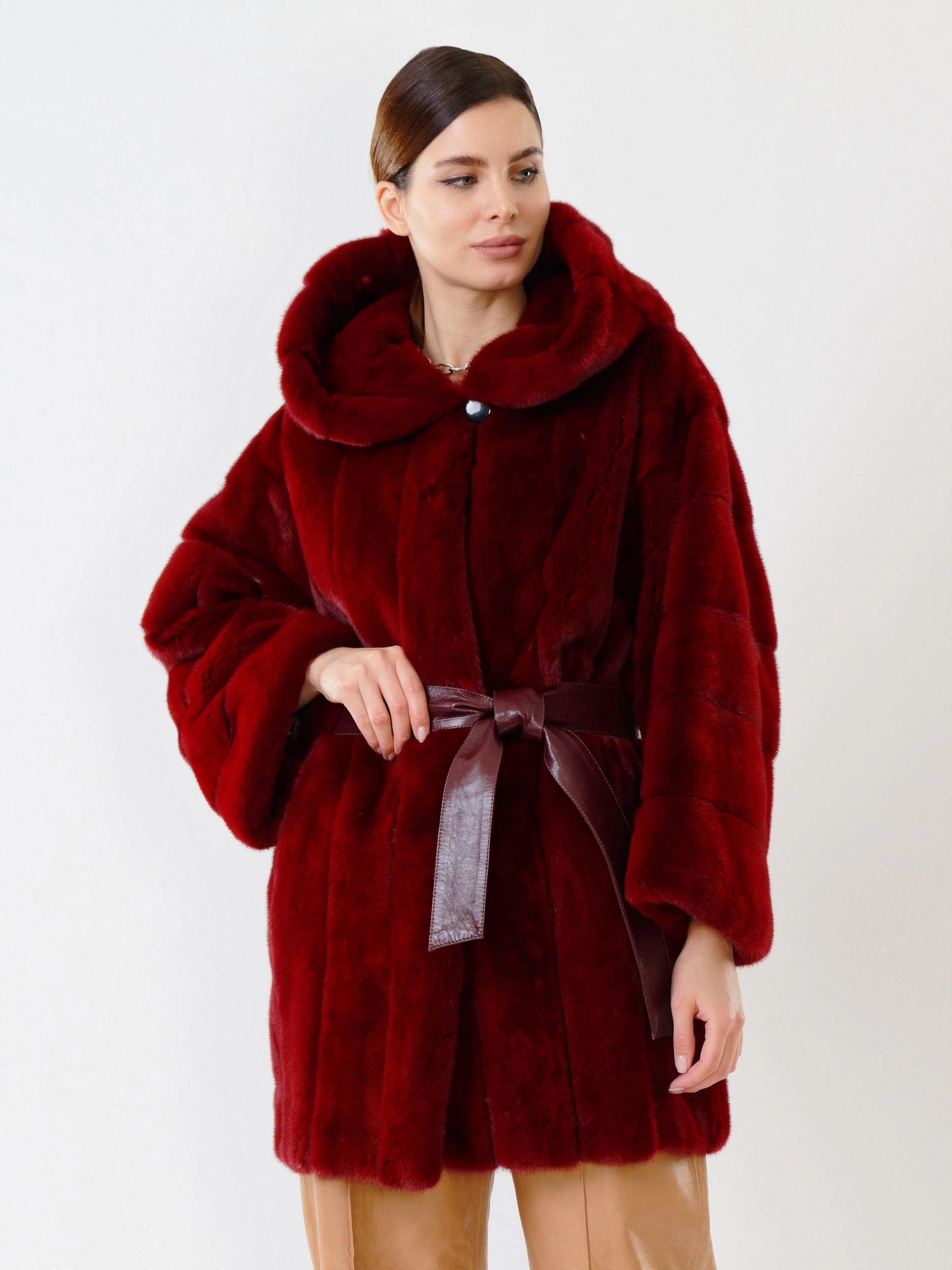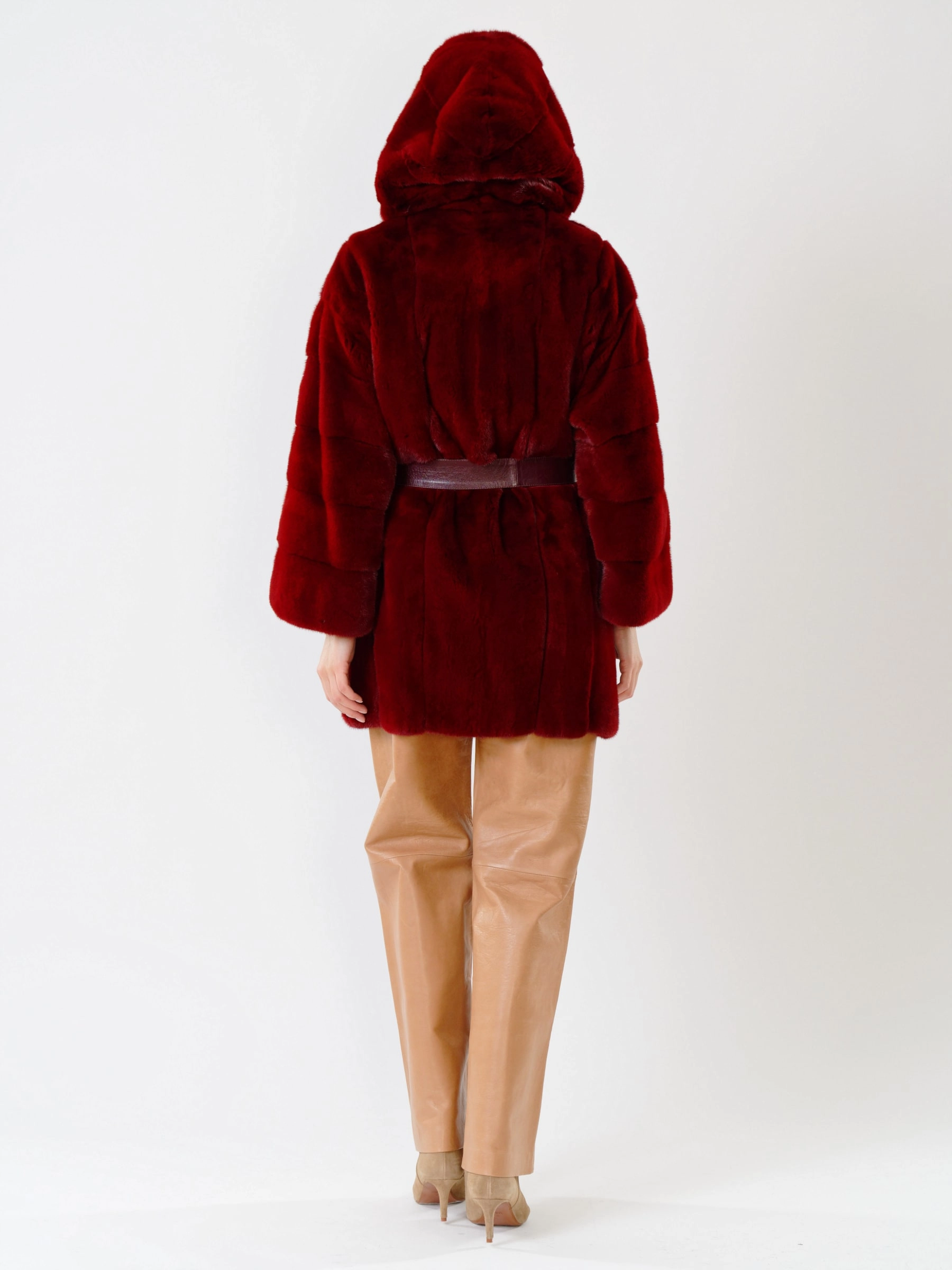 Куртка из меха норки с капюшоном женская 281(к), бордовая, размер 46, артикул 32710