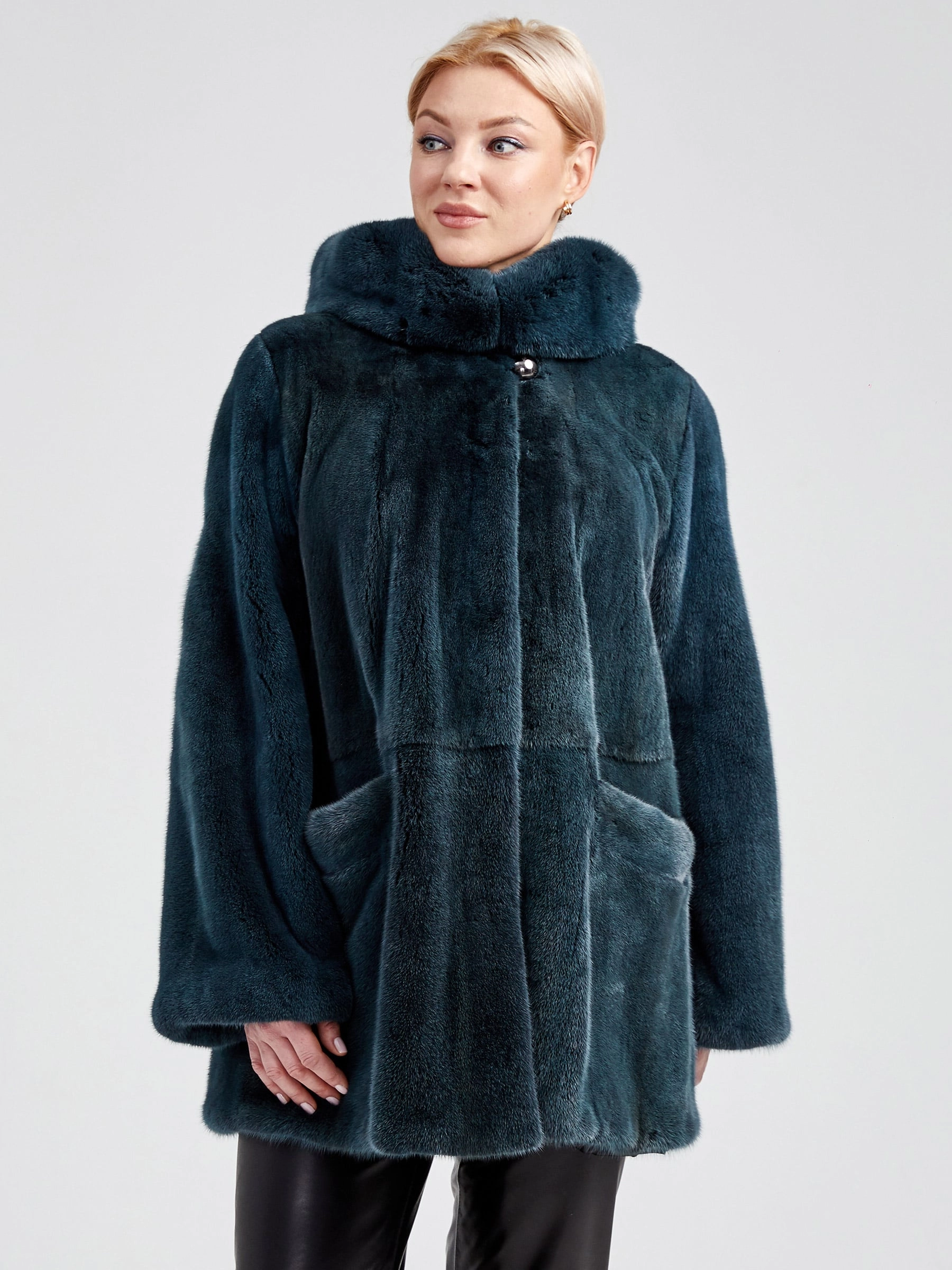 Товар женская норковая шуба автоледи с капюшоном премиум класса nina, зеленая, размер 56, артикул 32990 выполнен из норка крашенной с застежкой клипсы. Рассчитан на сезон: осень-зима. Длина изделия 75-90 см, силуэт прямой.