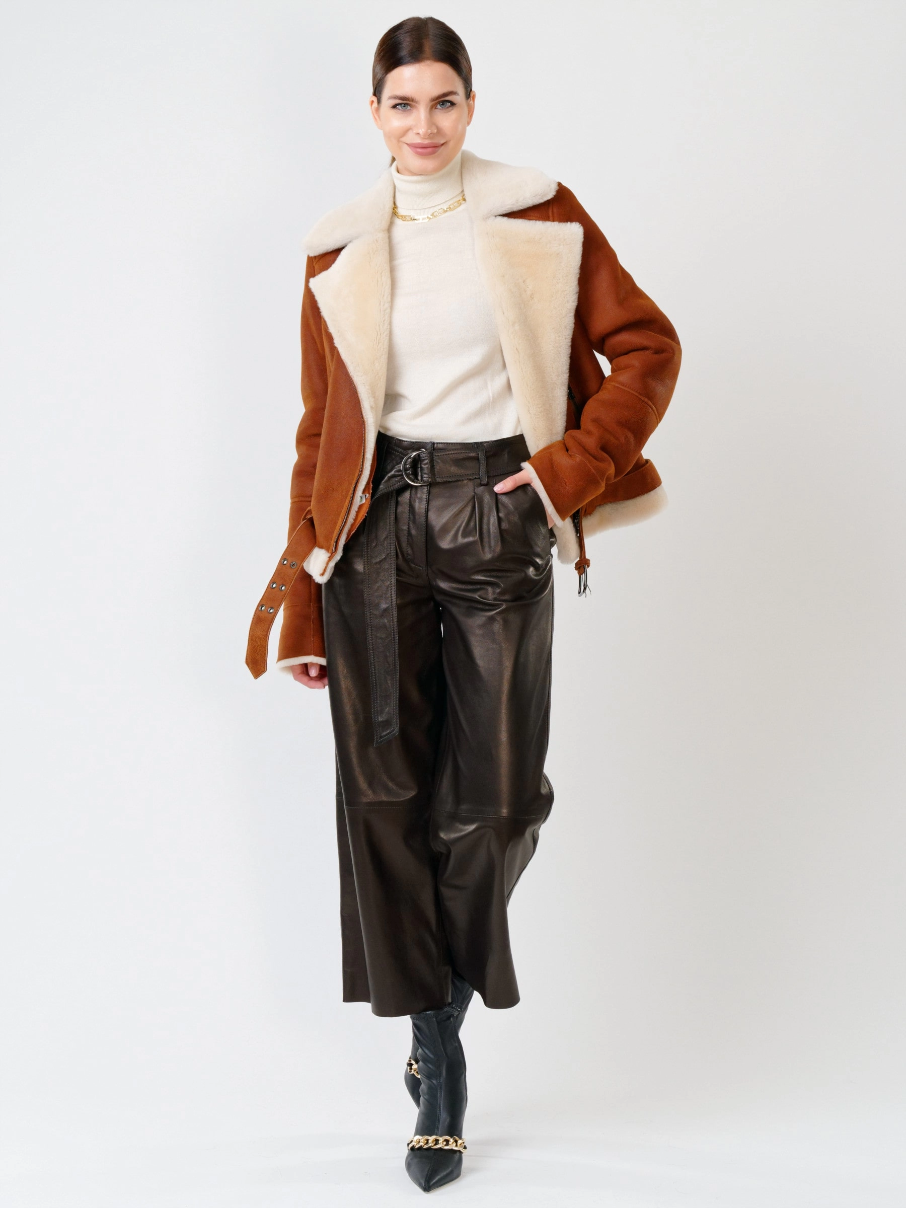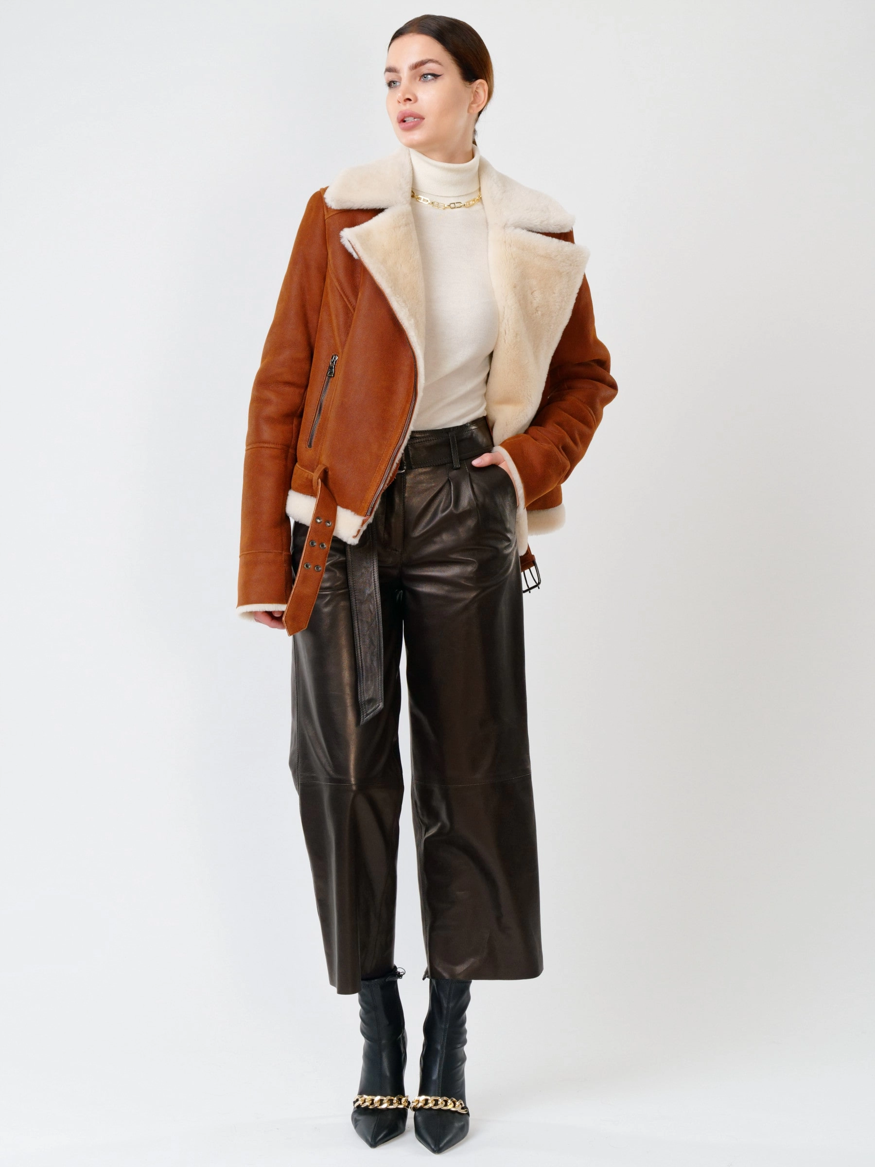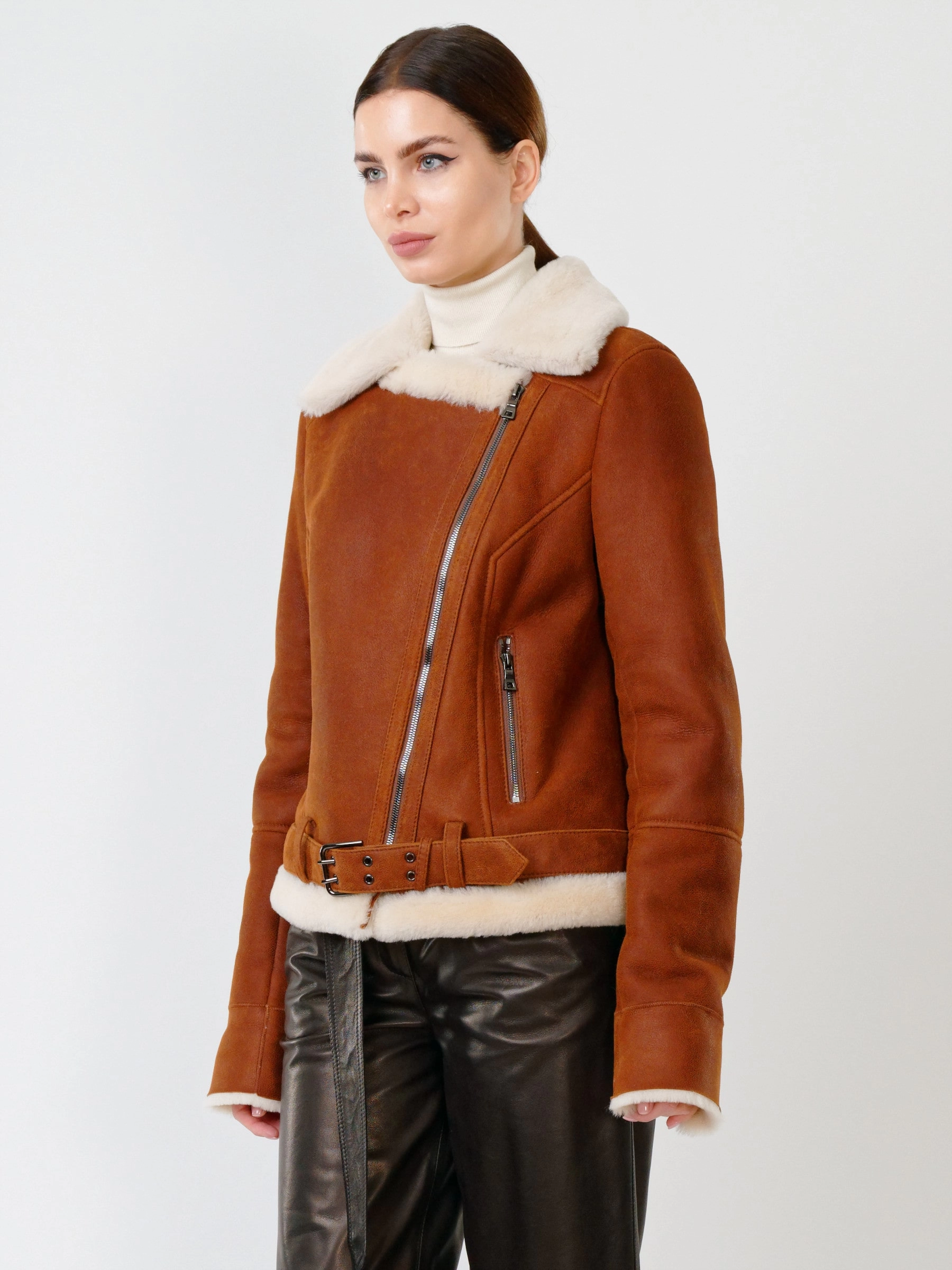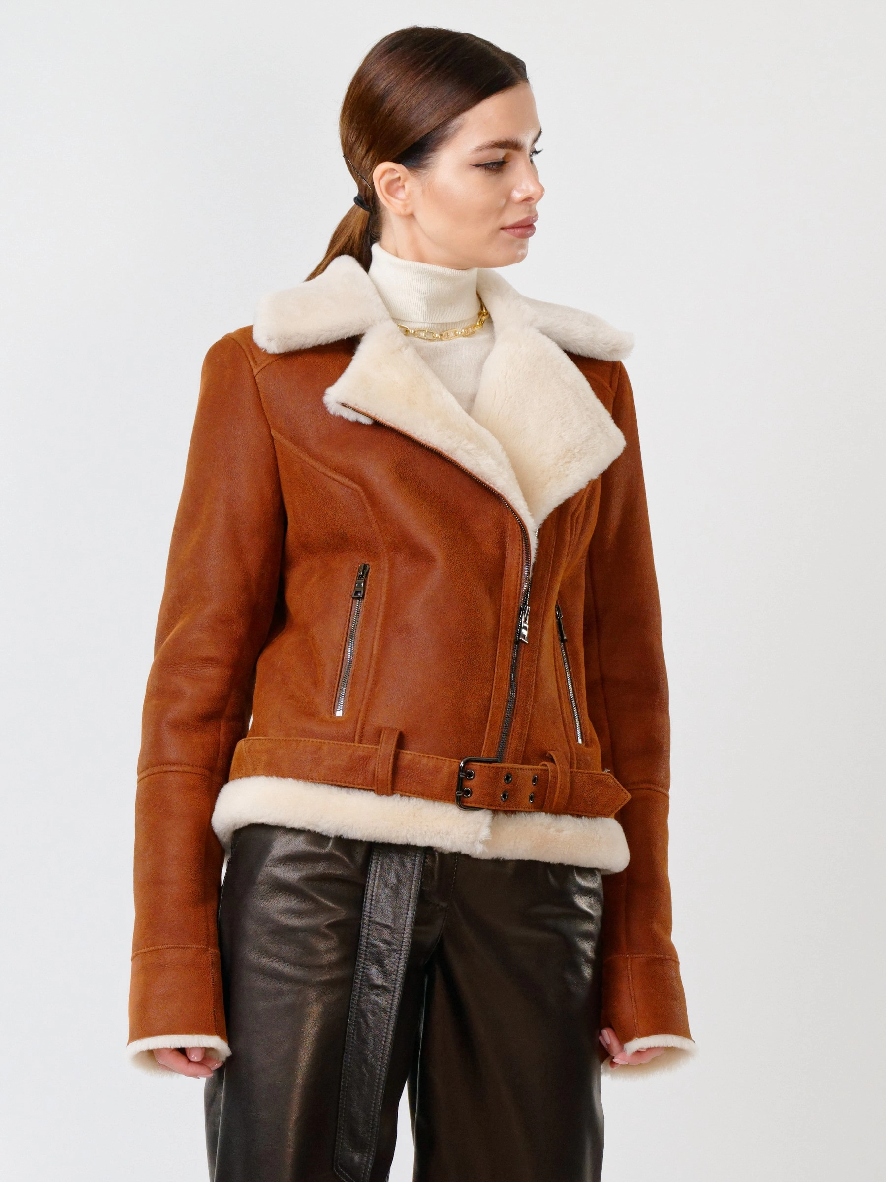 В насыщенном табачно-рыжем цвете, эта дерзкая короткая женская дубленка-косуха из роскошной кудрявой овчины "керли" на молнии, со свободным силуэтом, английским воротником, регулируемыми меховыми манжетами, двумя боковыми карманами на молниях и ремнём в шлёвках по низ , дарит премиальное тепло, комфорт и свободу движений; сочетайте ее с рваными джинсами и худи, кожаными леггинсами и футболкой с принтом, объемным свитером и грубыми ботинками или поверх платья, дополняя объемным шарфом и стильной сумкой-кроссбоди.