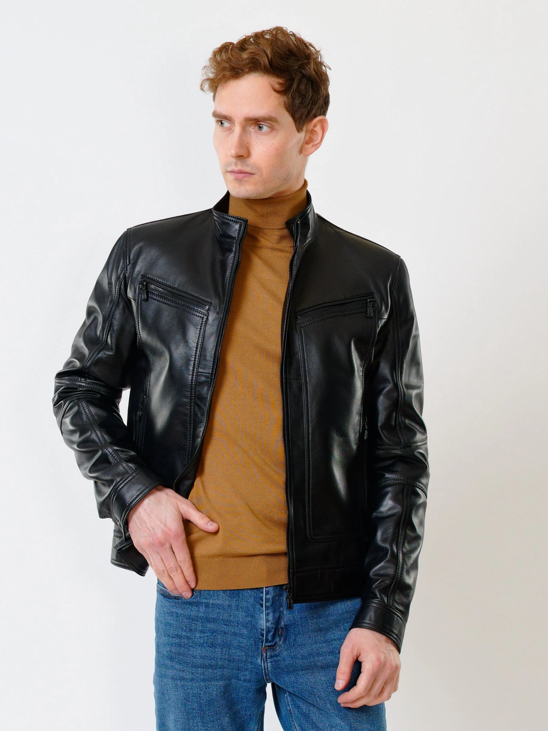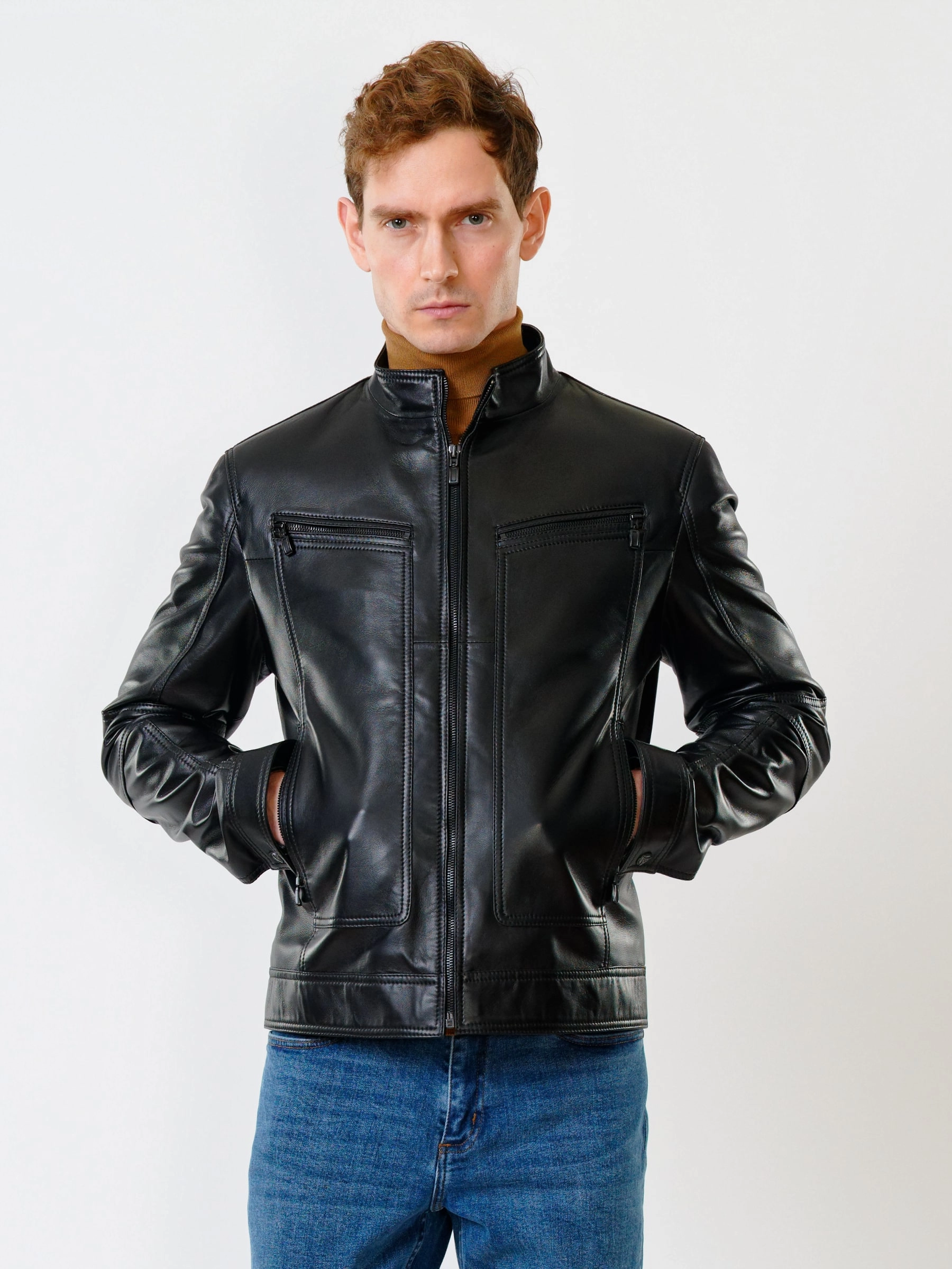 Для пошива короткой куртки использовали гладкую кожу премиального качества. Воротник-стойка оптимальный по высоте. Застёжка-молния. Рукав втачной. Боковые и нагрудные карманы на молниях. Предусмотрены удобные внутренние карманы для документов. Безупречная работа наших портных. Обеспечена идеальная посадка по фигуре и прекрасная свобода движений.