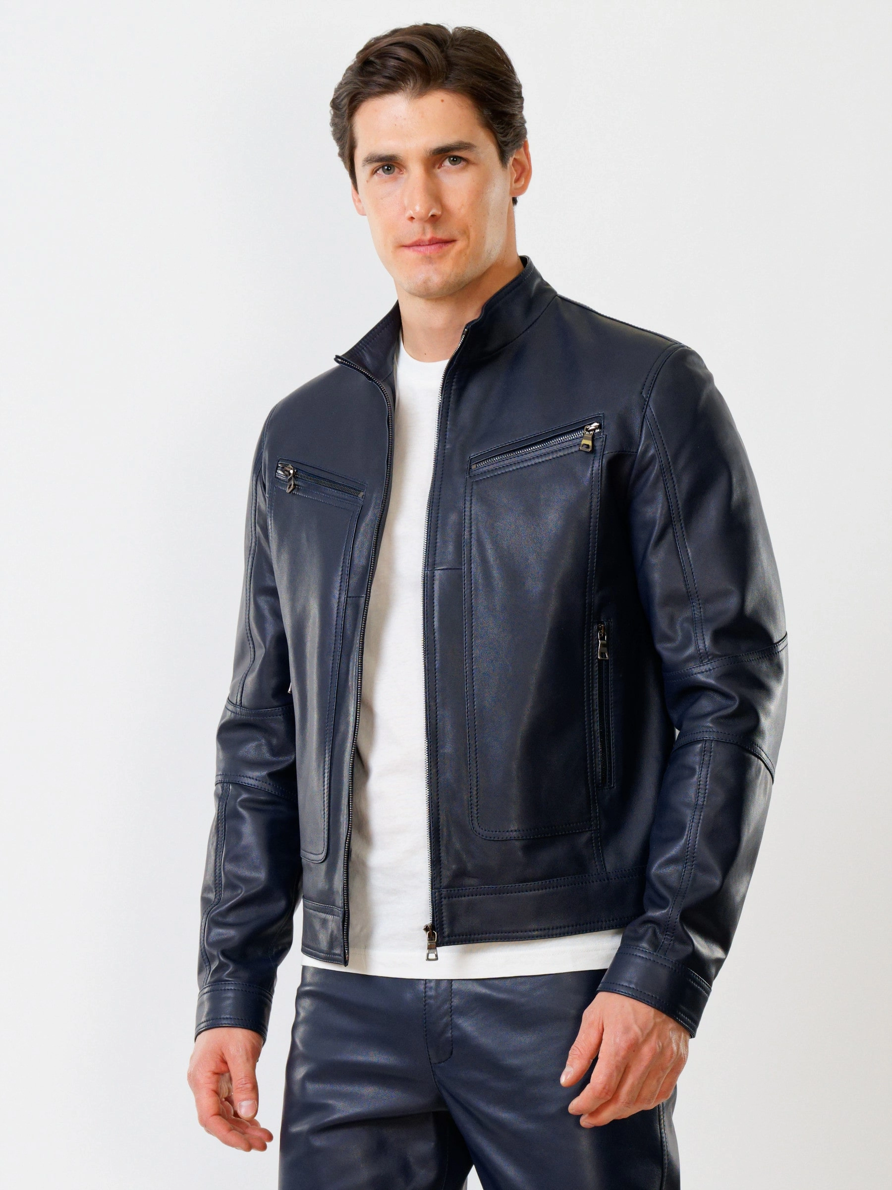 Для пошива короткой куртки использовали гладкую кожу премиального качества. Воротник-стойка оптимальный по высоте. Застёжка-молния. Рукав втачной. Боковые и нагрудные карманы на молниях. Предусмотрены удобные внутренние карманы для документов. Безупречная работа наших портных. Обеспечена идеальная посадка по фигуре и прекрасная свобода движений.