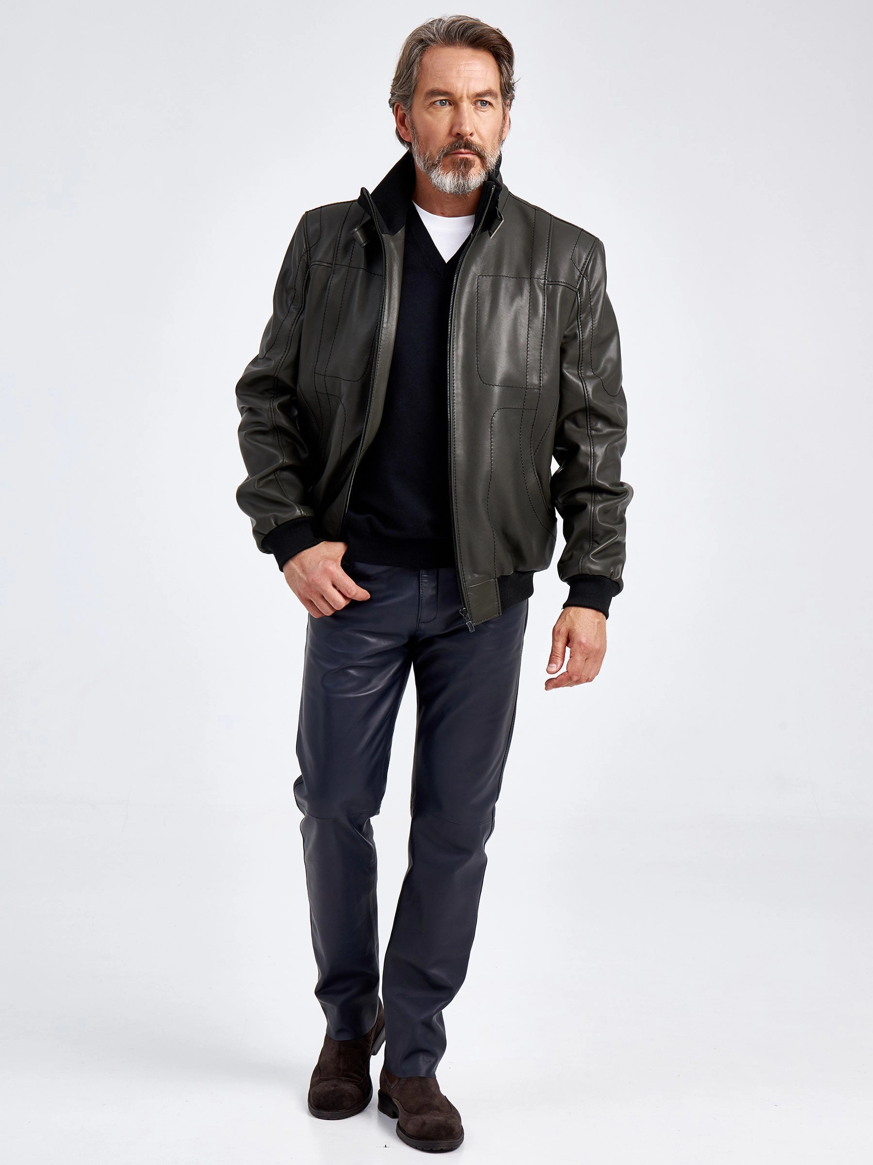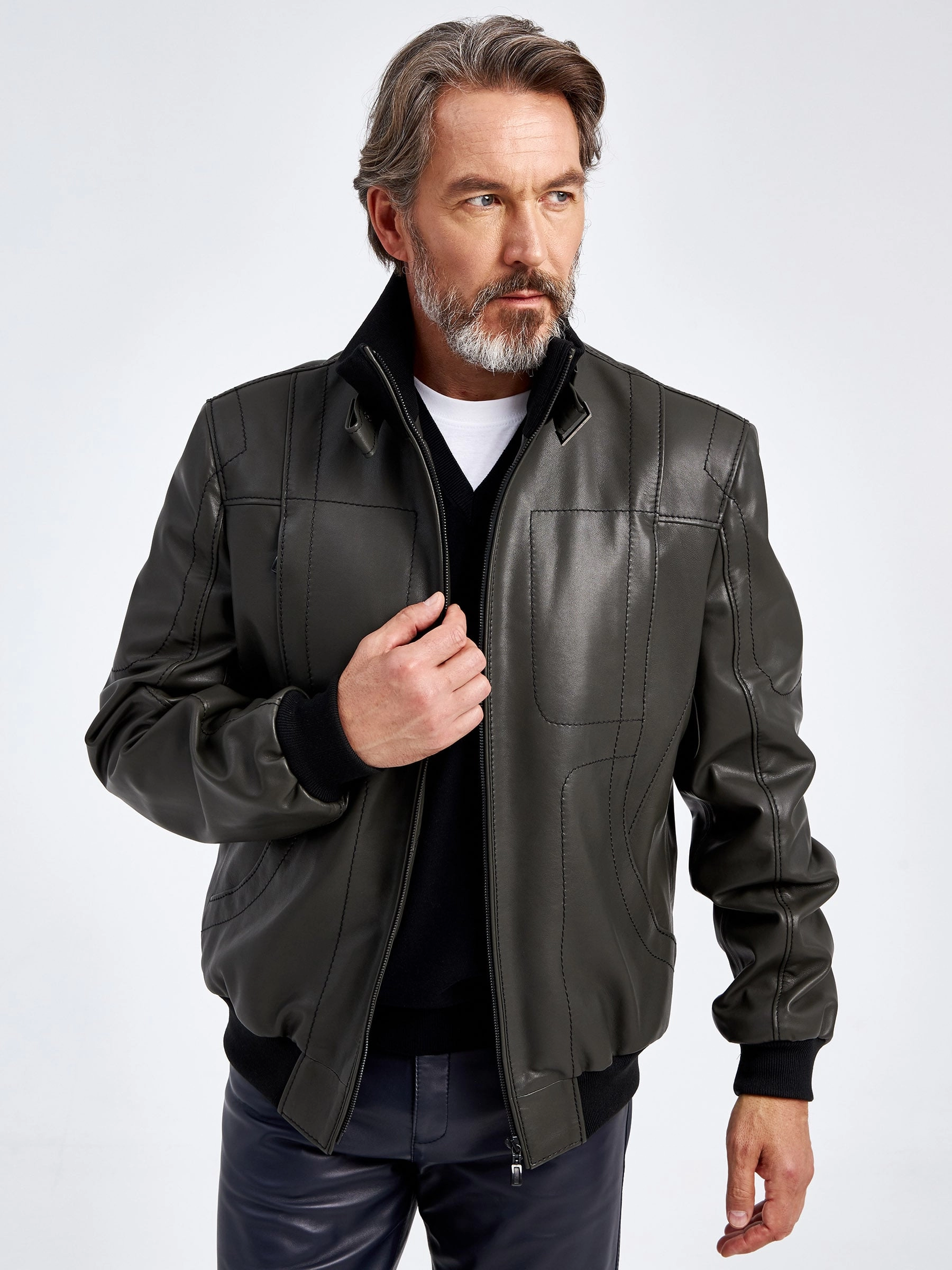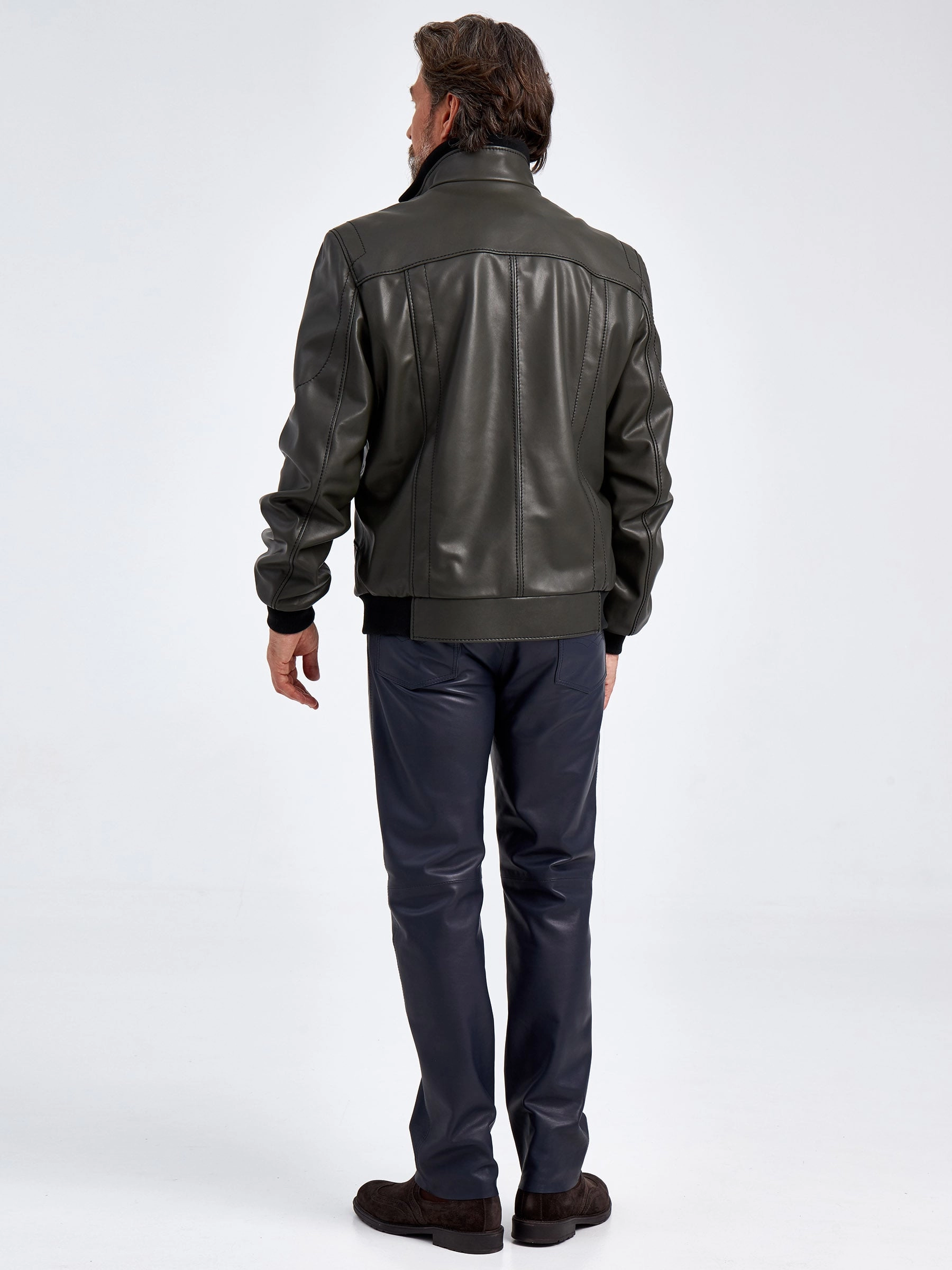Кожаная куртка бомбер мужская премиум класса 521, оливковая, размер 50, артикул 29061