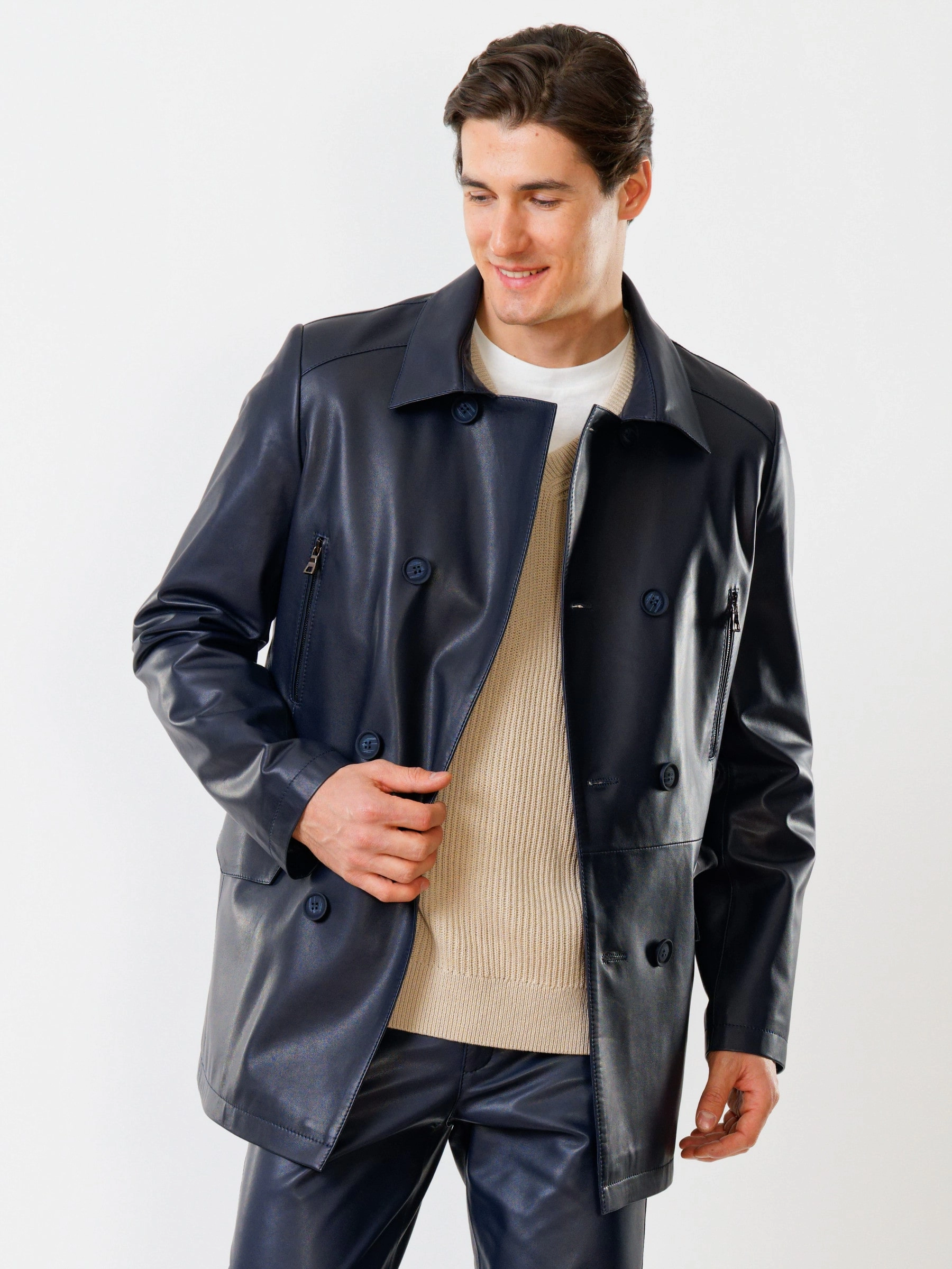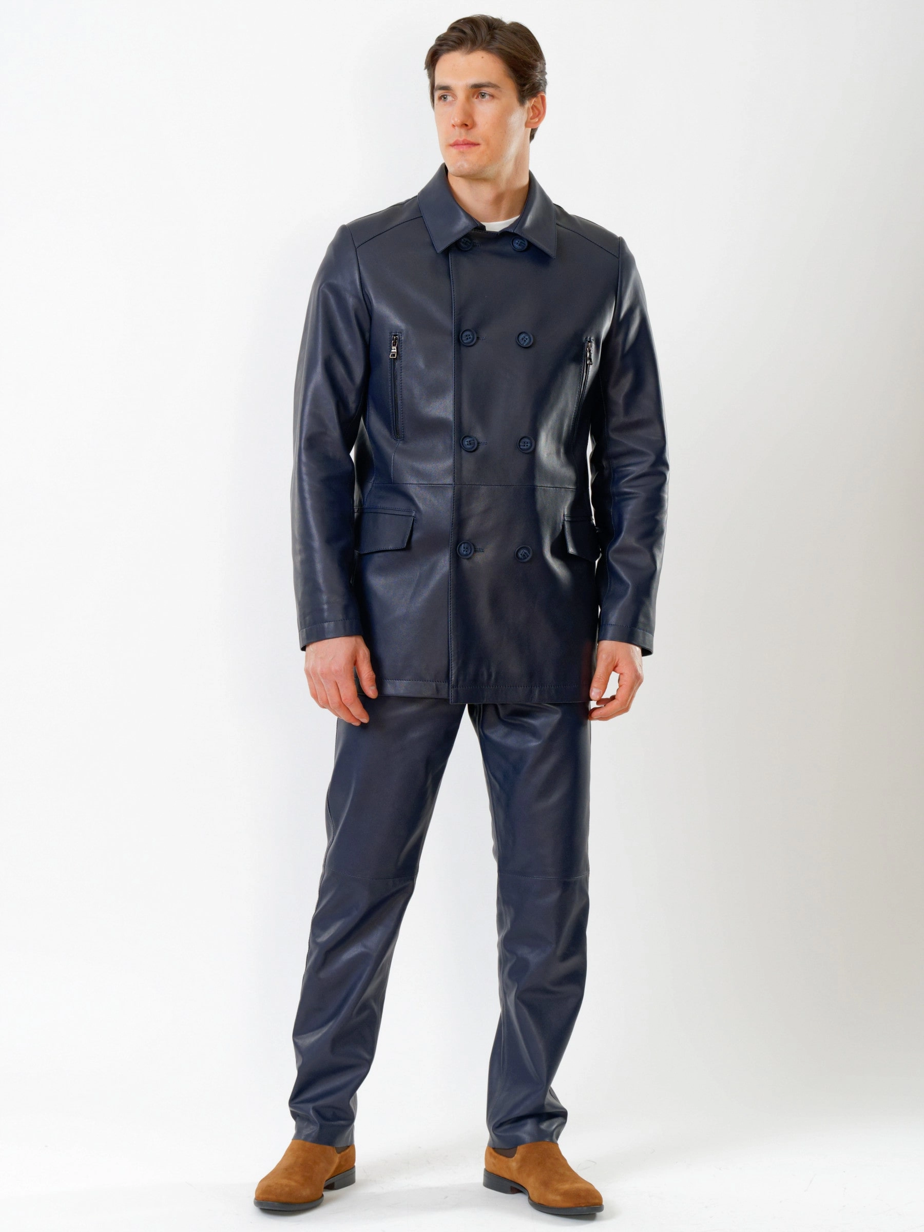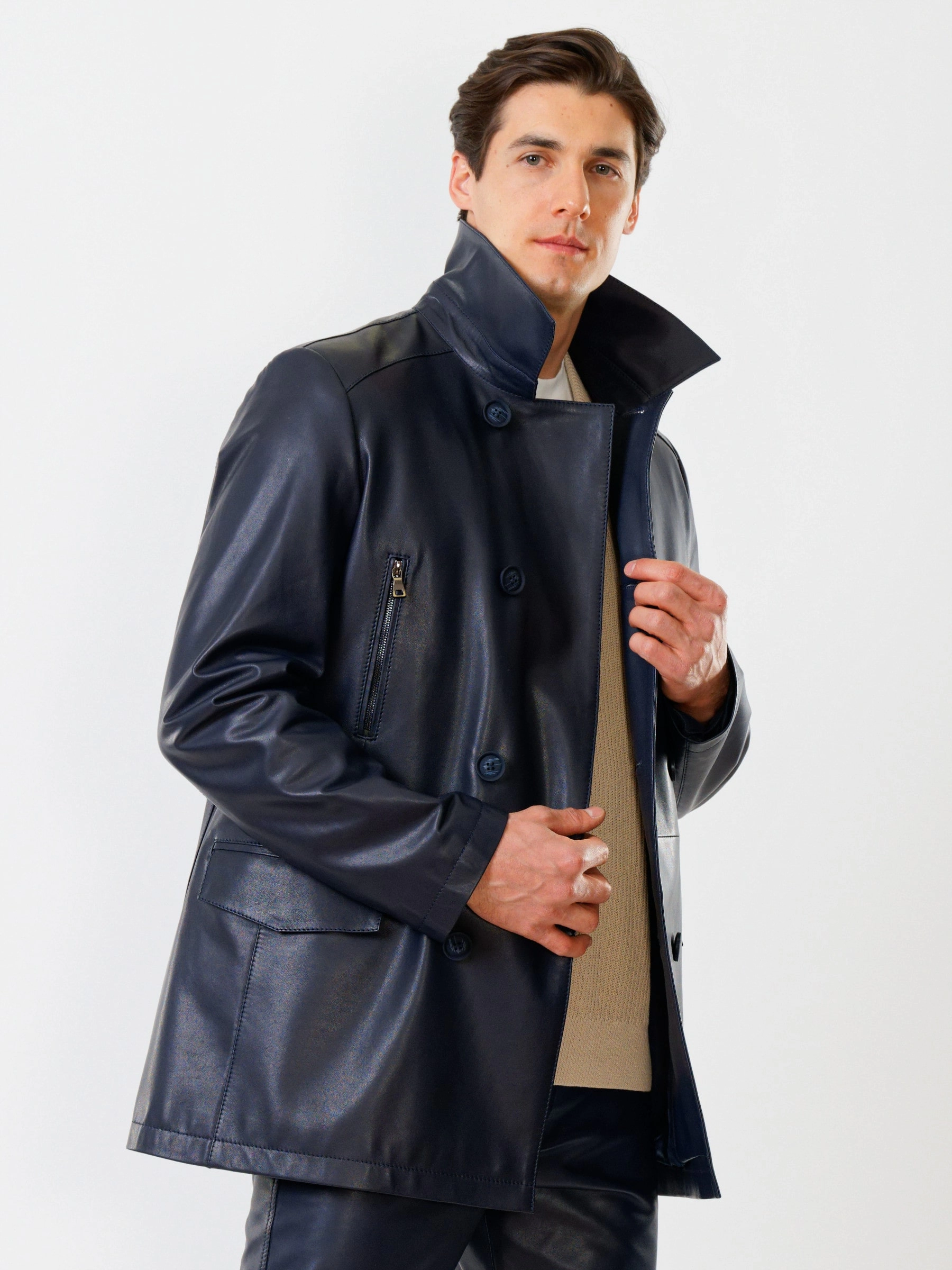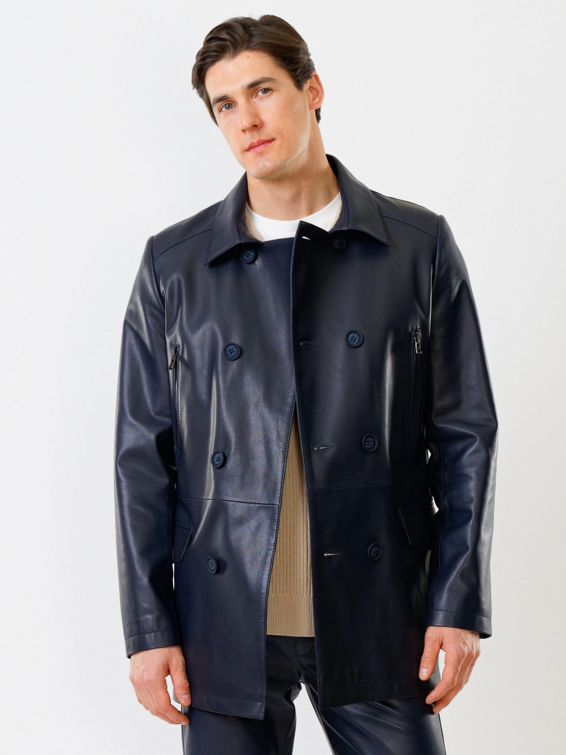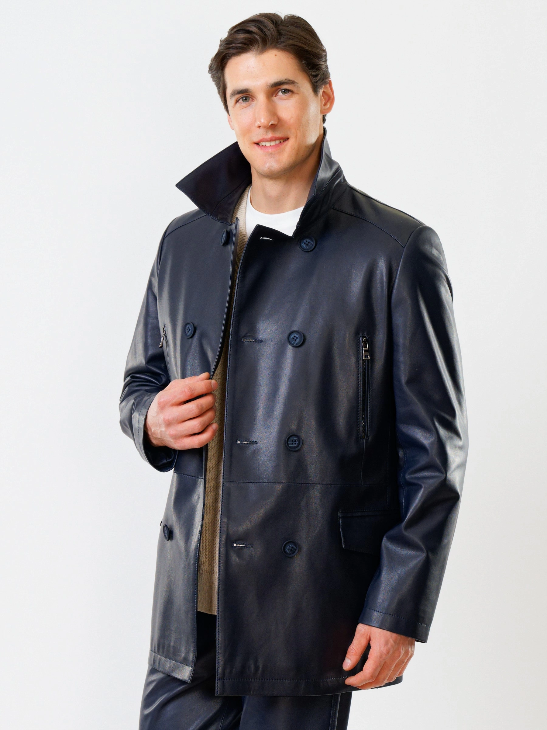 Двубортный мужской кожаный бушлат премиум класса 538, синий, размер 60, артикул 28660