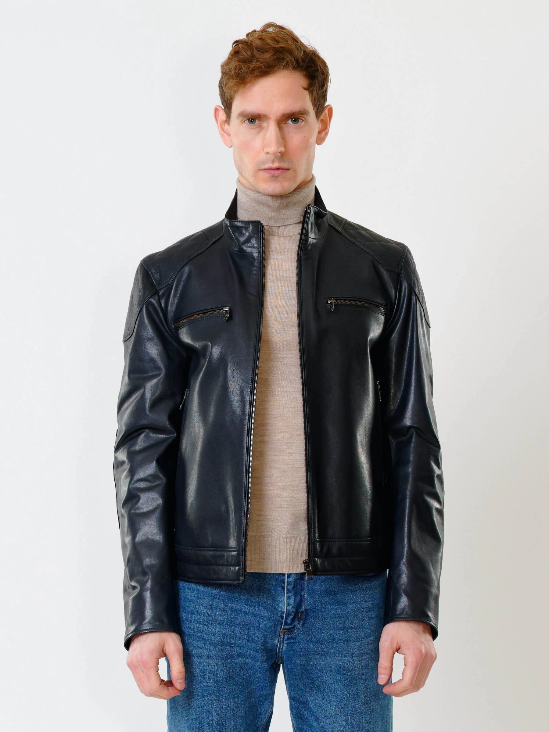 Короткую куртку полуприлегающего силуэта выполнили из гладкой кожи премиального качества. Невысокий воротник-стойка. Локоть и плечо втачного рукава выделили стеганным ромбовидным узором. Нагрудные и боковые карманы, как и само изделие застегиваются крупными молниями. Безупречная работа наших портных. Идеальная посадка по фигуре и прекрасная свобода движений.