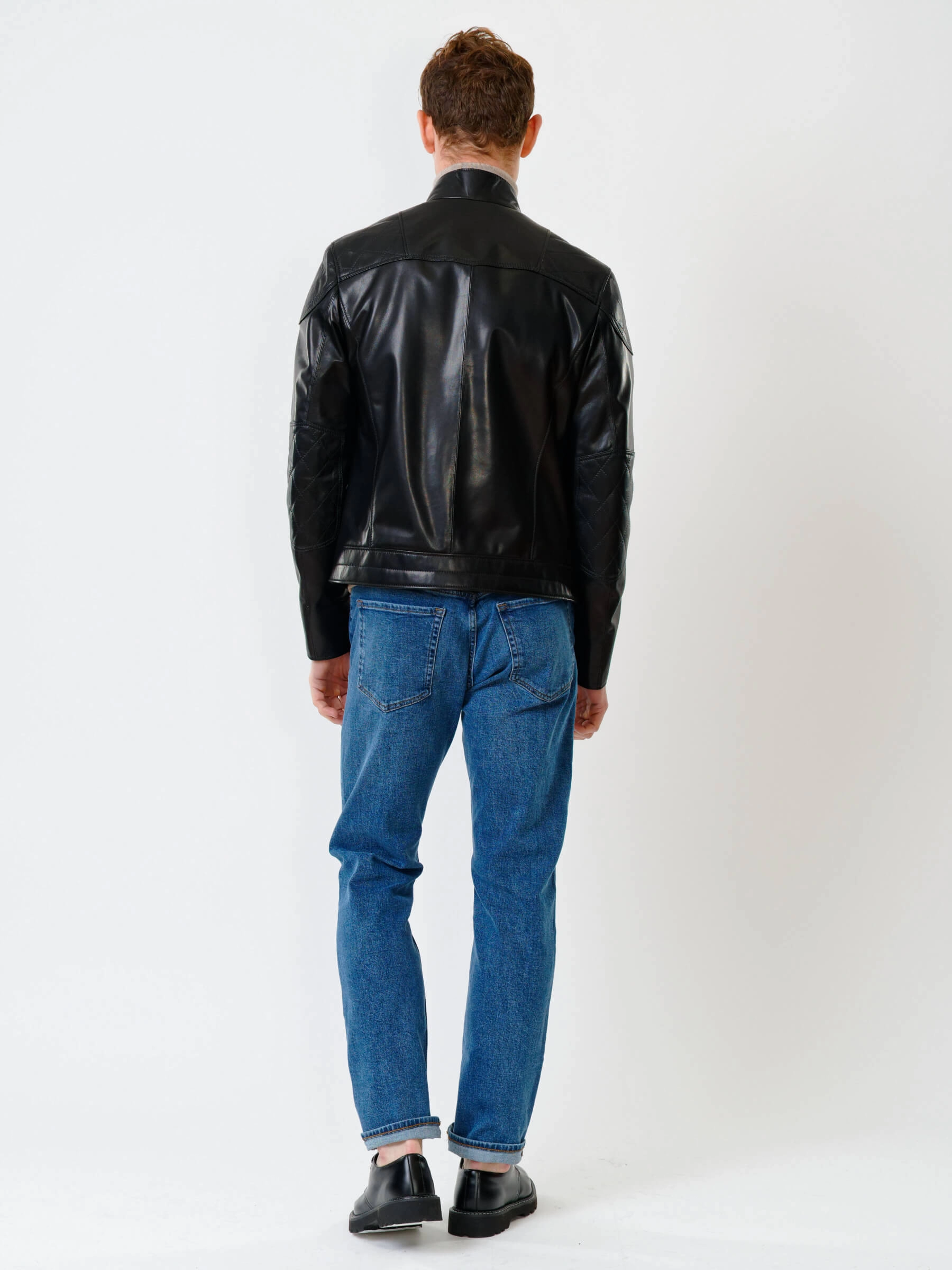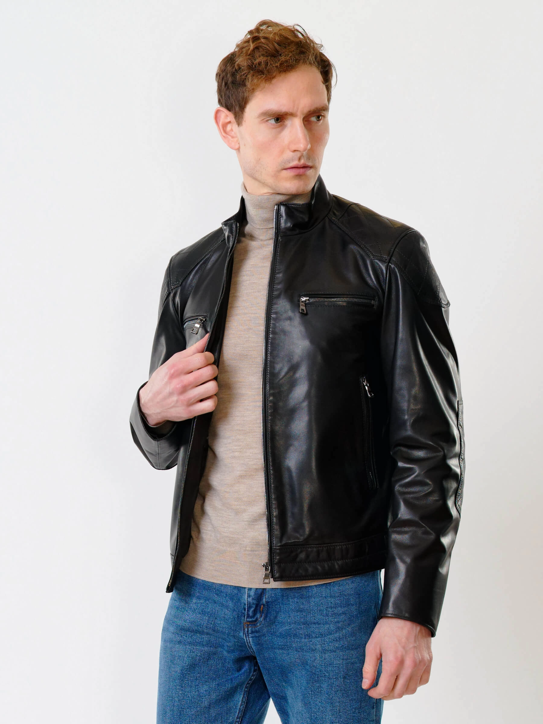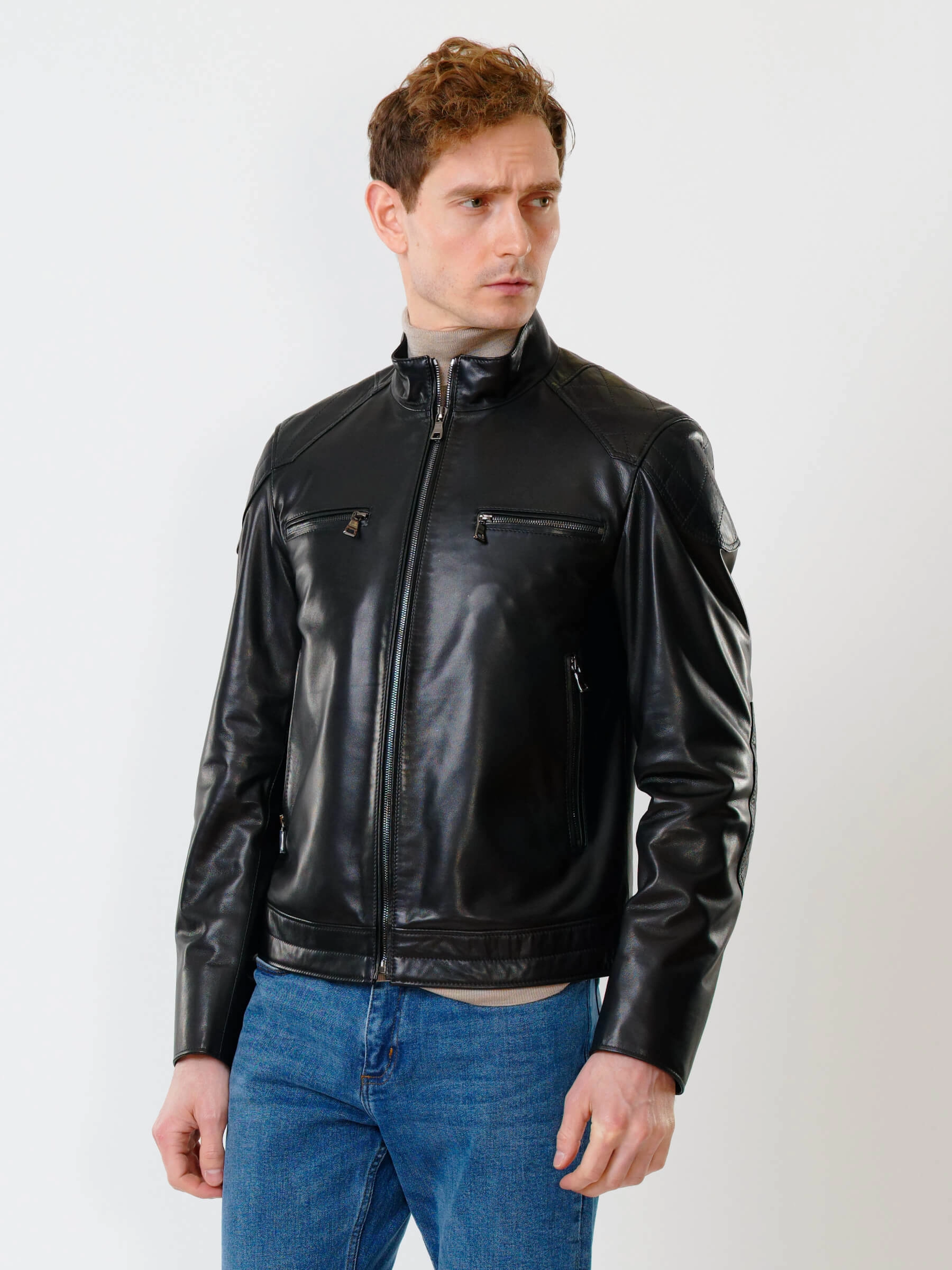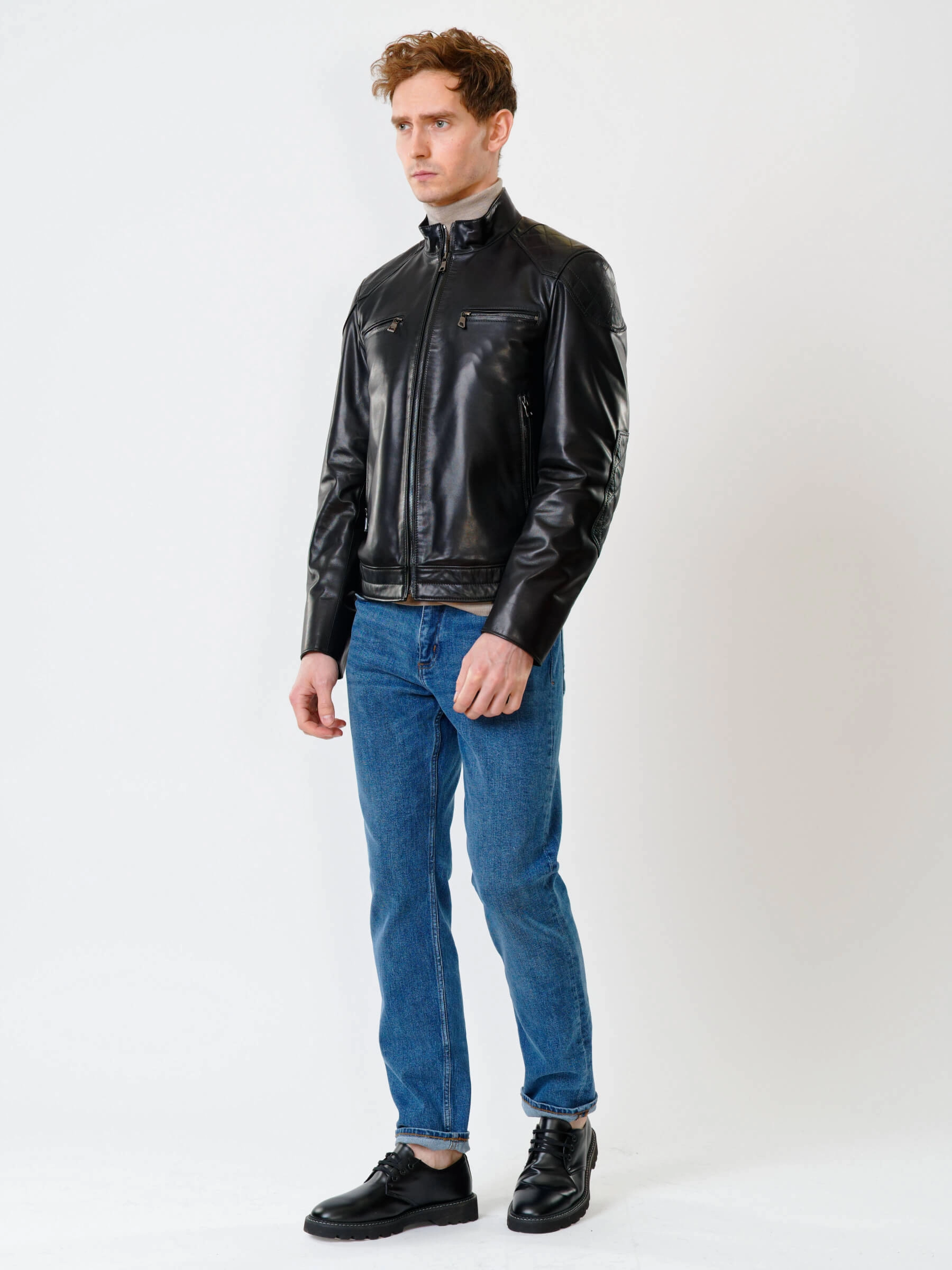 Короткую куртку полуприлегающего силуэта выполнили из гладкой кожи премиального качества. Невысокий воротник-стойка. Локоть и плечо втачного рукава выделили стеганным ромбовидным узором. Нагрудные и боковые карманы, как и само изделие застегиваются крупными молниями. Безупречная работа наших портных. Идеальная посадка по фигуре и прекрасная свобода движений.