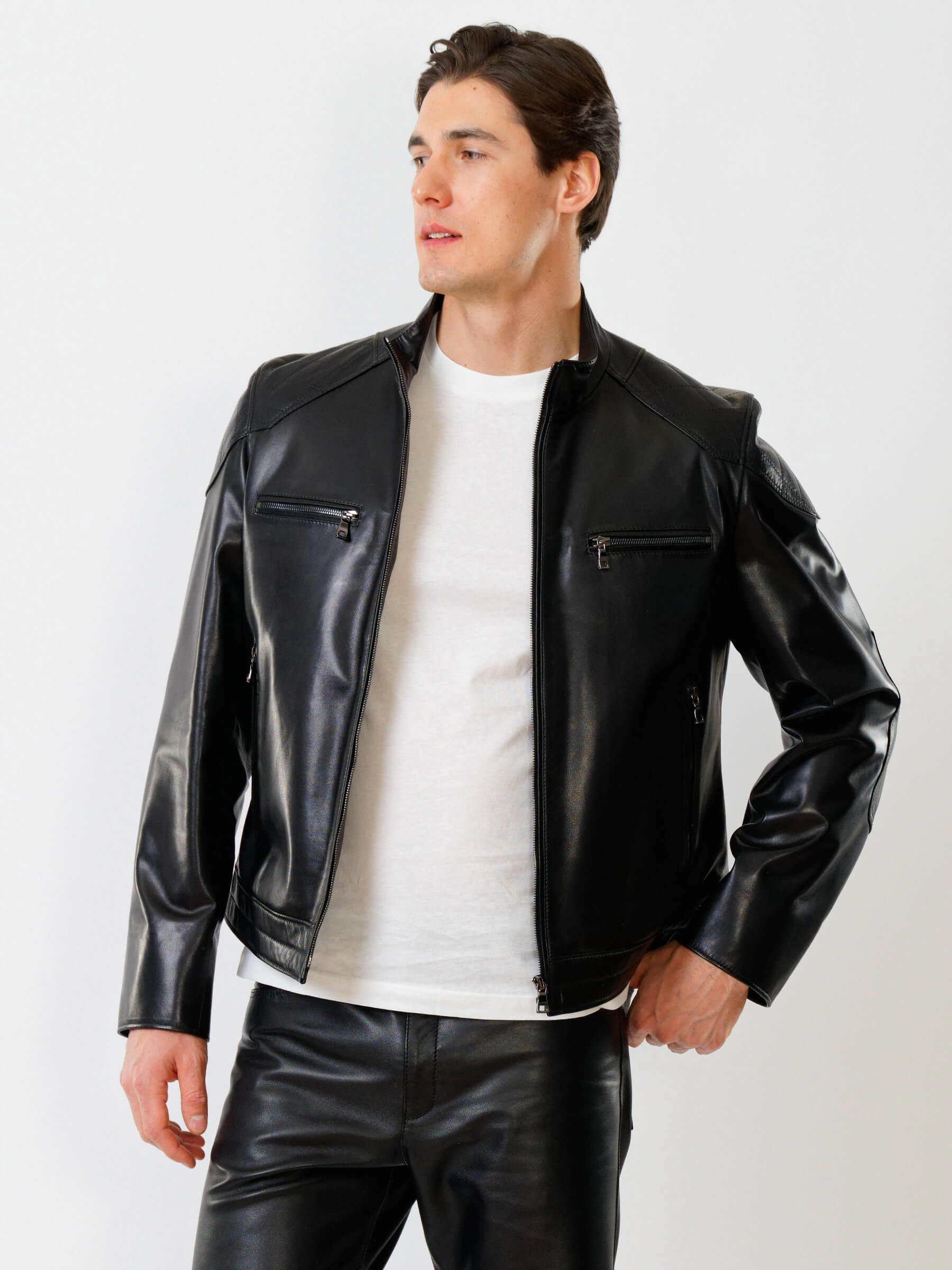 Короткую куртку полуприлегающего силуэта с воротником- стойкой выполинили из гладкой кожи премиального качества. Втачной рукав выделили стеганным ромбовидным узором. Боковые и нагрудные карманы как и само изделие застегиваются молниями. Предусмотрены удобные внутренние карманы для документов. Безупречная работа наших портных. Идеальная посадка по фигуре, прекрасная свобода движений.