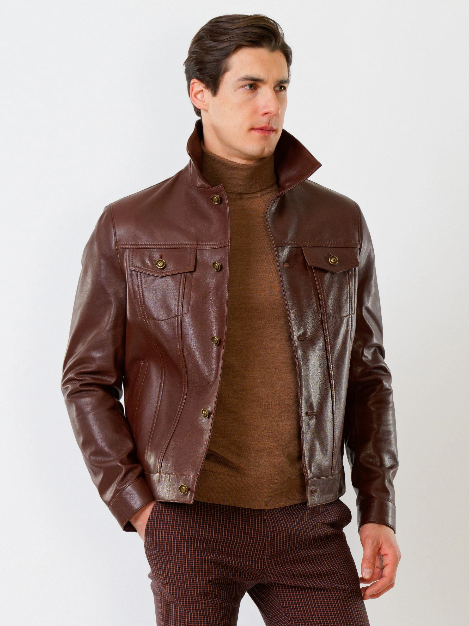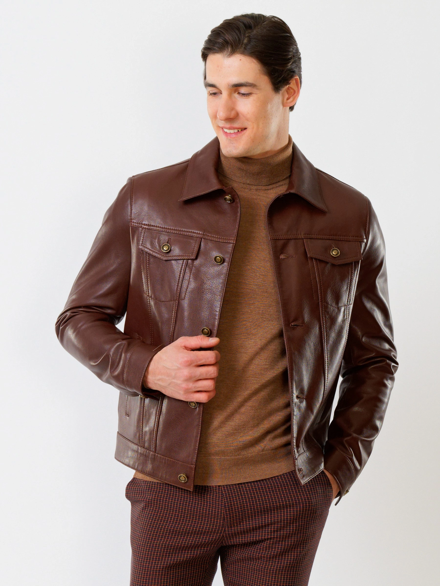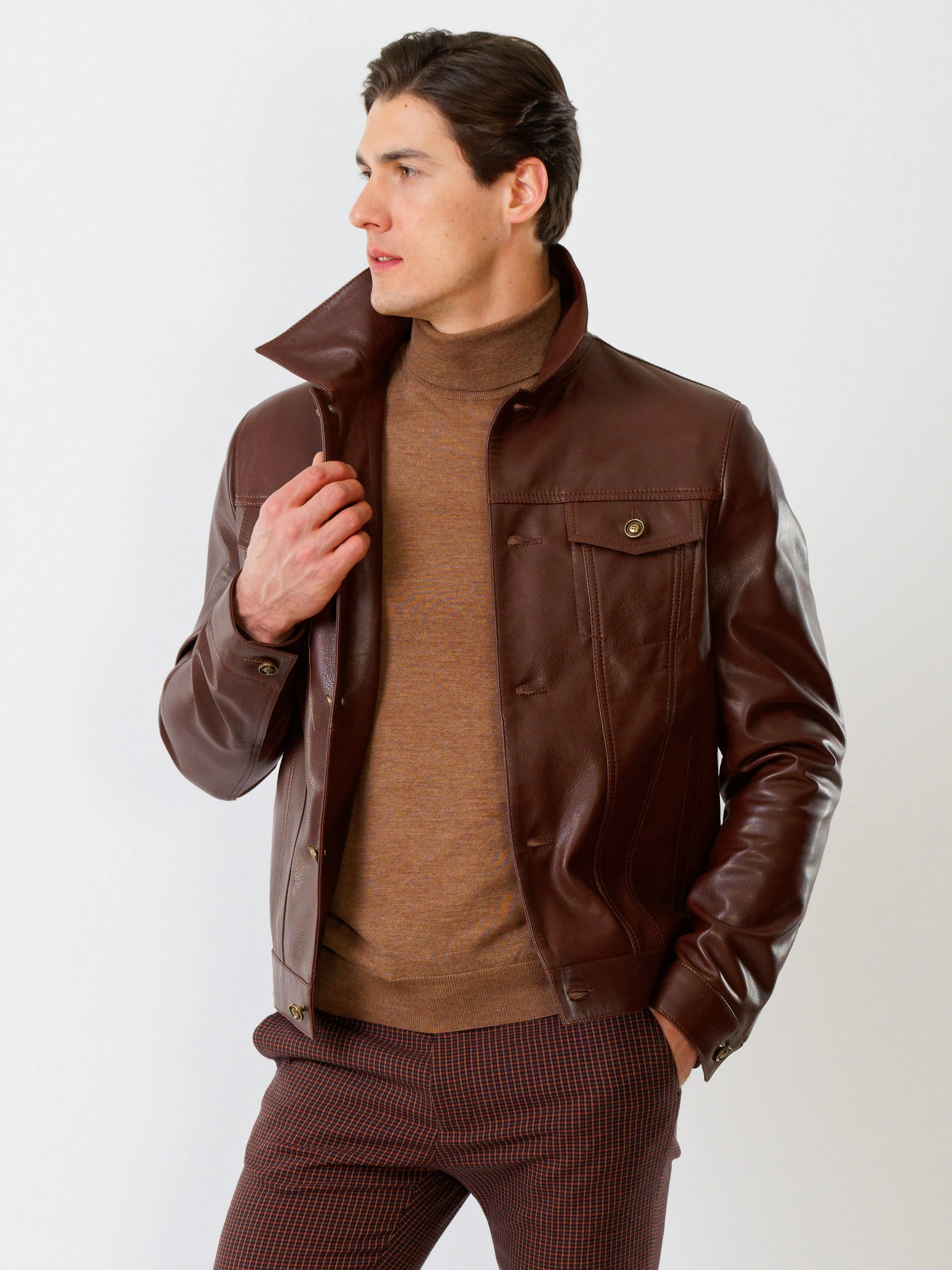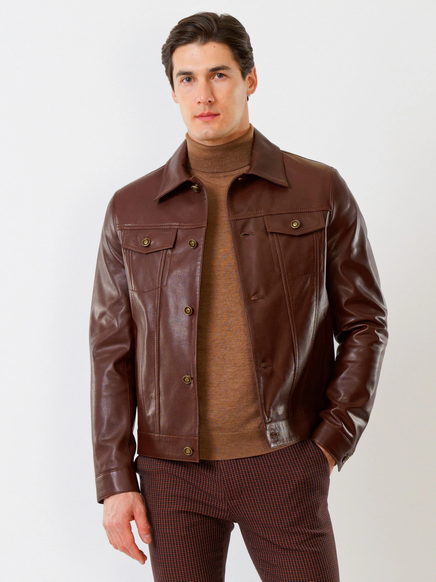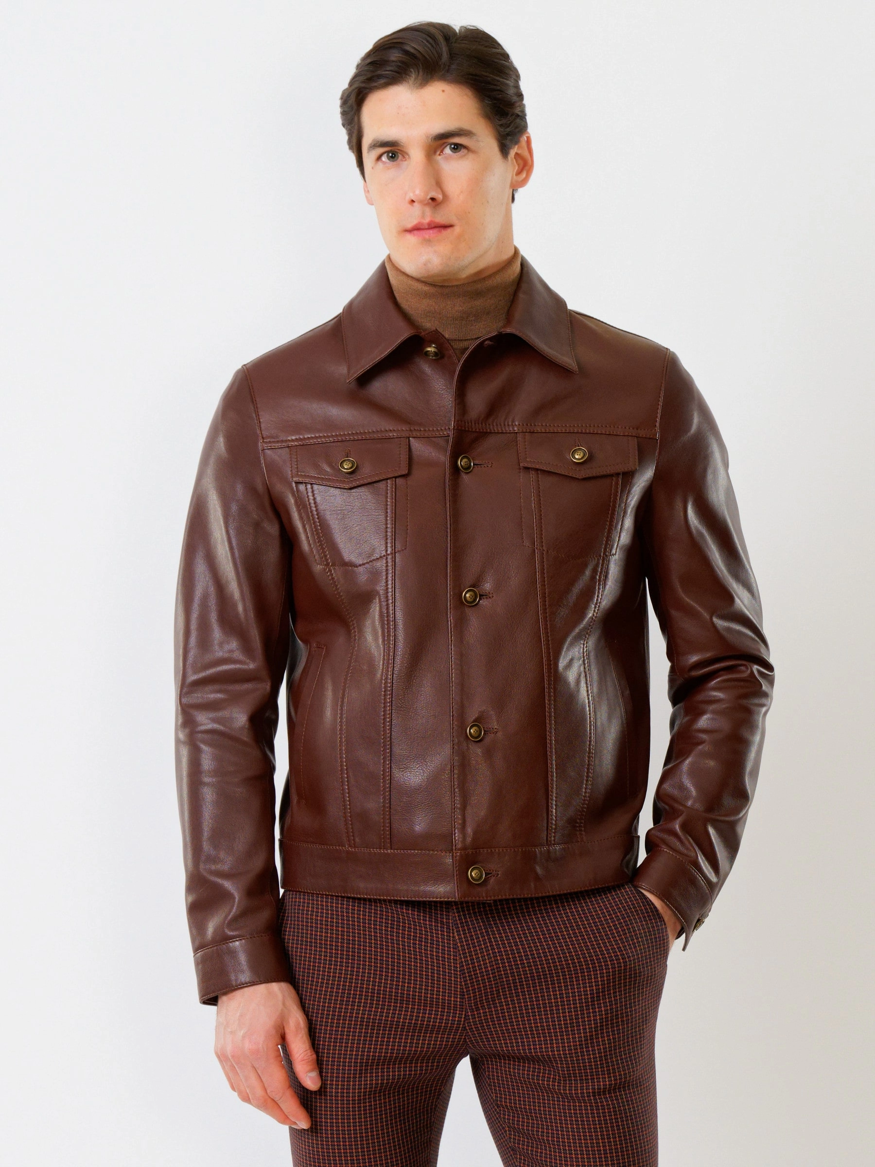 Товар короткая мужская кожаная куртка в джинсовом стиле 550, коричневая, размер 54, артикул 28740 выполнен из натуральной кожи с застежкой кнопки. Рассчитан на сезон: весна-лето. Длина изделия 67 см, силуэт полуприлегающий.