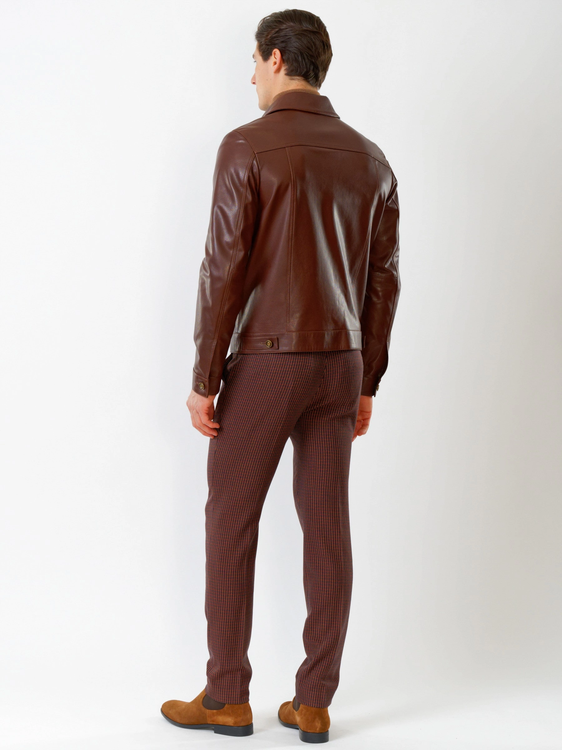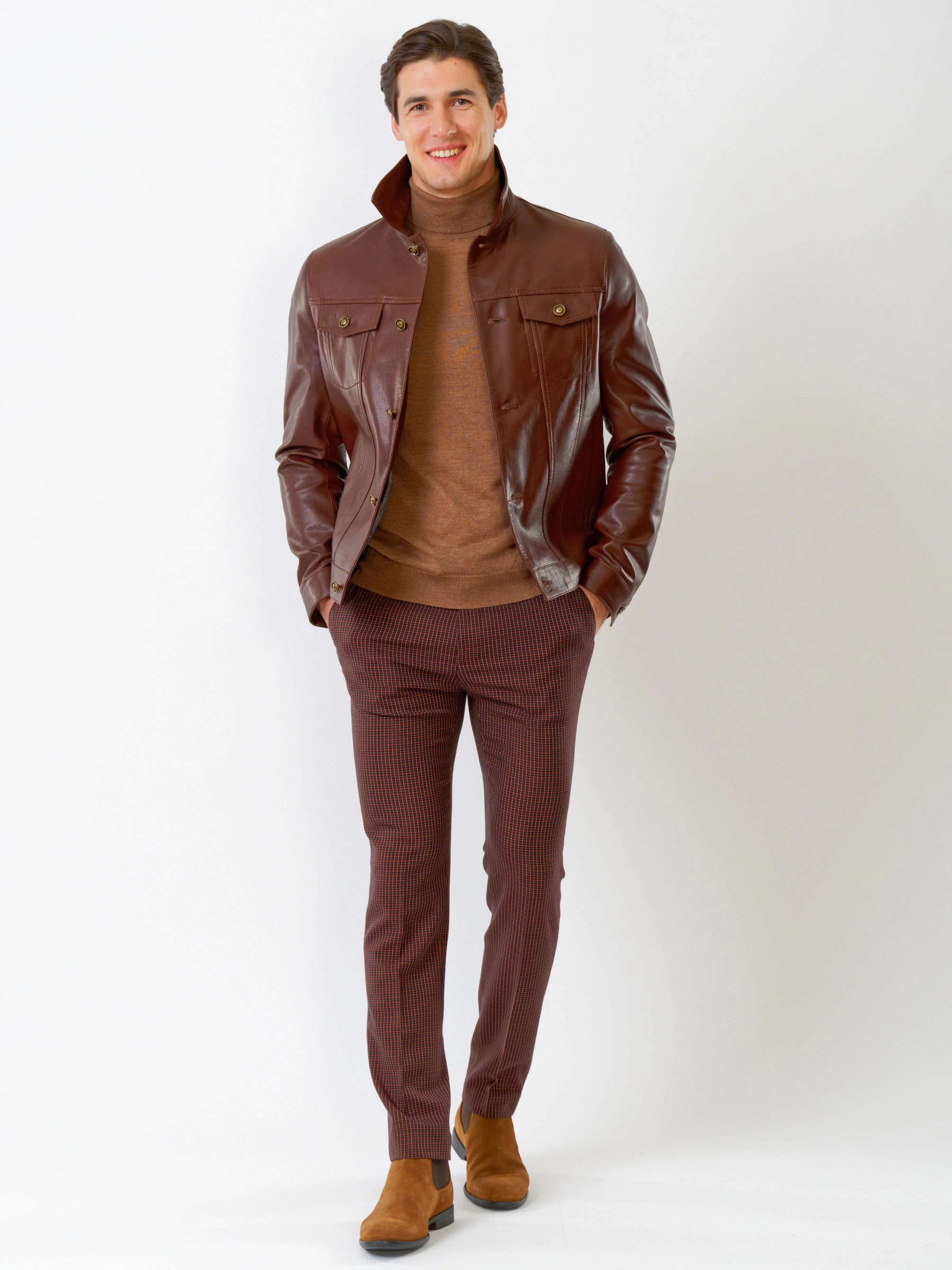 «Джинсовый стиль». Нагрудные карманы, отстрочки рельефов полочек, пуговицы-болты, всё повторяет дизайн классических курток из деним. Дизайнеры PRIMO VELLO выбрали для этой модели великолепно отполированную кожу с благородным матовым блеском. Высочайший уровень качества подчёркивают безупречная работа портных и комфортная посадка по фигуре.