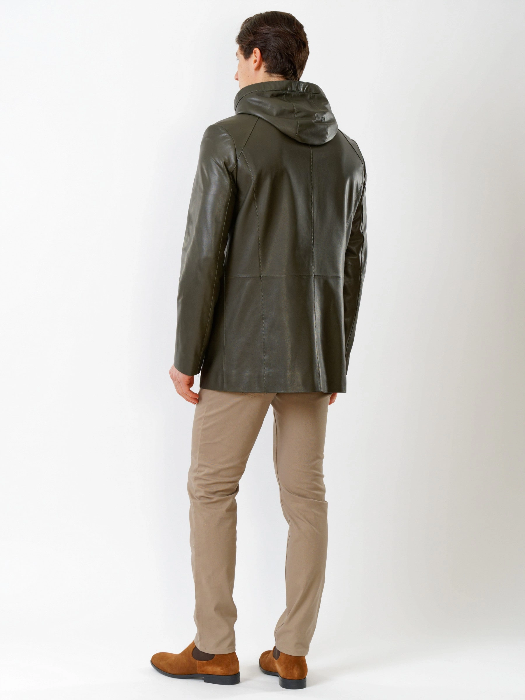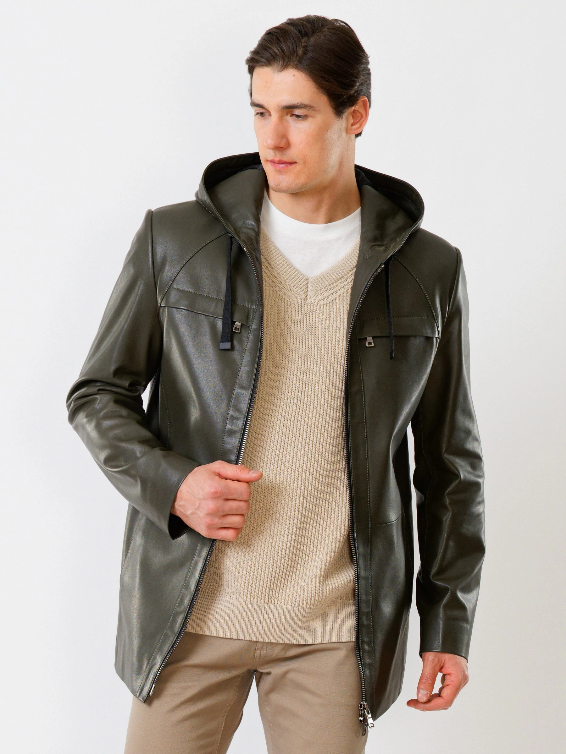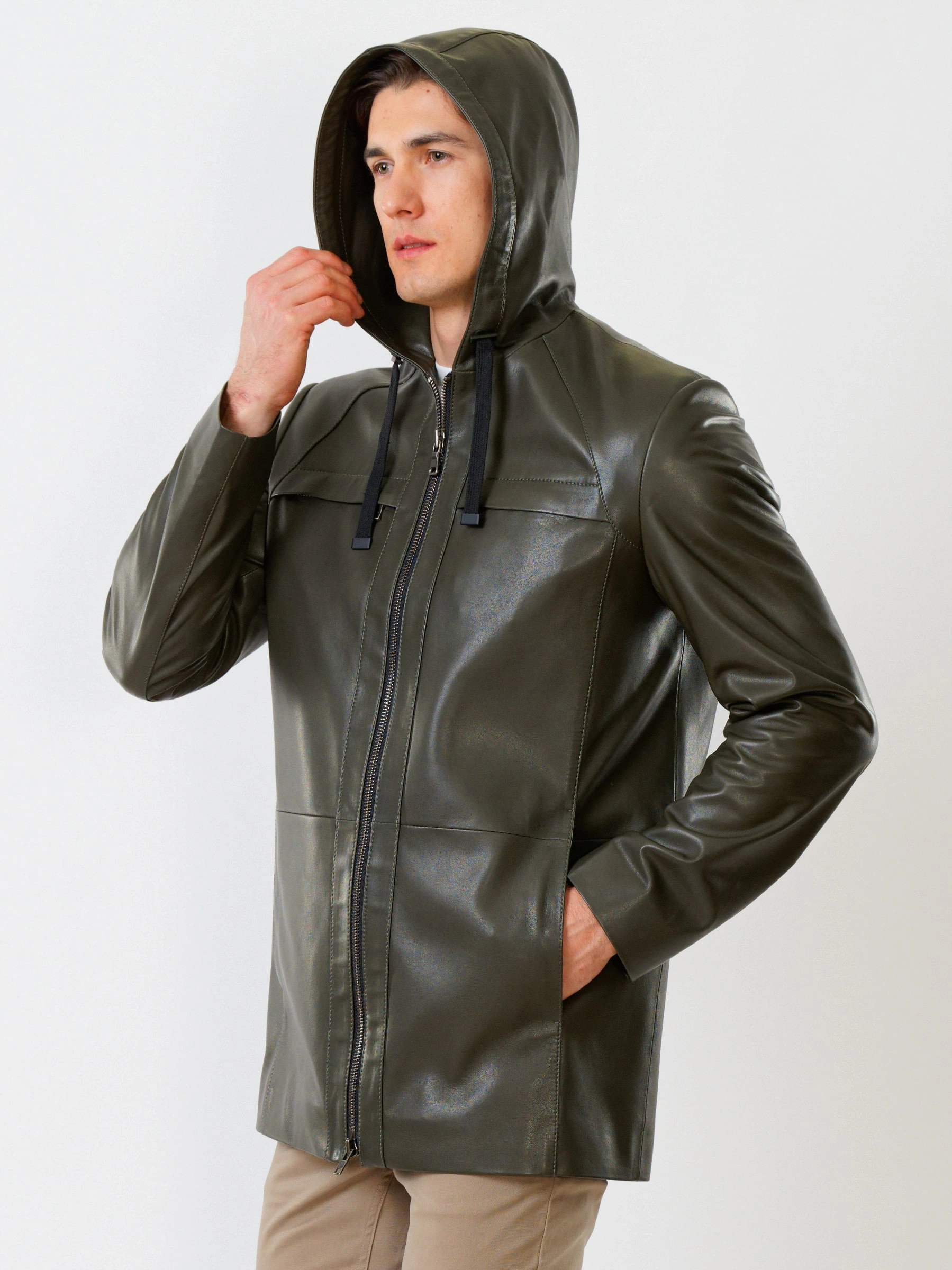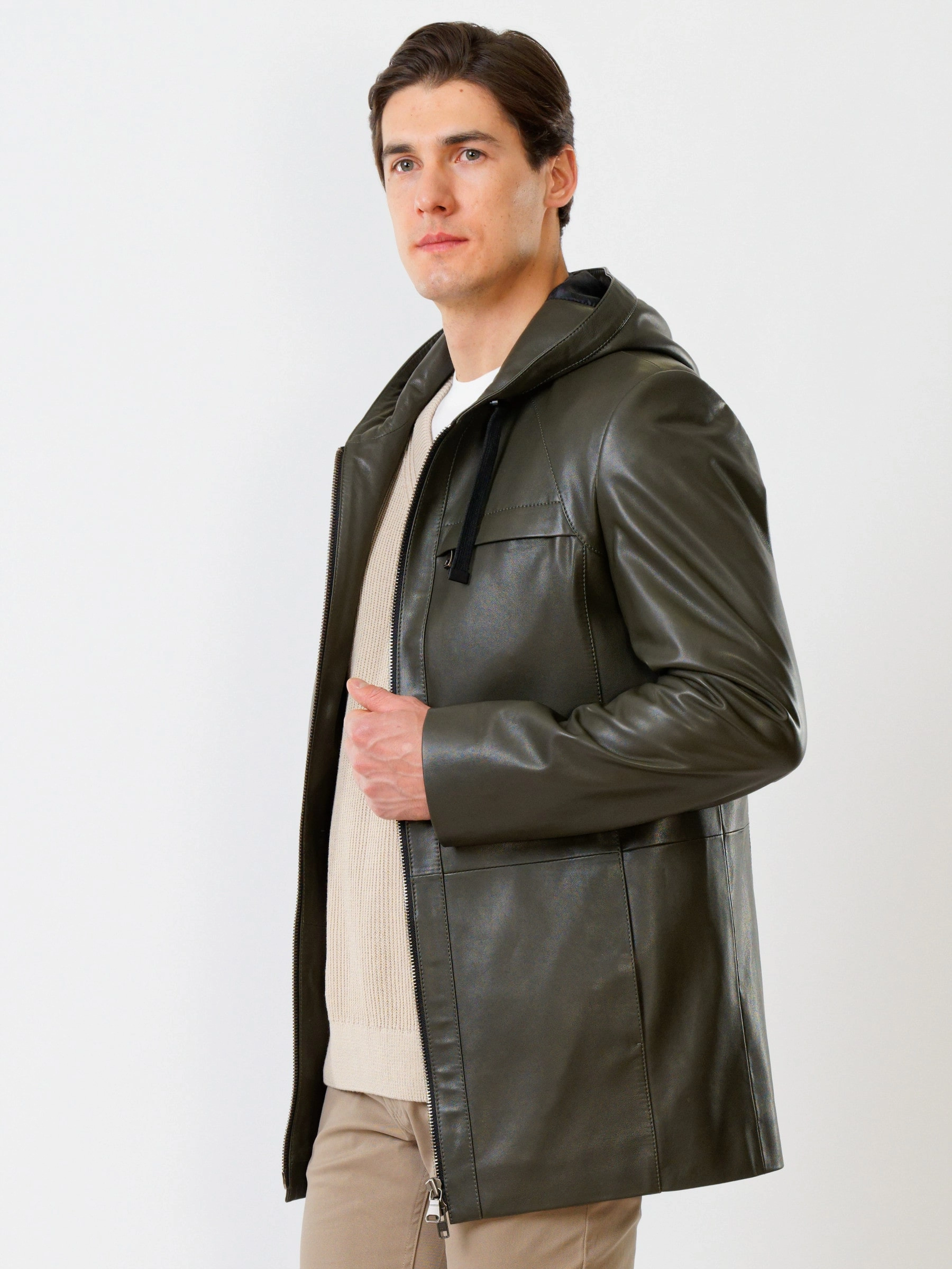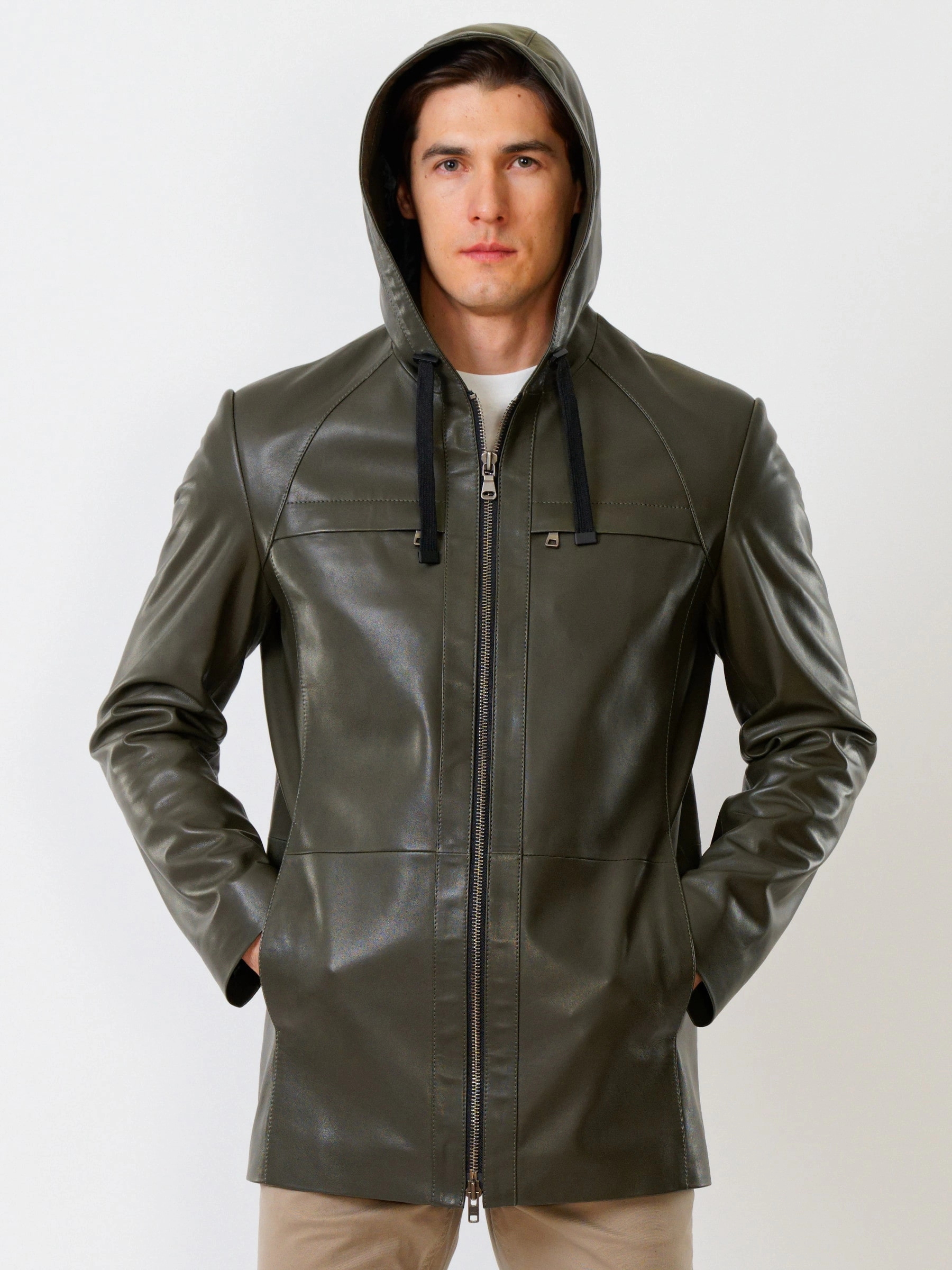 Удлиненная мужская кожаная куртка с капюшоном премиум класса 552, оливковая, размер 48, артикул 28760