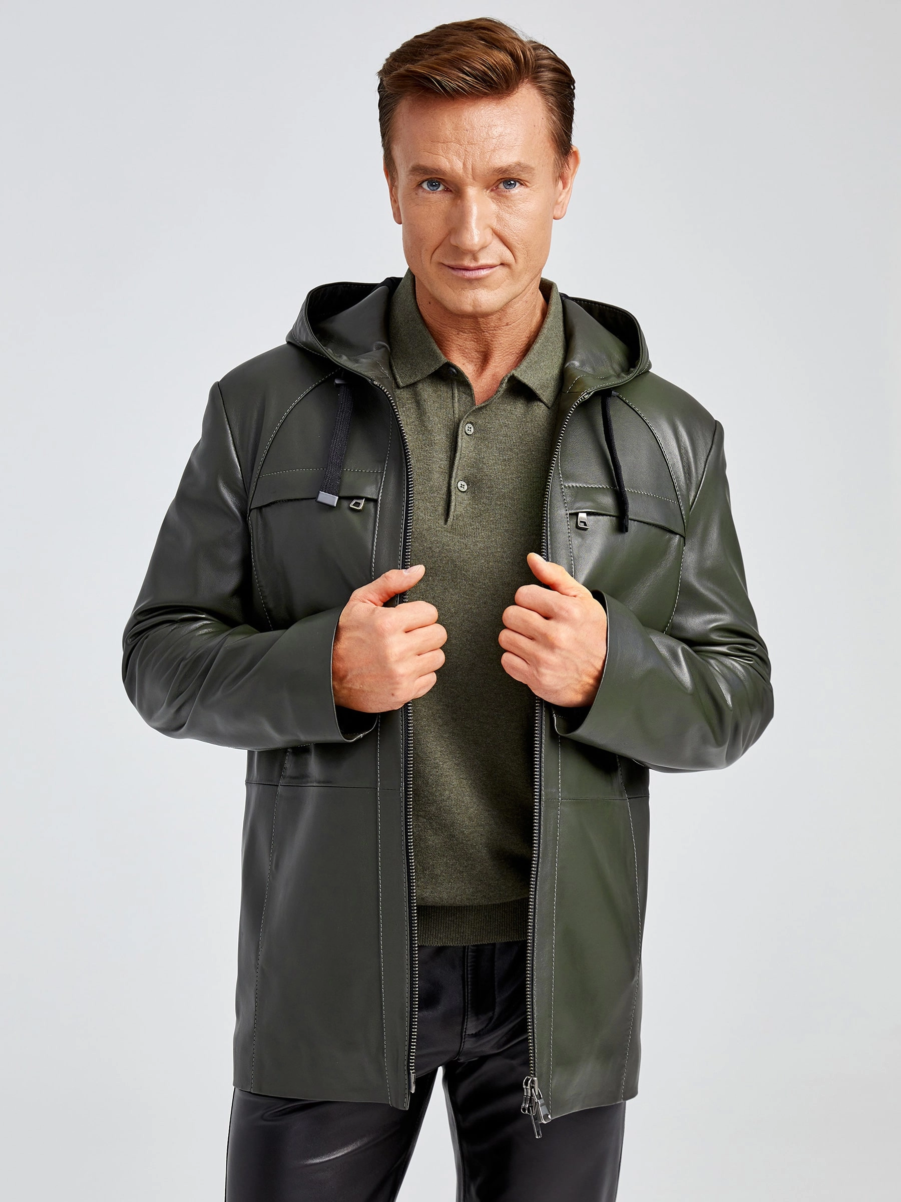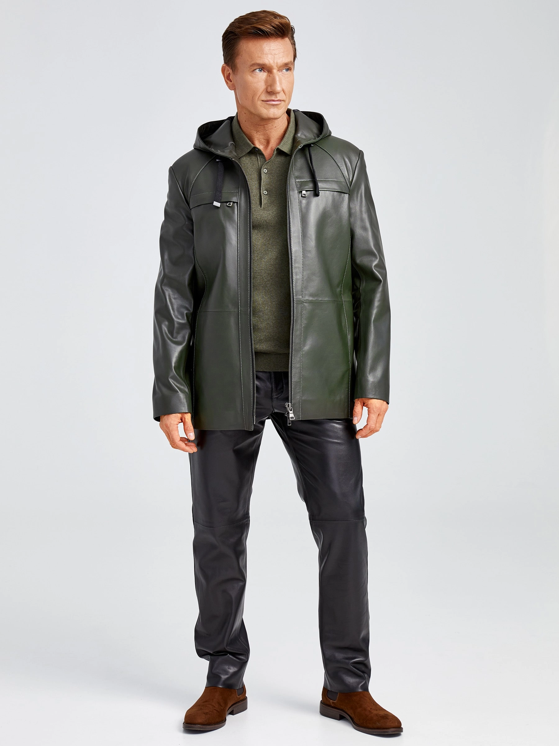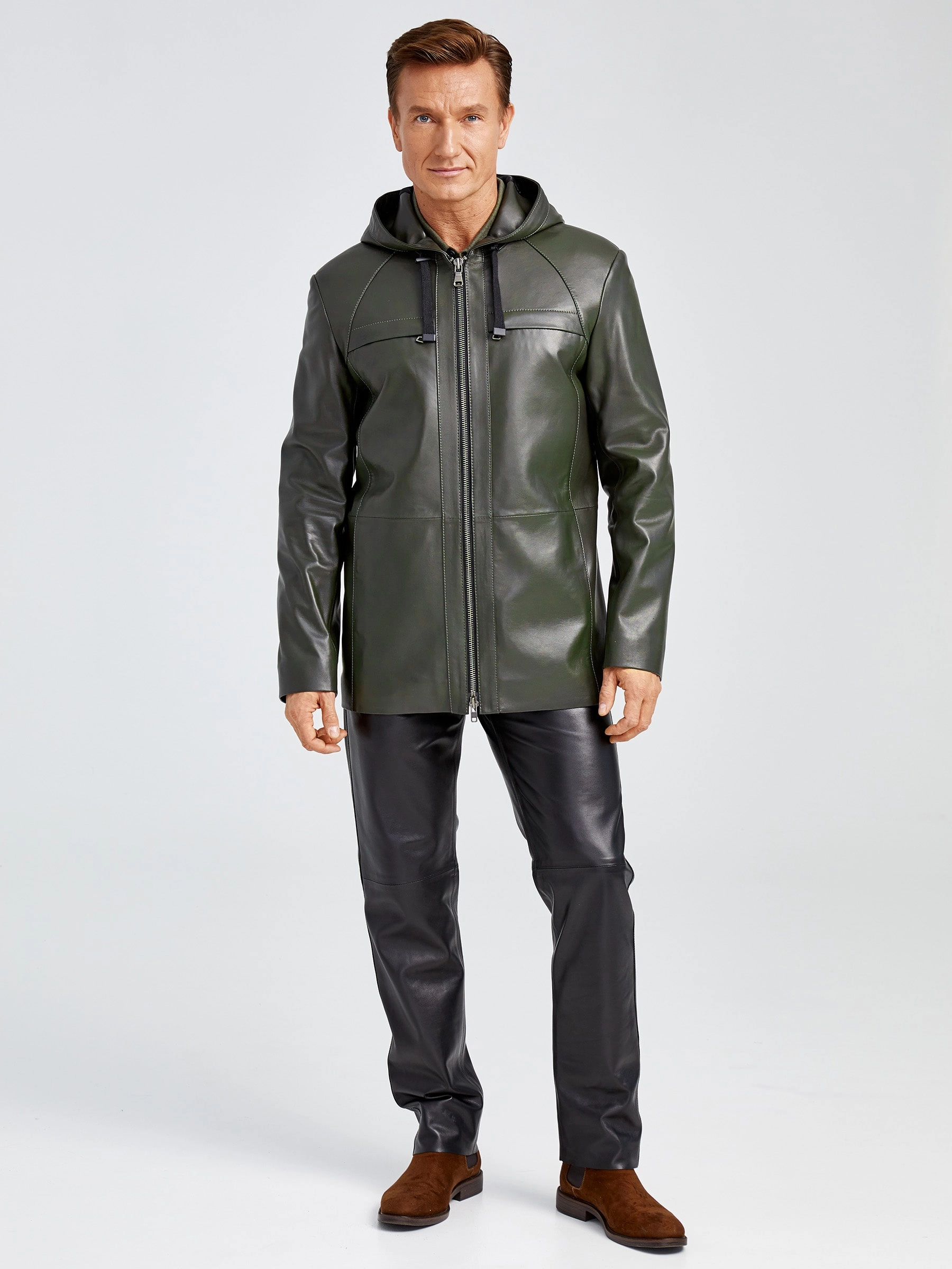 Удлиненная мужская кожаная куртка с капюшоном премиум класса 552, оливковая, размер 48, артикул 28892