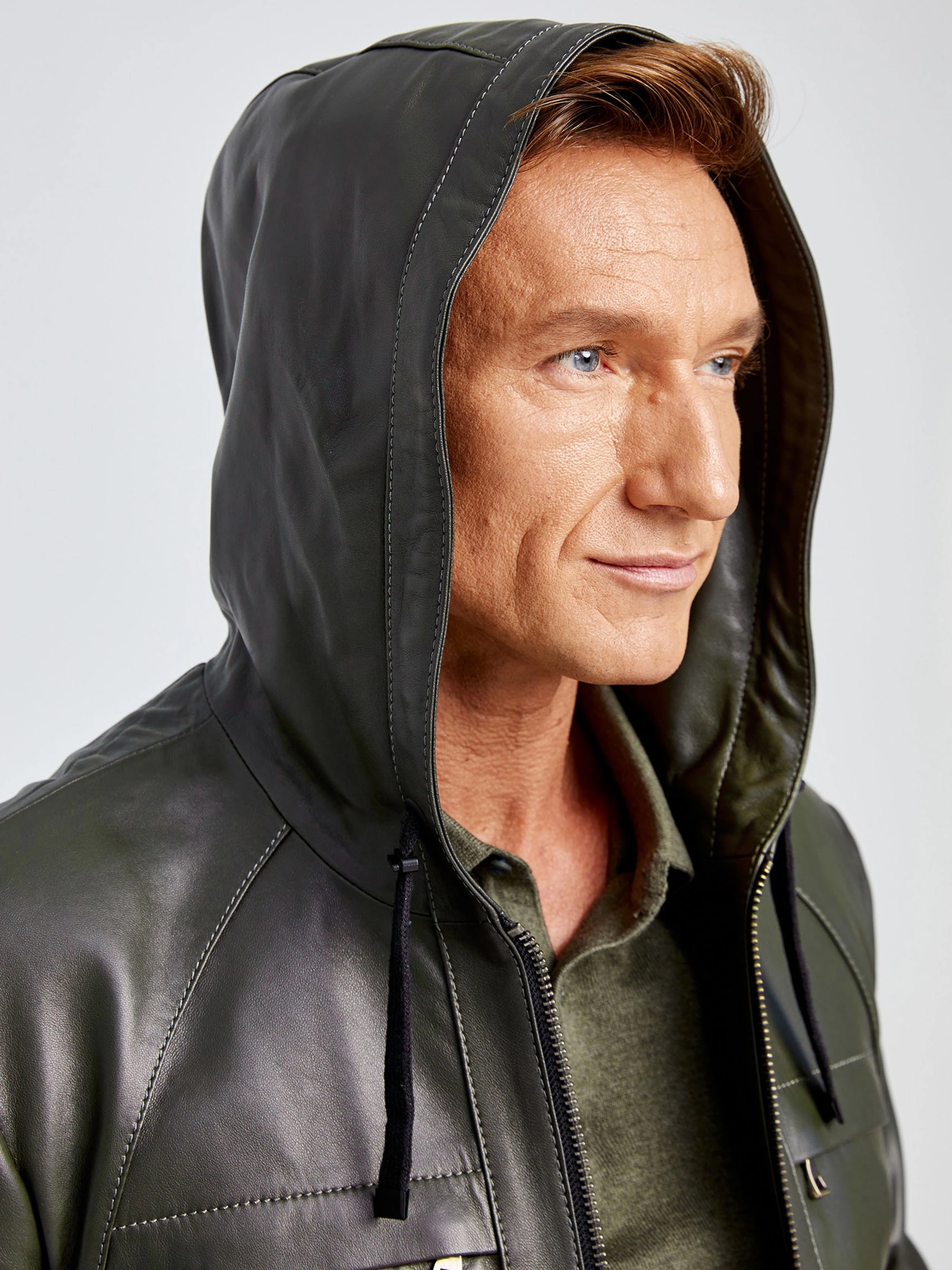 Кожаная куртка в спортивном стиле с капюшоном. Премиальное качество. Объём капюшона регулируется кулисами. Нагрудные карманы на молниях прикрыты клапанами. Дизайнеры PRIMO VELLO выбрали для этой модели великолепно отполированную кожу с благородным матовым блеском. Высочайший уровень качества подчёркивают безупречная работа портных и комфортная посадка по фигуре.