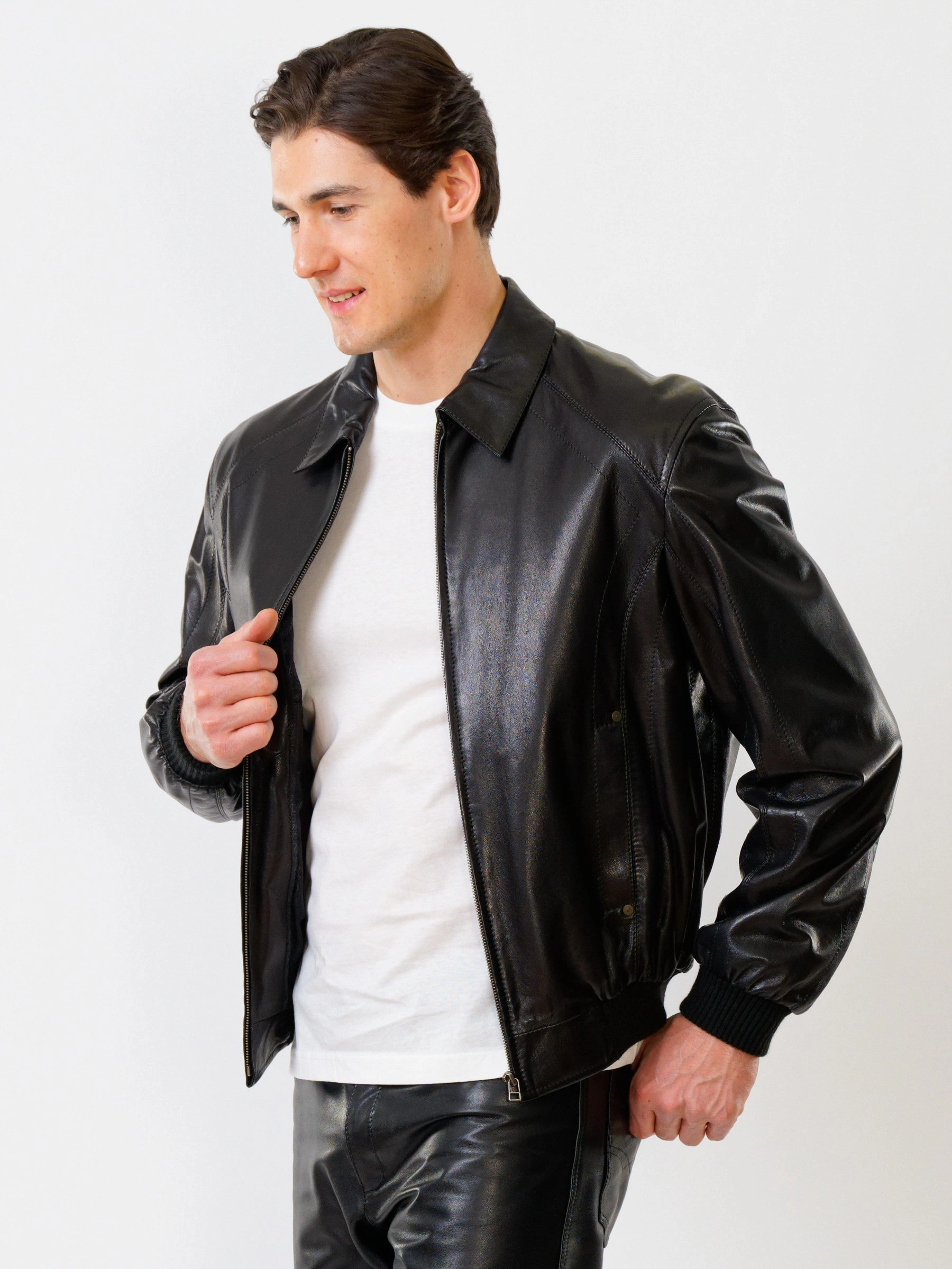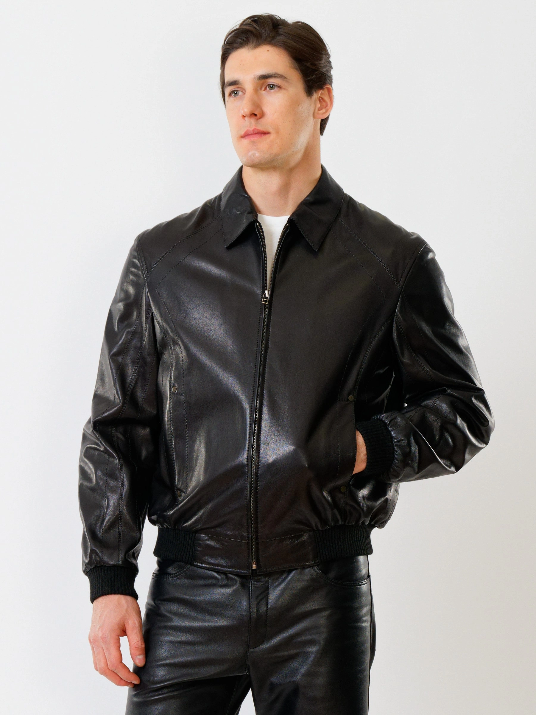 Кожаная куртка свободного покроя. Кожа премиального качества. Напульсники рукавов и низ модели из износостойкой трикотажной резинки. Внутренние карманы для документов на молниях. Великолепная свобода движений. Комфортная посадка по фигуре. Аккуратная работа наших портных.