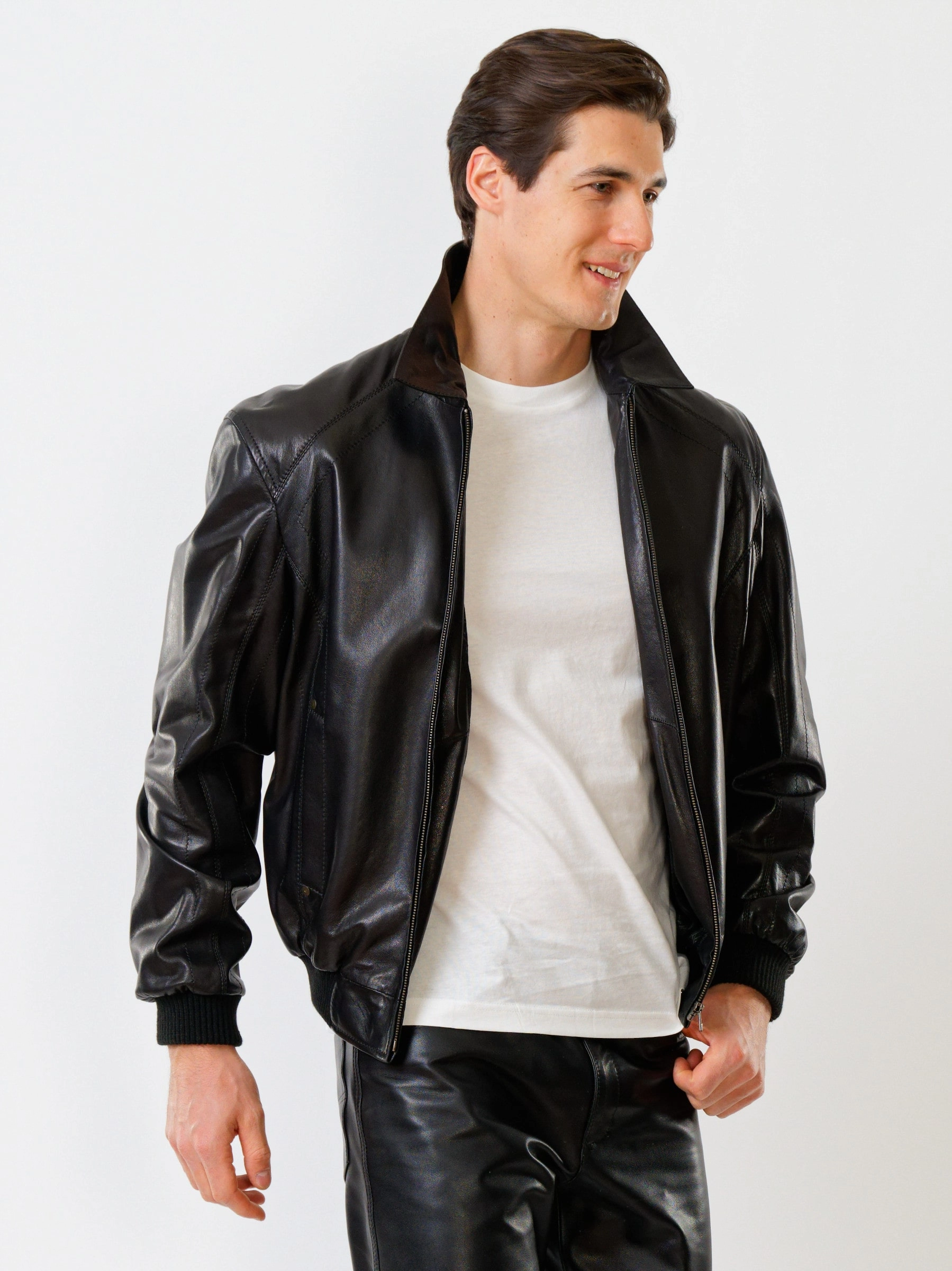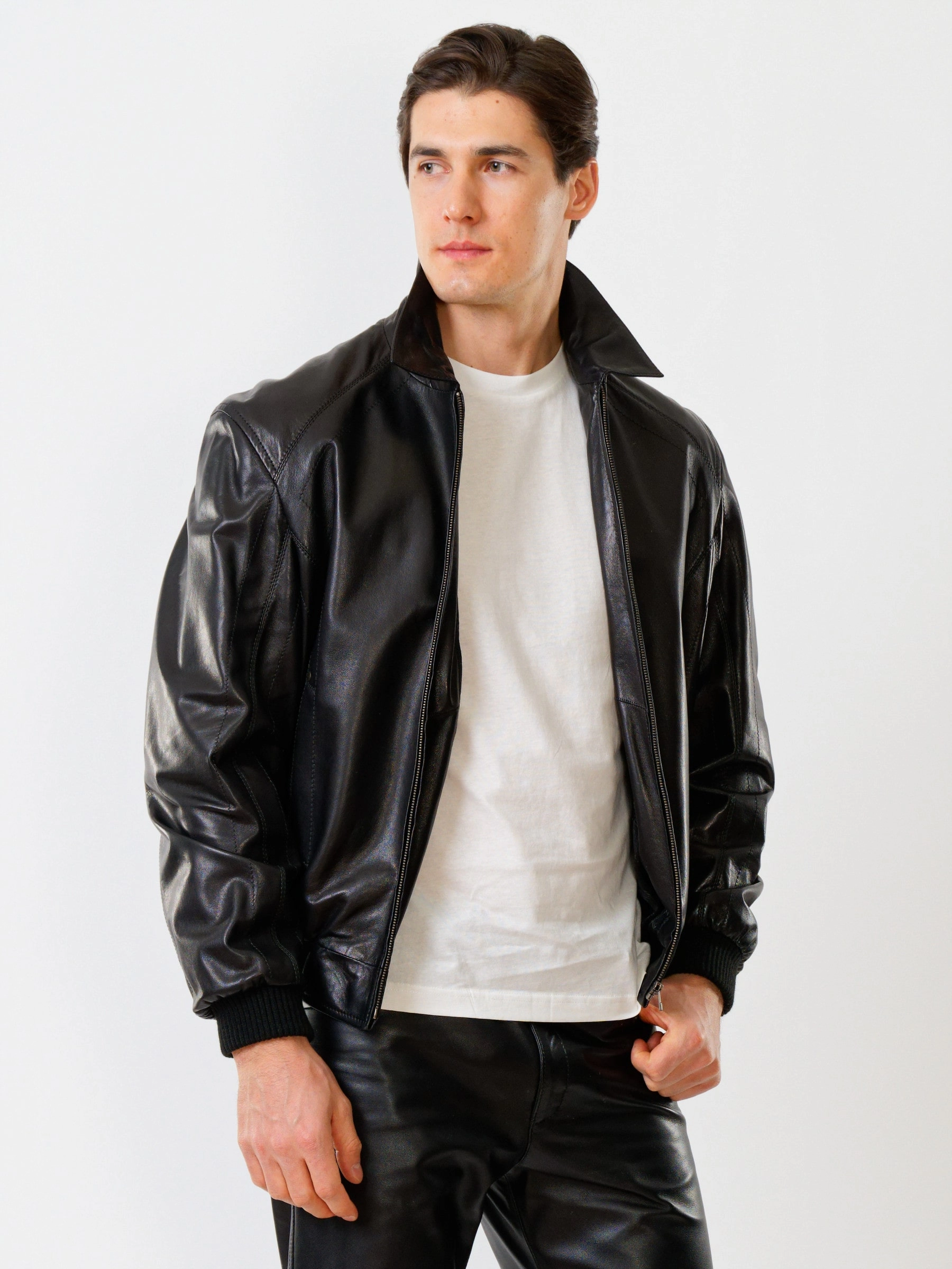 Товар мужская кожаная куртка бомбер на резинке мауро, черная, размер 44, артикул 28790 выполнен из натуральной кожи с застежкой молния. Рассчитан на сезон: весна-лето. Длина изделия 51-74 см, силуэт свободный.