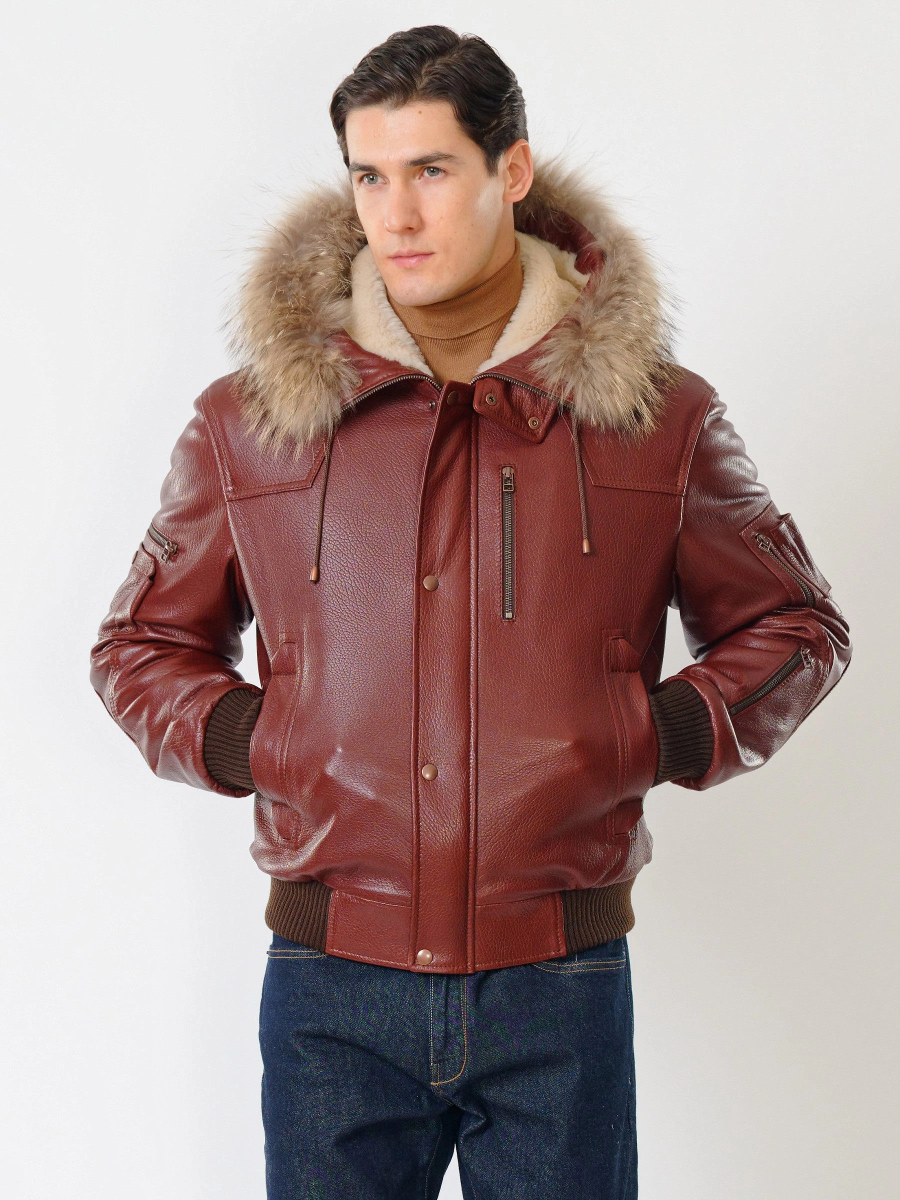 Кожаная мужская куртка аляска утепленная с мехом енота 509, виски, размер 48, артикул 40251