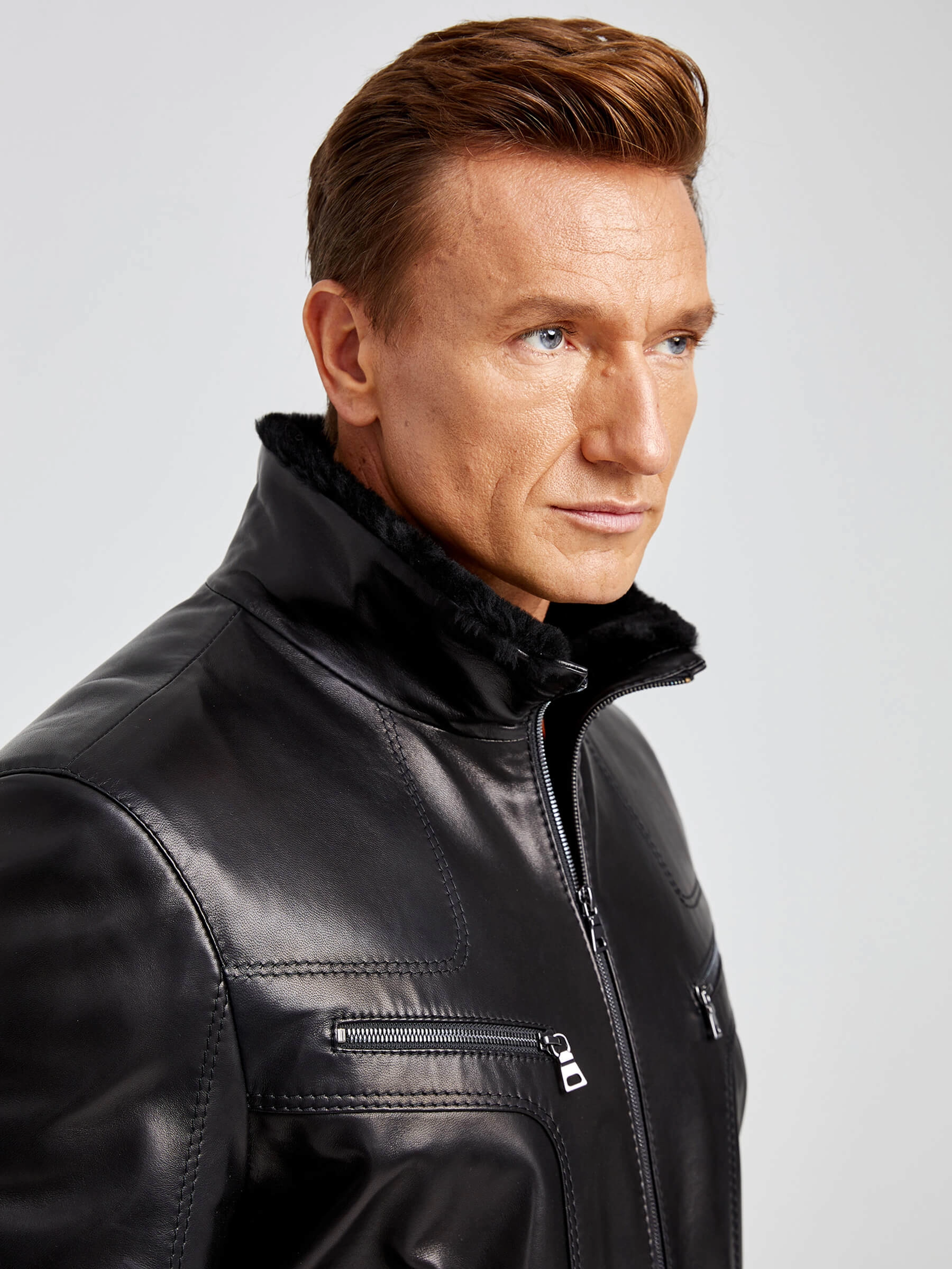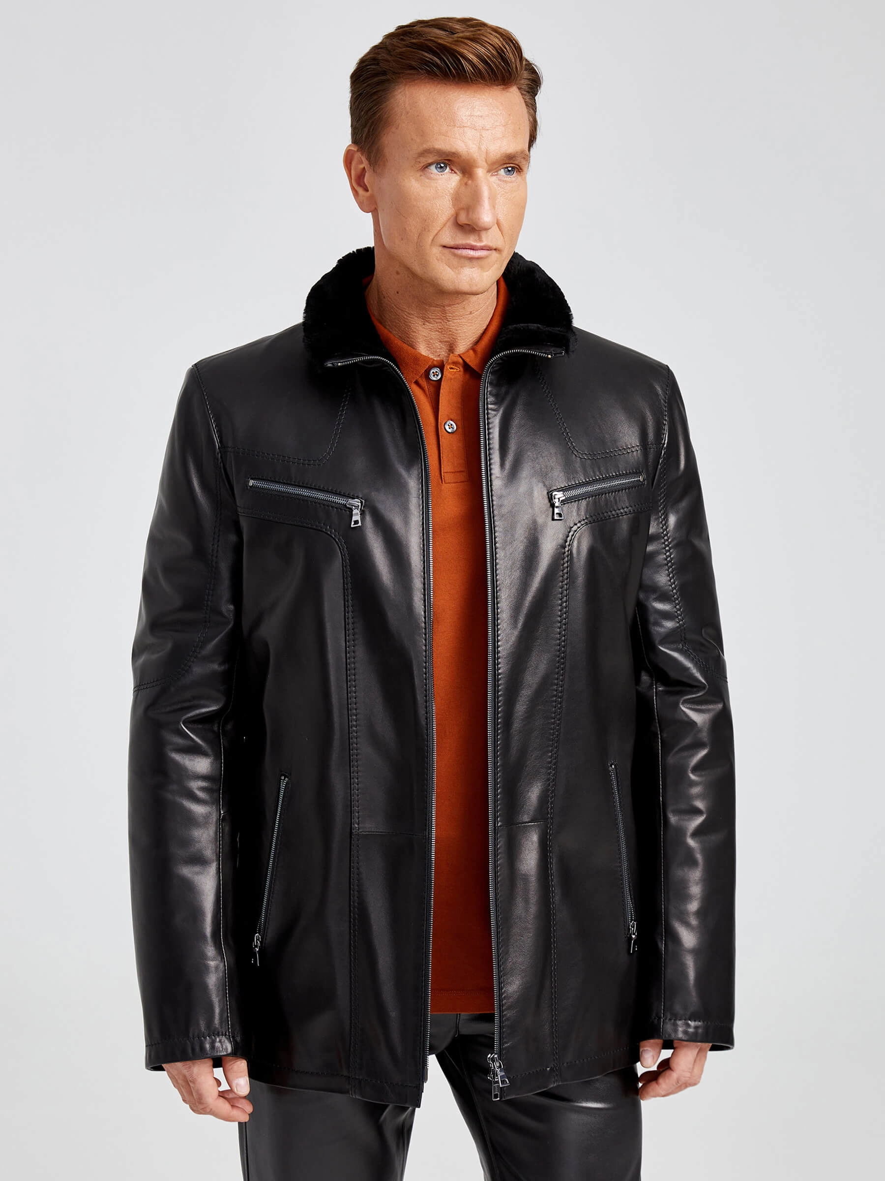 Удлиненную классическую куртка выполнили из кожи премиального качества. Меховая подкладка из тонкорунной мериносной овчины. Воротник-стойка. Удобные наружные и внутренние карманы на молниях. Прекрасная свобода движений. Четкая посадка по фигуре. Идеальная работа наших портных.