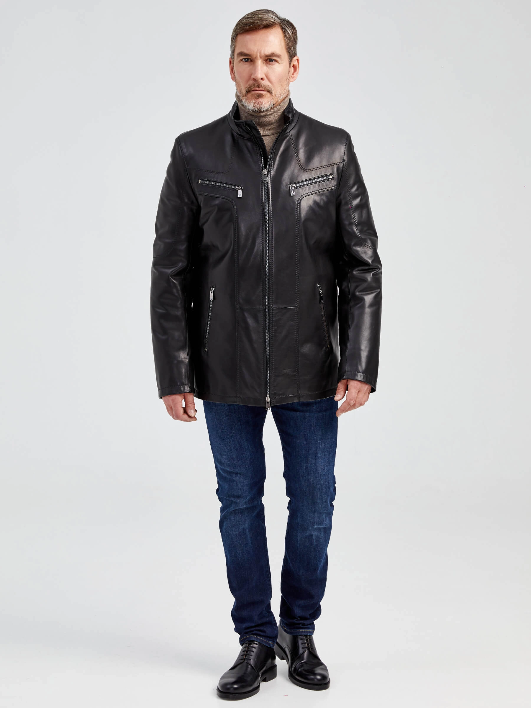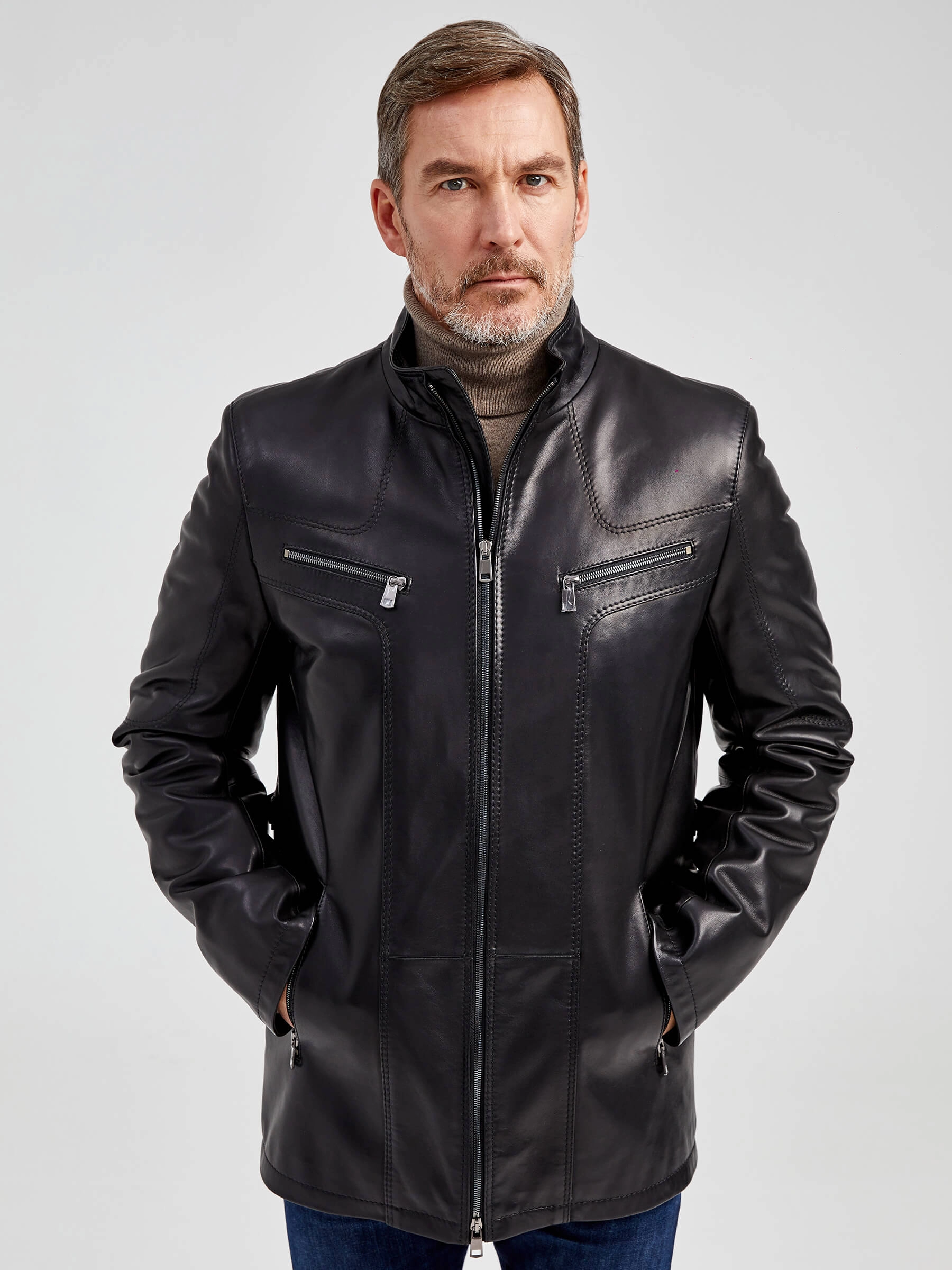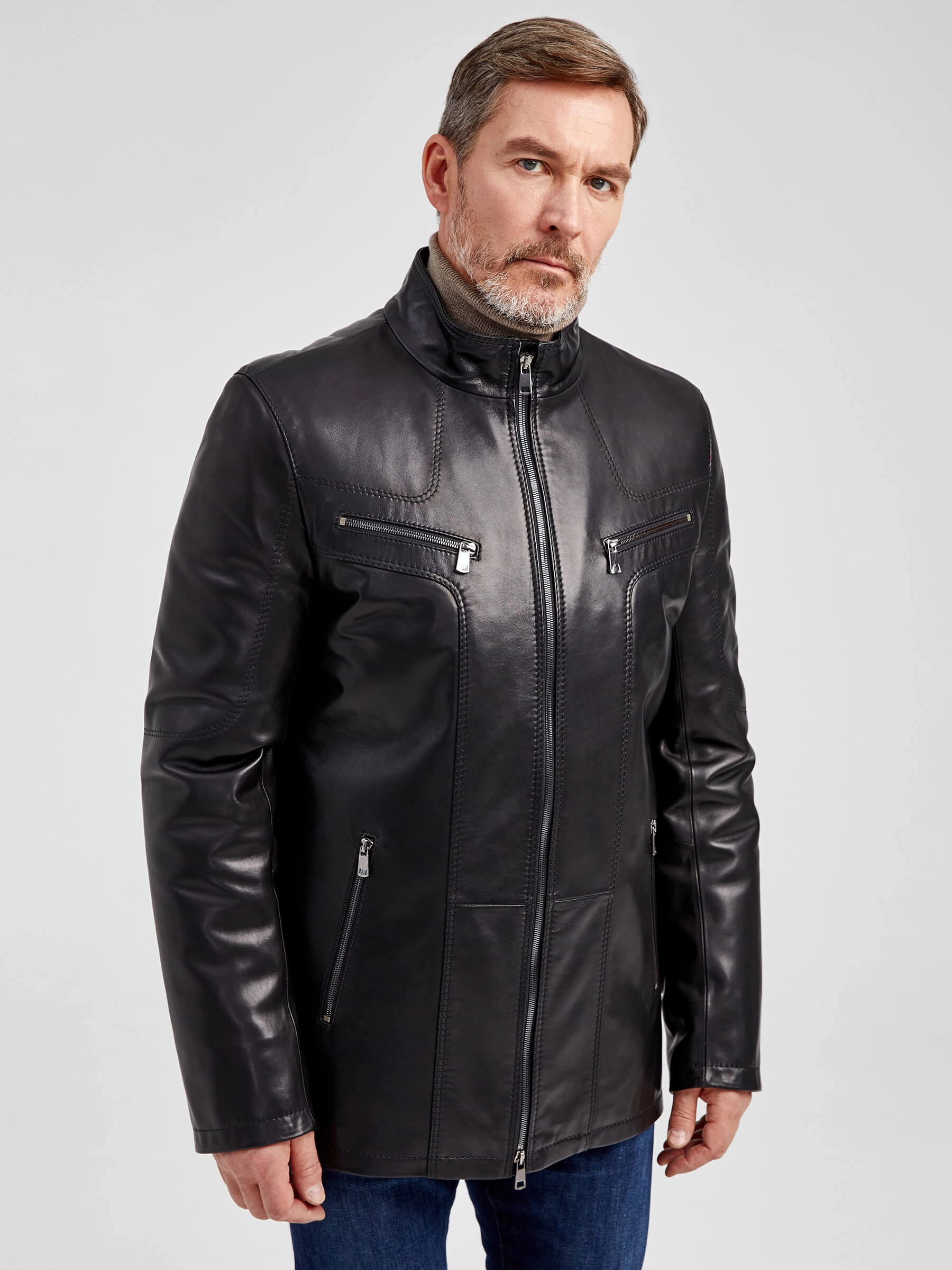 Мужская кожаная куртка. Кожа премиального качества. Воротник-стойка. Удобные наружные и внутренние карманы на молниях. Прекрасная свобода движений. Чёткая посадка по фигуре. Идеальная работа наших портных.
