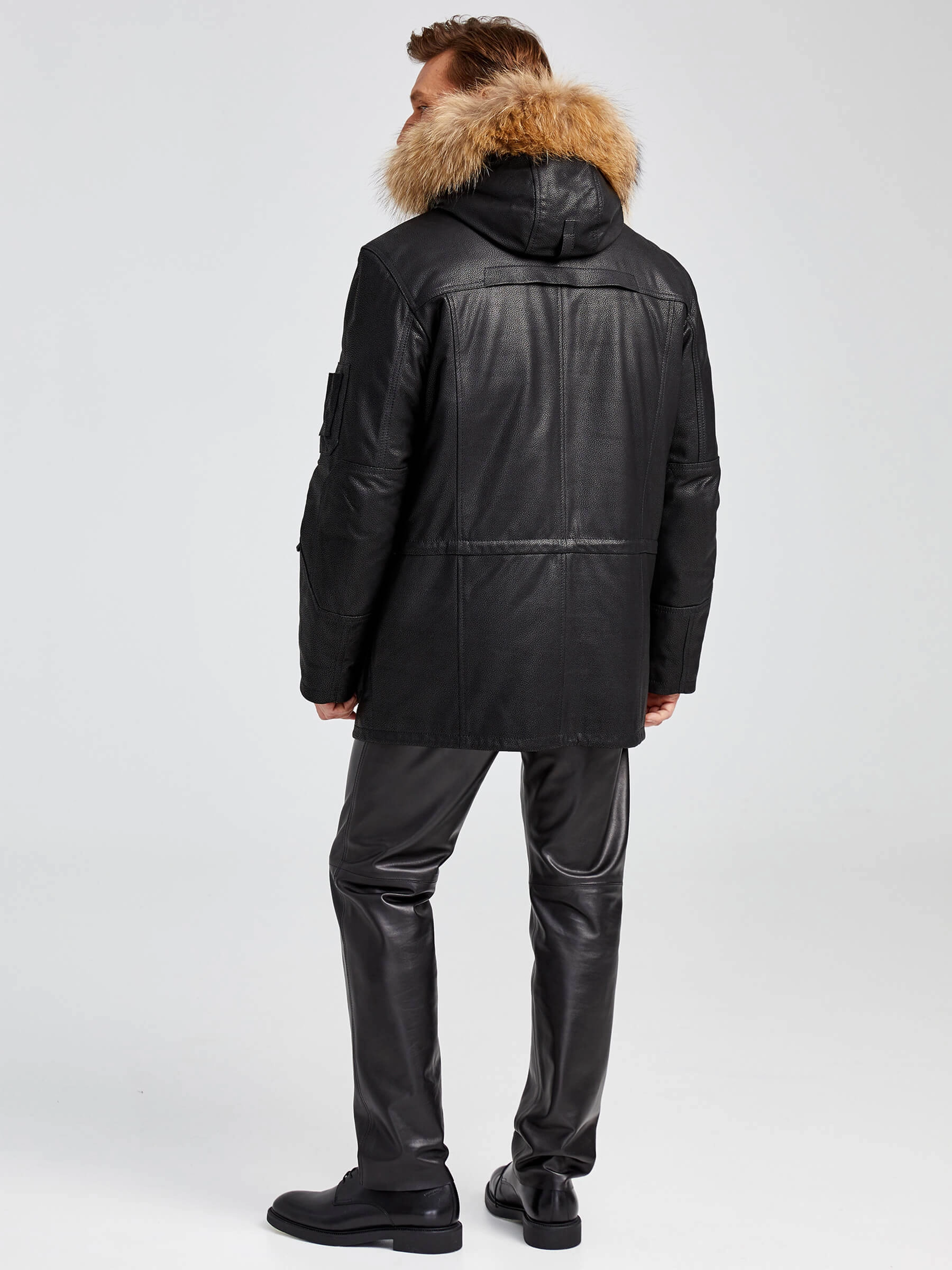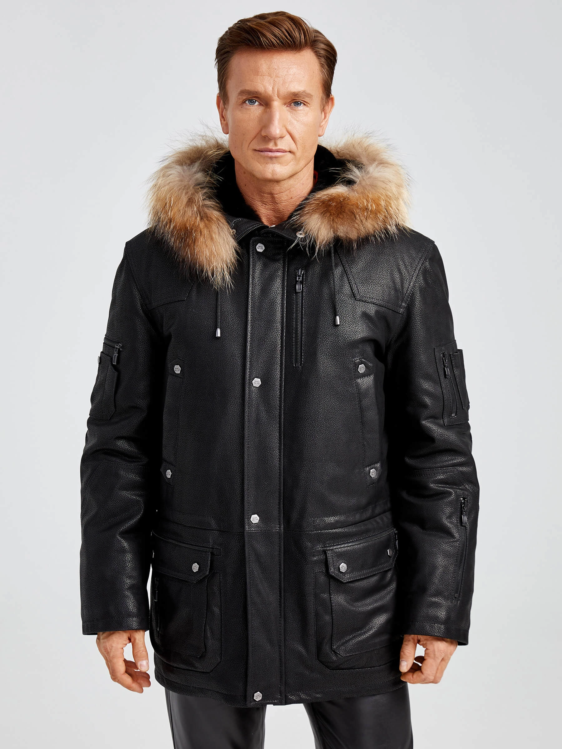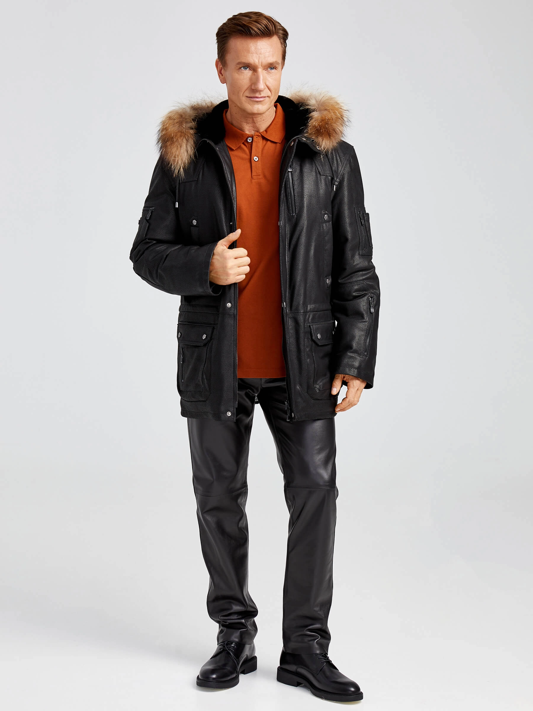 Утепленная мужская кожаная куртка аляска с мехом енота Алекс, черная DS, размер 52, артикул 40380
